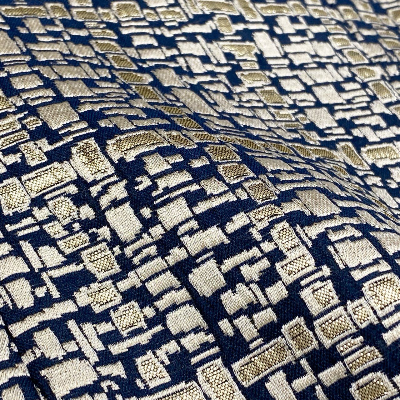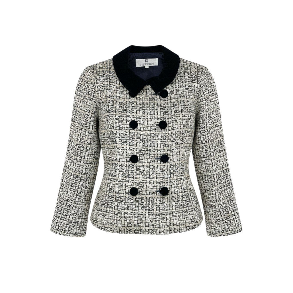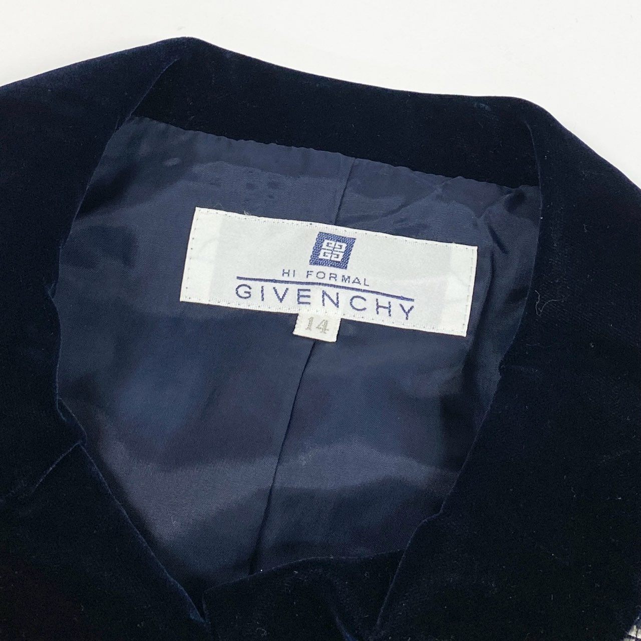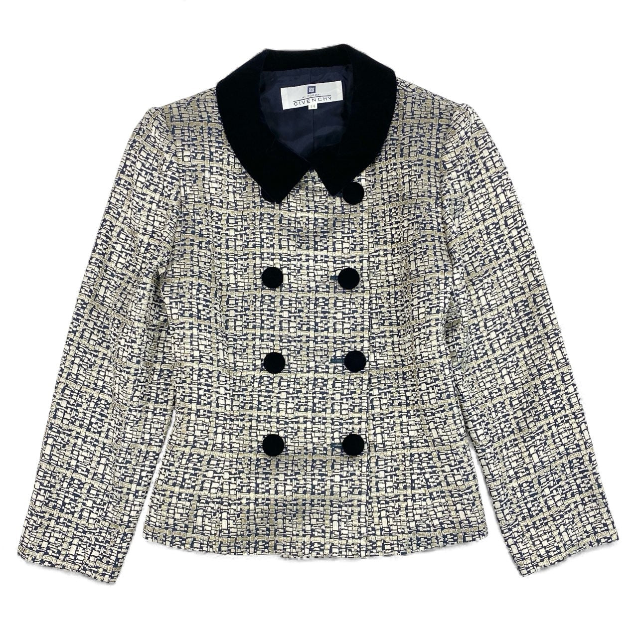 アイボリー×ネイビー系の細かな織り柄が印象的な、GIVENCHYのヴィンテージジャケットです。襟元にはブラックのベロア切替が施され、上品でクラシカルな雰囲気を演出します。マットな質感の生地に、ダブルボタンデザインが程よい存在感をプラスしています。フォーマル寄りのスタイリングからきれいめカジュアルまで幅広く活躍する一着です。