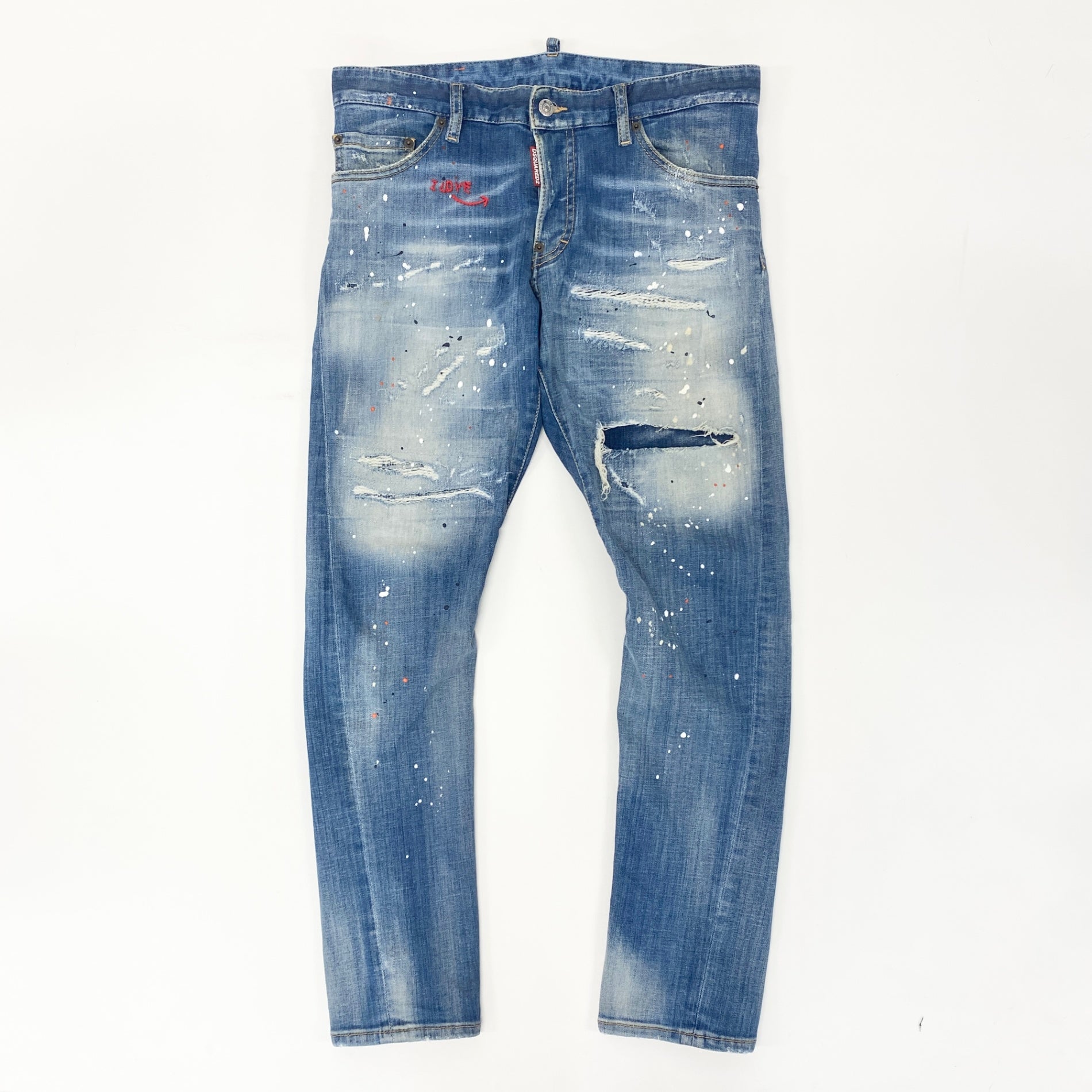 DSQUARED2「S71LB1028 S30342」ジーンズは、ライトブルーのウォッシュ加工に大胆なダメージ加工とペイント飛ばしを組み合わせたデザインが特徴です。随所にリペア風ディテールが施され、ヴィンテージ感とストリート感を融合。フロントの赤い刺繍ロゴタグがブランドらしいアクセントを加えています。カジュアルコーデにインパクトを与える一本で、都会的なデニムスタイルを楽しめるアイテムです。