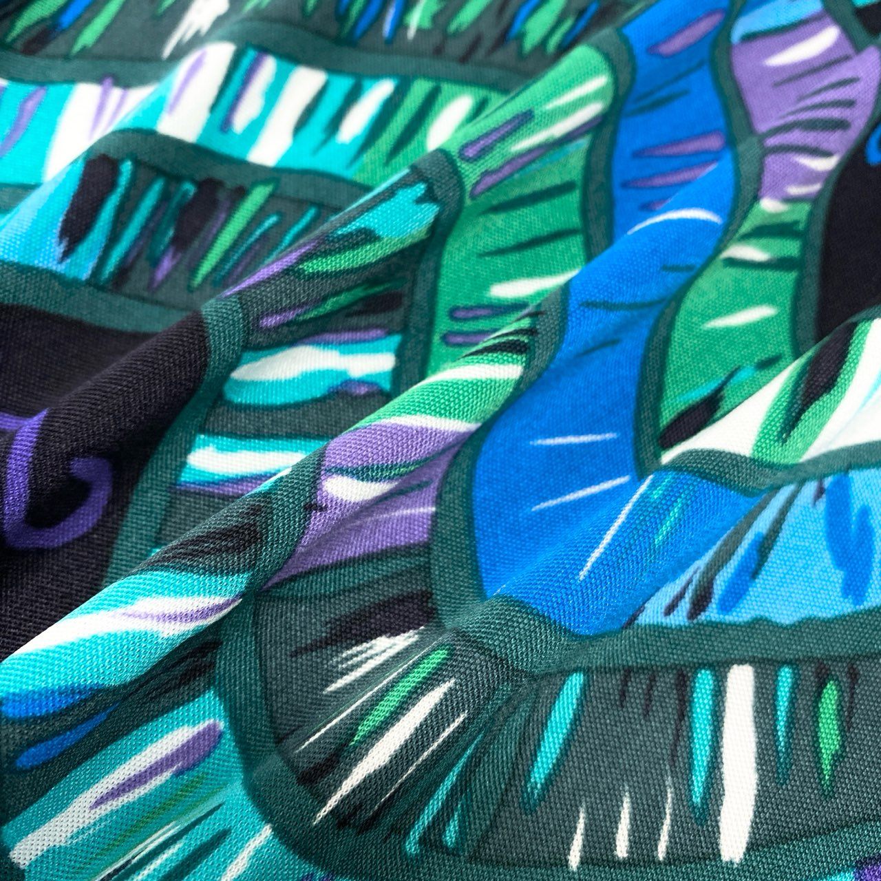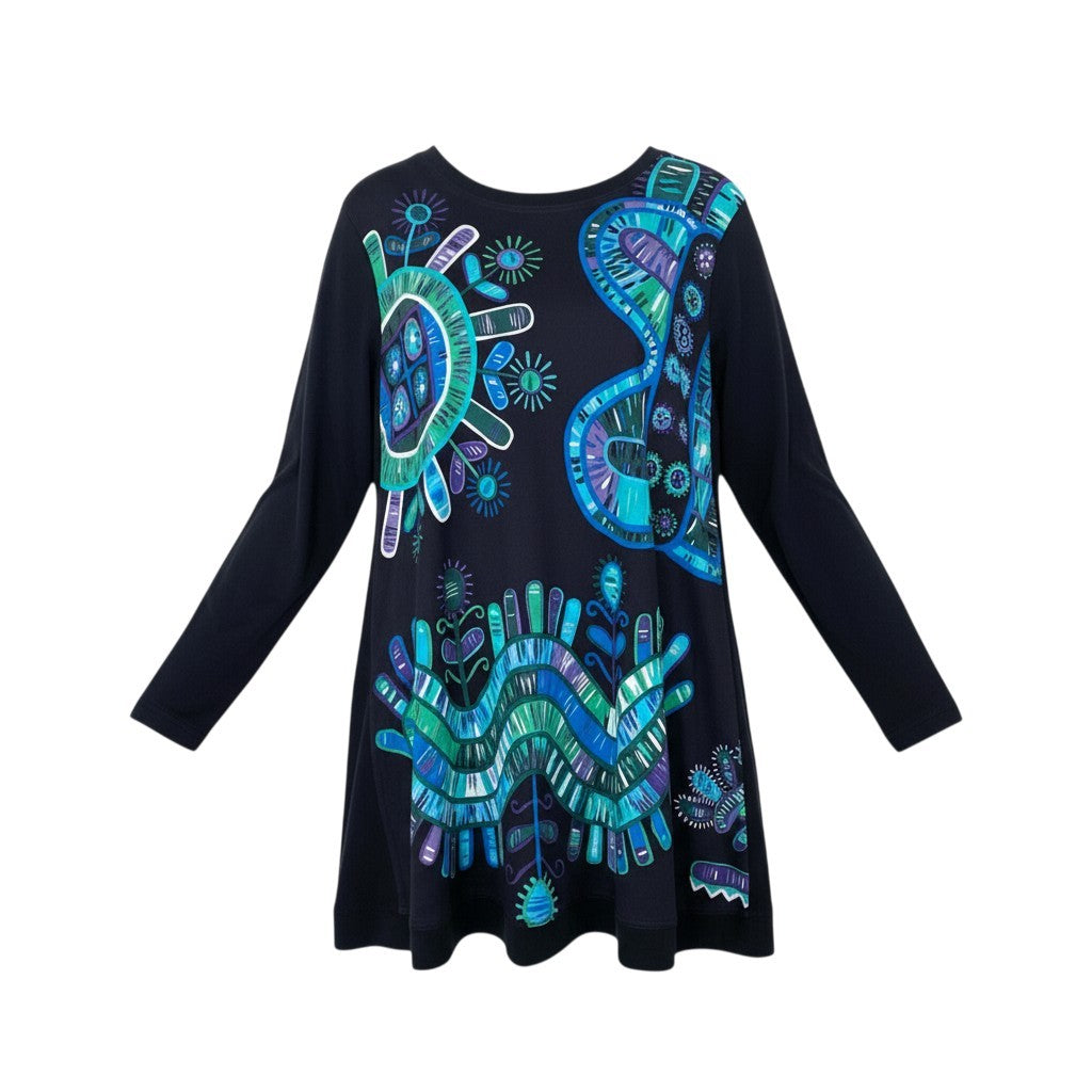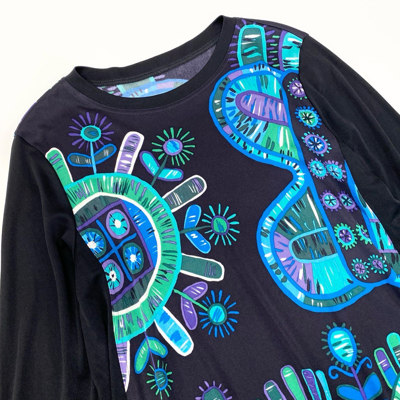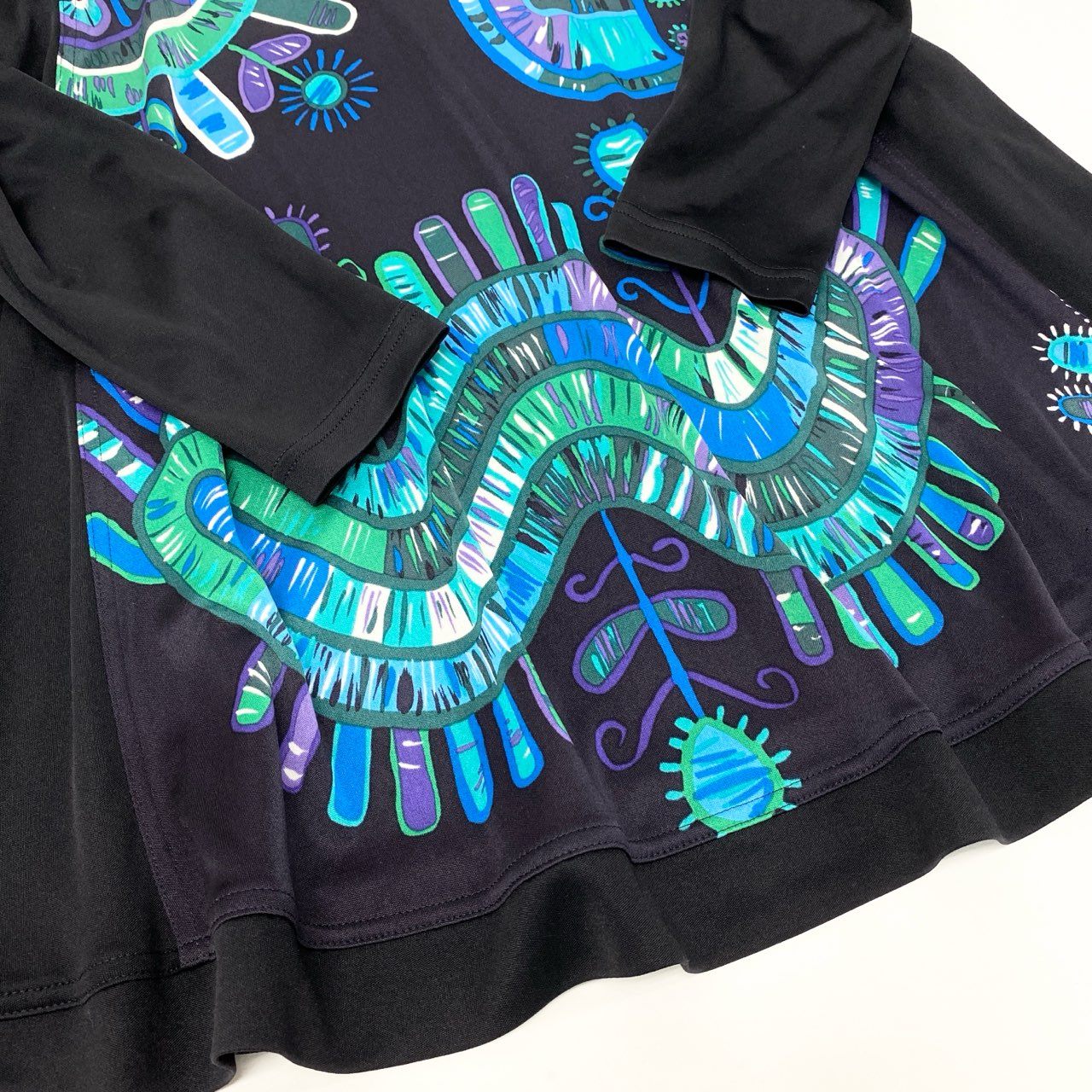 ネイビーベースに、ターコイズ・ブルー・グリーンを中心とした抽象アート柄が大胆に描かれた、TOKUKO 1er VOLらしい存在感抜群のチュニックワンピースです。さらりとしたトリアセテート素材で軽やかに揺れ、Aラインに広がるシルエットが自然に体型をカバー。色彩豊かなモチーフが目を惹き、1枚で主役級のスタイルが完成します。レギンスや細身パンツとの相性も良く、デイリーにもイベントにも万能な一着です。