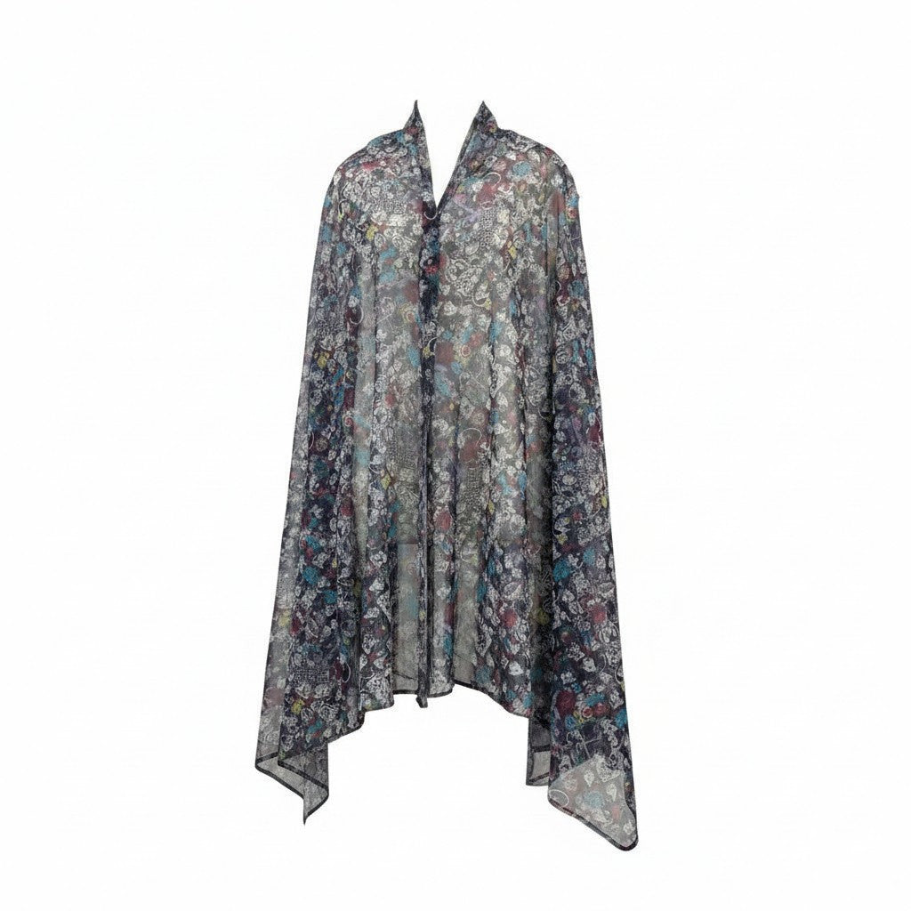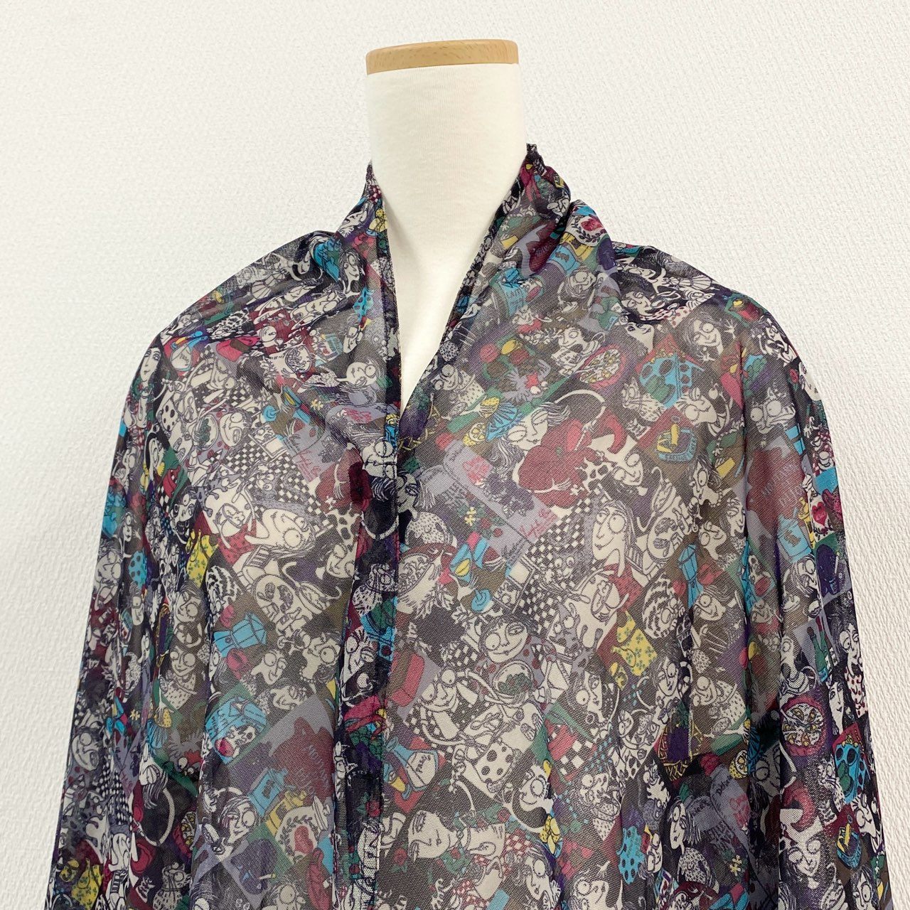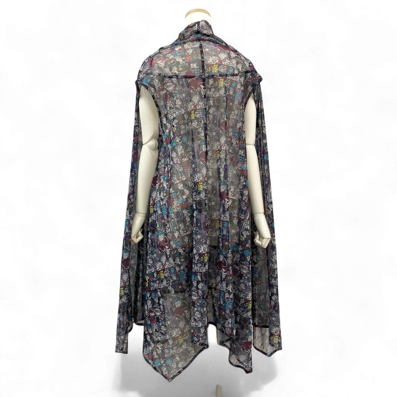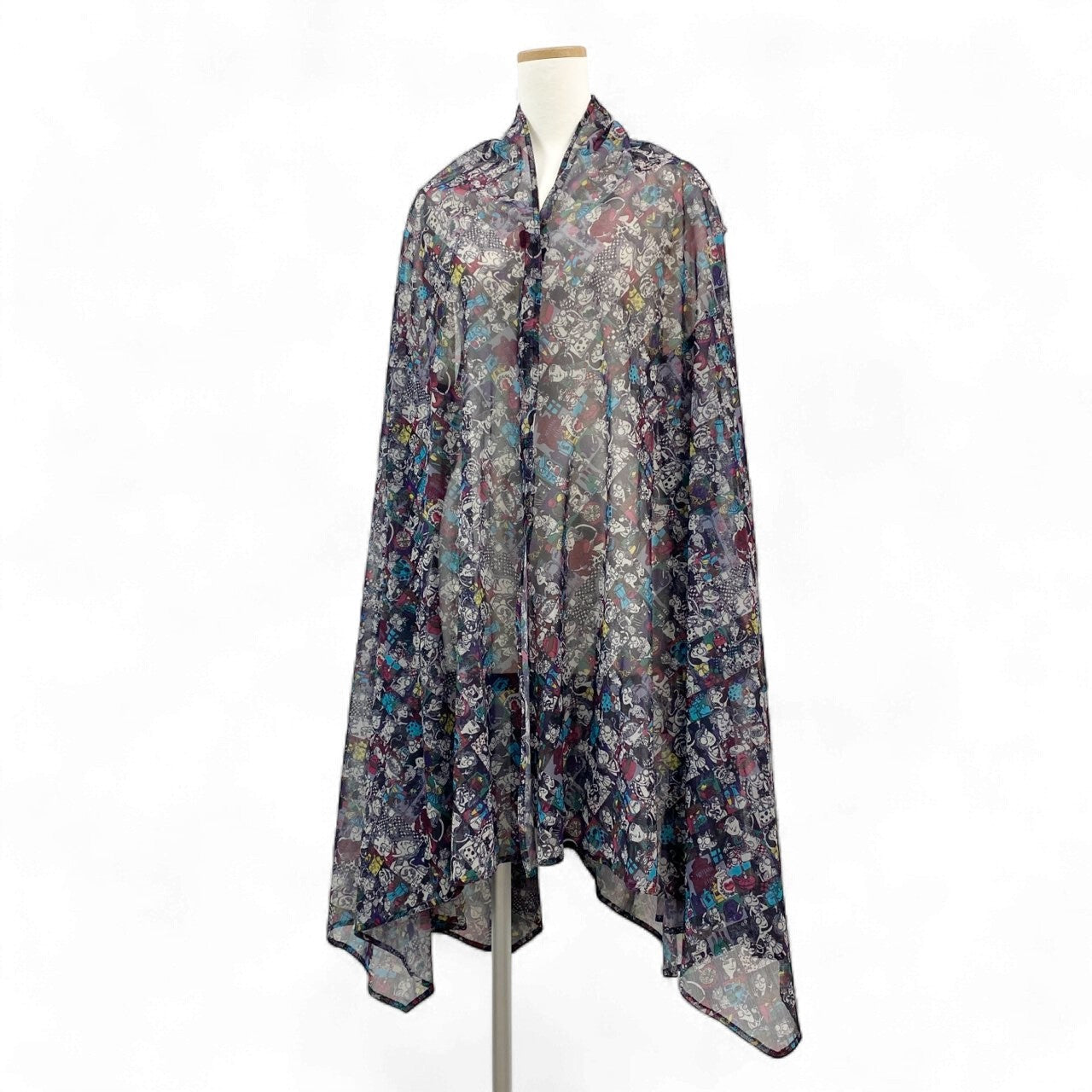 チャコールグレーをベースに、マルチカラーの繊細な総柄をあしらった、TOKUKO 1er VOL らしいアート性の高いシフォンロングワンピースです。極薄のシフォン素材がふわりと揺れ、ケープのように広がる優雅なシルエットが特徴。軽やかな透け感がスタイリングに抜け感を与え、アシンメトリーな裾ラインが動くたびに美しい表情を作ります。タウンユースから旅行、お出かけシーンまで、羽織りとしてもワンピースとしても楽しめる万能アイテムです。