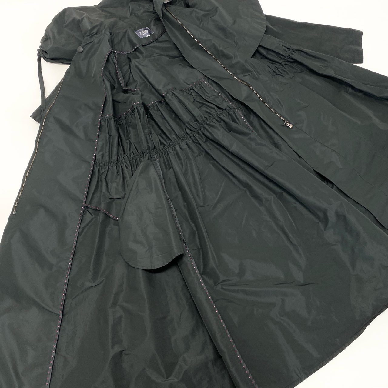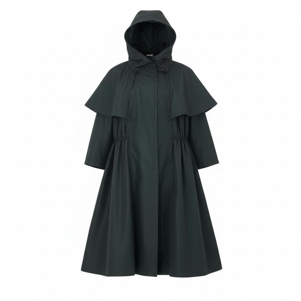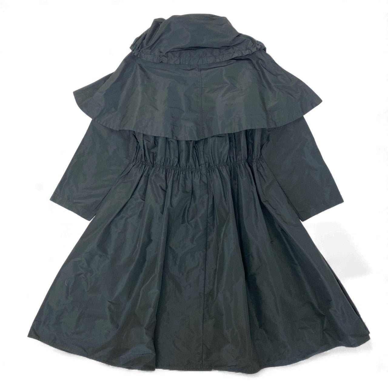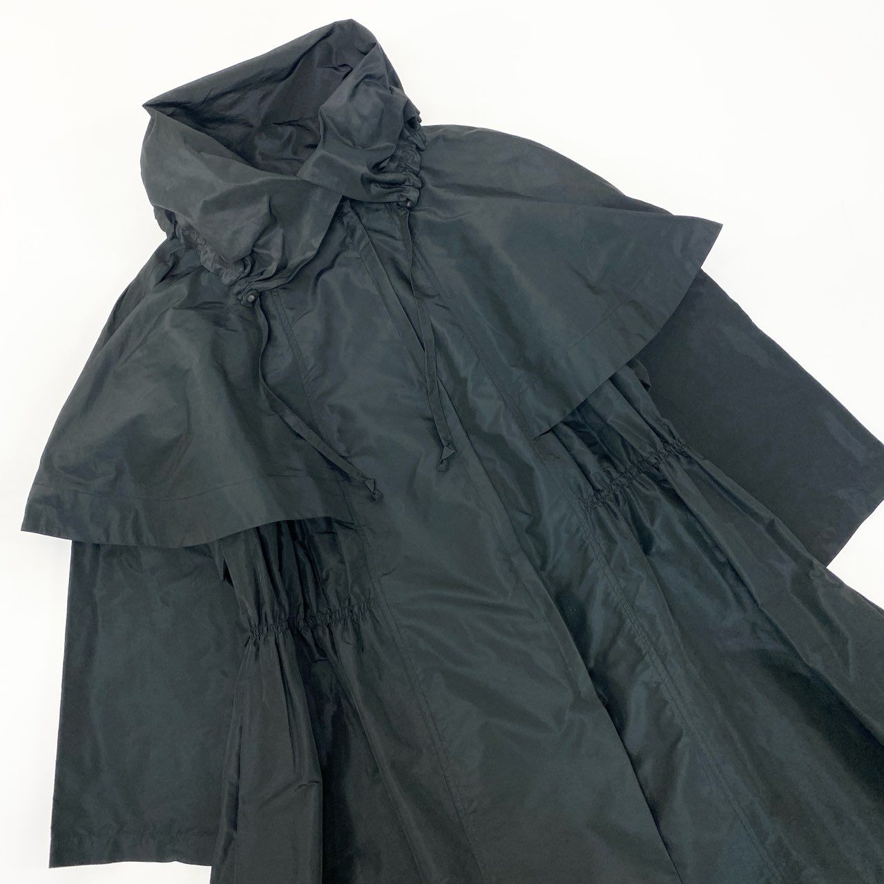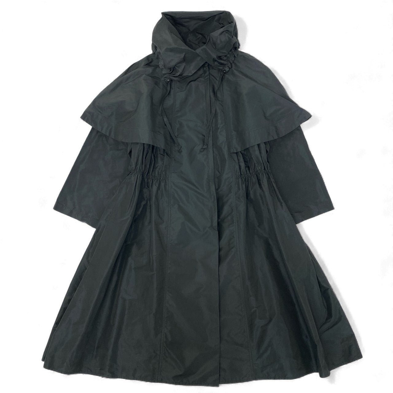 深みのあるチャコールブラックが上品な、TOKUKO 1er VOLらしいデザイン性の高いロングコートです。軽く光沢のあるナイロンタフタ素材が使用され、ハリ感のある立体的なシルエットをキープ。大きなフード一体型のケープデザインが存在感を放ち、華やかなボリューム感を演出します。ウエストのギャザーがメリハリを出し、ふわりと広がるAラインが体型カバーにも効果的。普段使いからステージ衣装・旅行シーンまで幅広く活躍する一着です。
