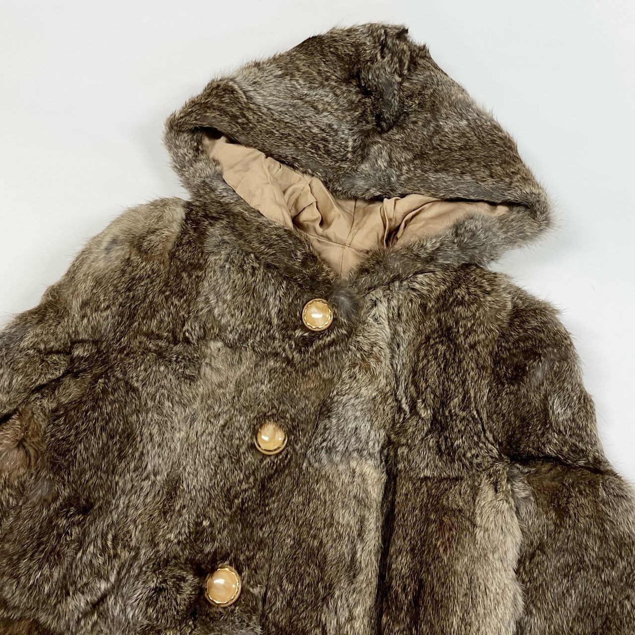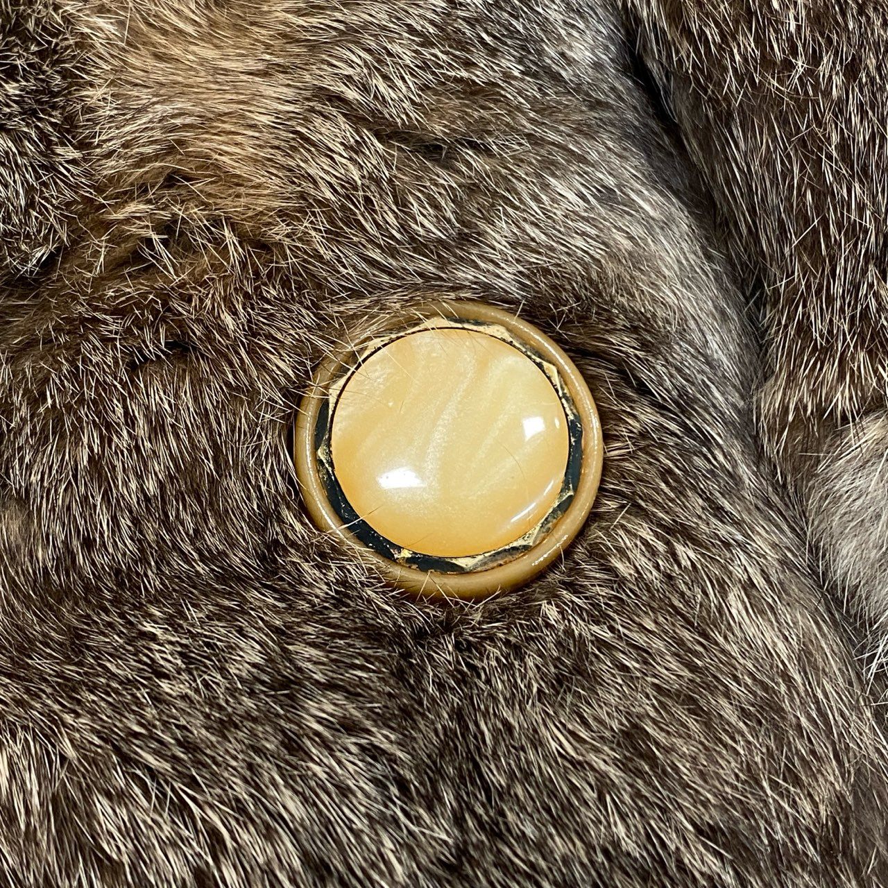 深みのあるベージュブラウンのラビットファーを使用したロングコート。毛足のあるふんわりとした質感が特徴で、自然なツヤと陰影が高級感を引き立てます。金調のメタルボタンがアクセントになり、エレガントな印象を演出。軽やかなのに暖かく、冬のフォーマルシーンやお出かけにも最適な一着です。