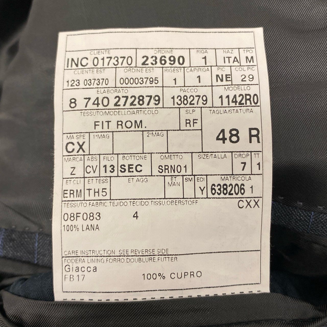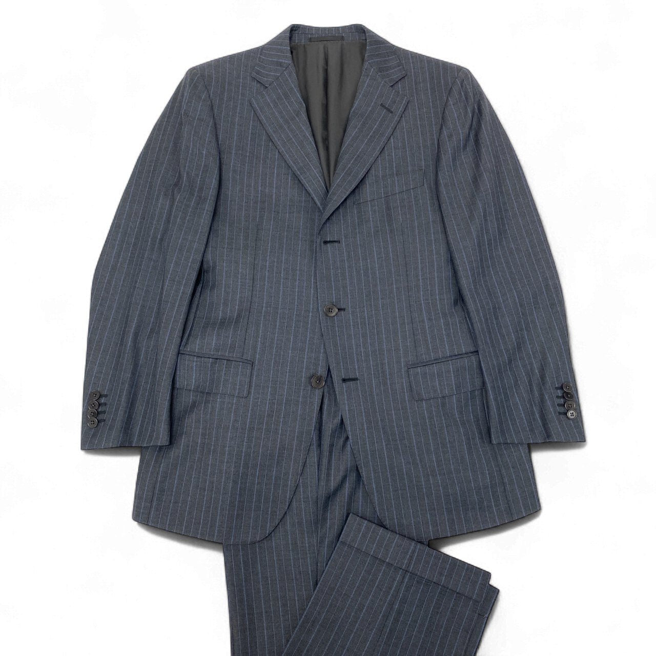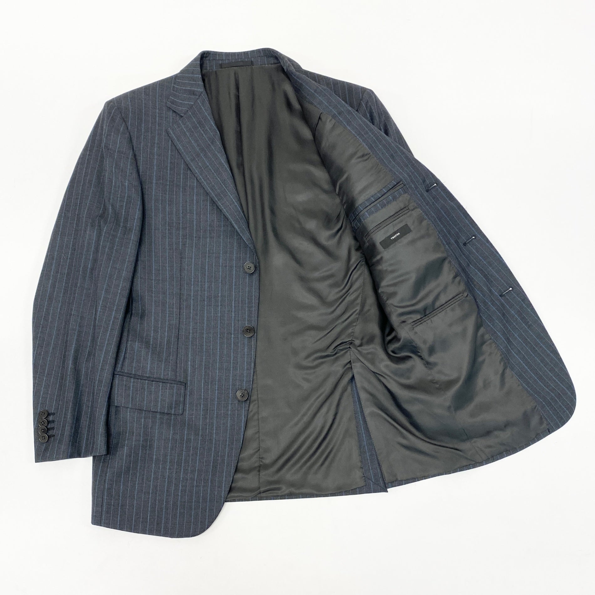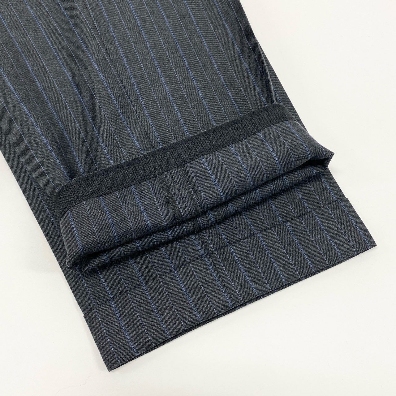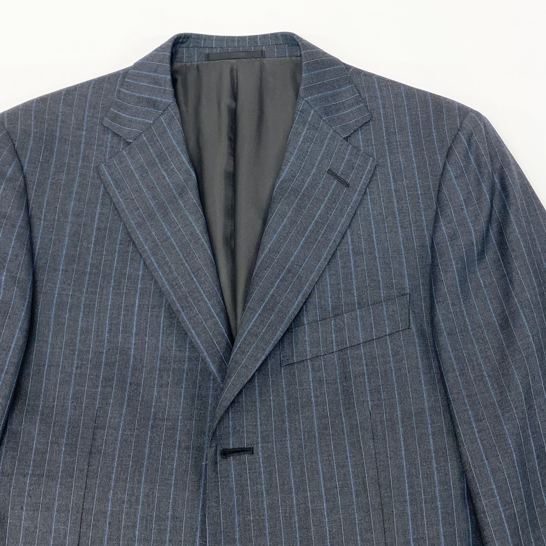 カラーは「チャコールグレー」をベースに、細かな「ライトブルー系のピンストライプ」が入った上品で知的な印象のセットアップです。生地は上質なウール特有のしなやかでスムースな質感で、Zegnaらしい品格のある落ち着いた光沢が感じられます。ジャケットはクラシックなノッチドラペルにフラップポケット、パンツはすっきりとしたストレートシルエットで、普遍的で長く愛用できるデザインです。ビジネスシーンはもちろん、結婚式・会食・式典など、きちんと感が求められる場面にも最適な一着です。