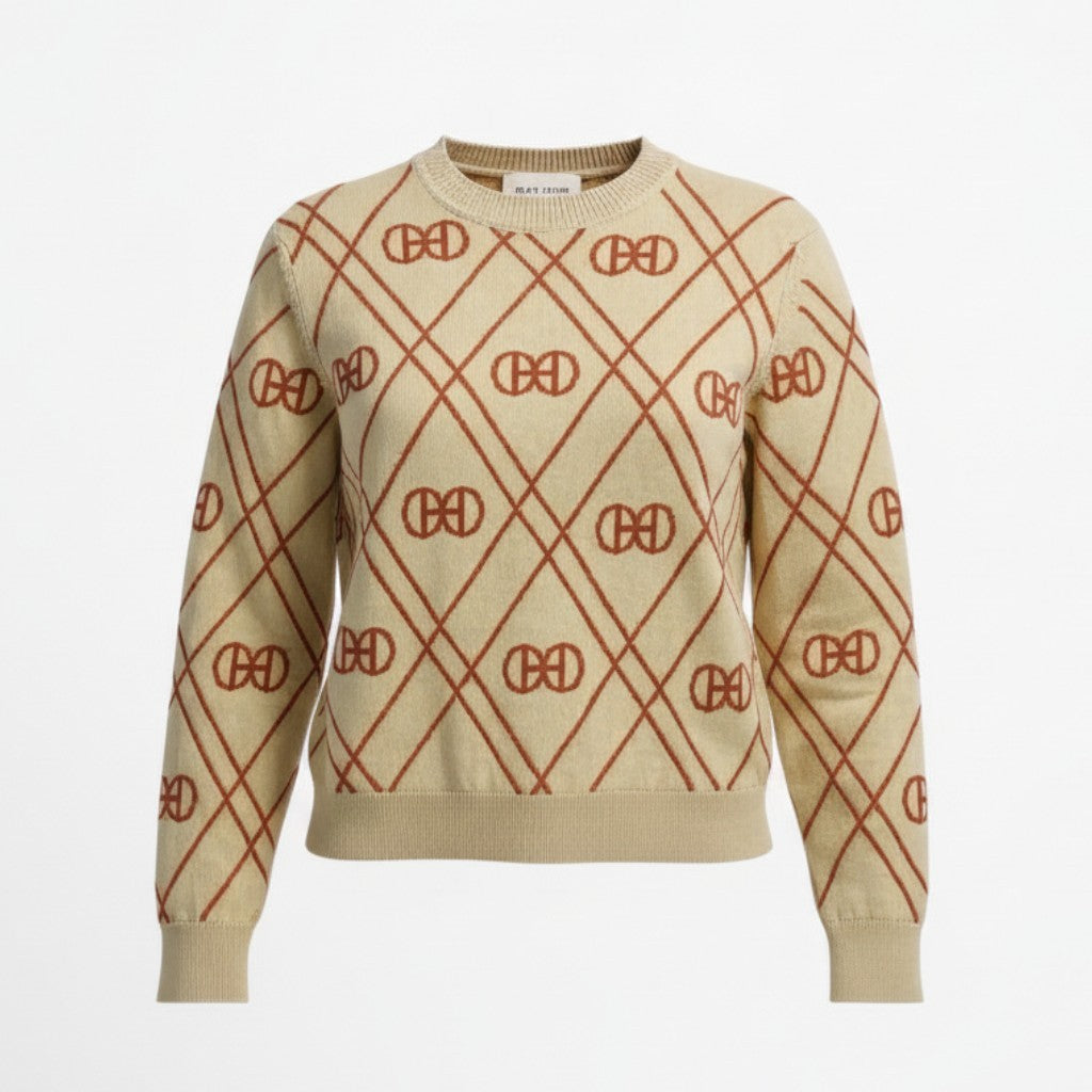 エルメスのアイコンモチーフを取り入れた「Hロンド」ニットセーター。 上品なベージュカラーに、Hモチーフを配したダイヤ調の総柄パターンが洗練された印象を与えます。 **カシミア100%**ならではの滑らかな肌触りと軽い着心地が魅力。 一枚で主役になるのはもちろん、ジャケットやコートのインナーとしても映える、長く愛用できる上質な一着です。