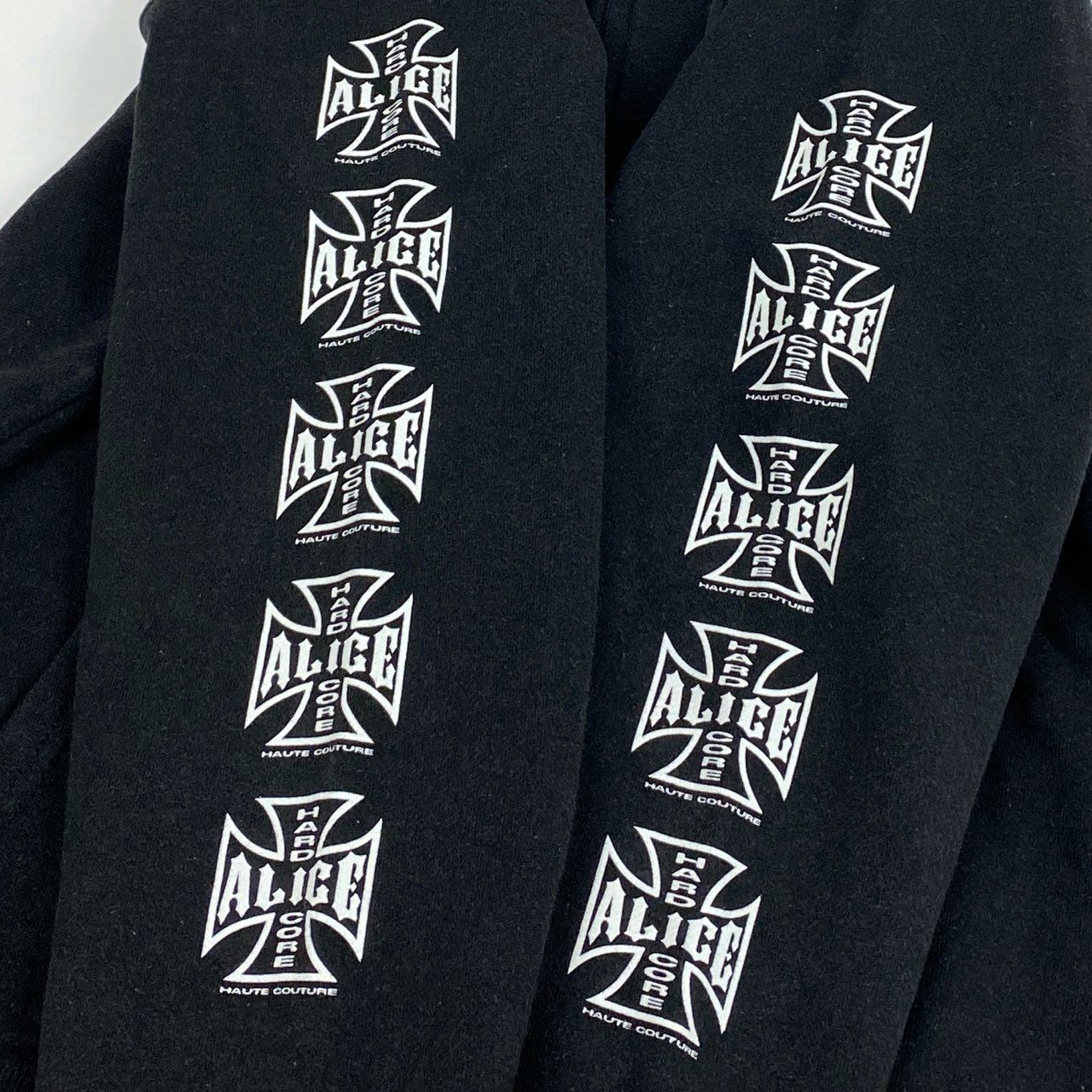 ブラックカラーのフルジップフーディーで、コットン100%のマットでしっかりしたスウェット素材が特徴です。胸元と両袖に配されたクロスモチーフ×ロゴプリントが存在感を放ち、ストリートやバイカーテイストを強く感じさせるデザイン。フード付き&ダブルジップ仕様で、着こなしのアレンジ幅も広い一着です。デニムやワイドパンツと相性が良く、デイリーユースからストリートスタイルの主役として活躍します。