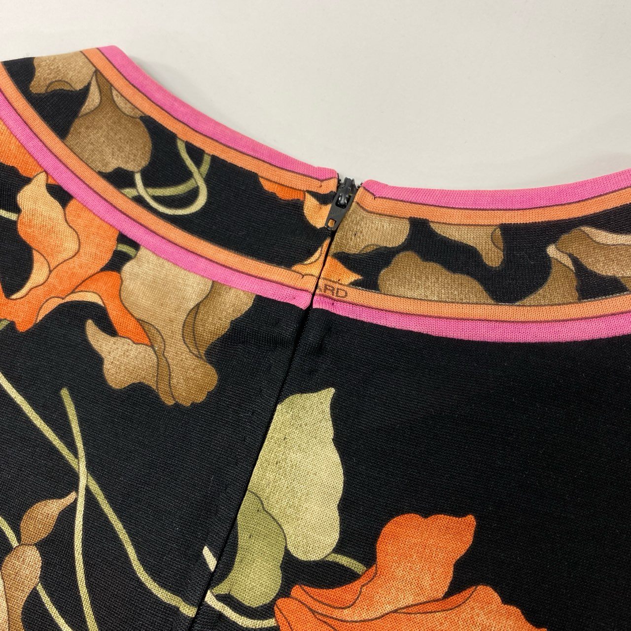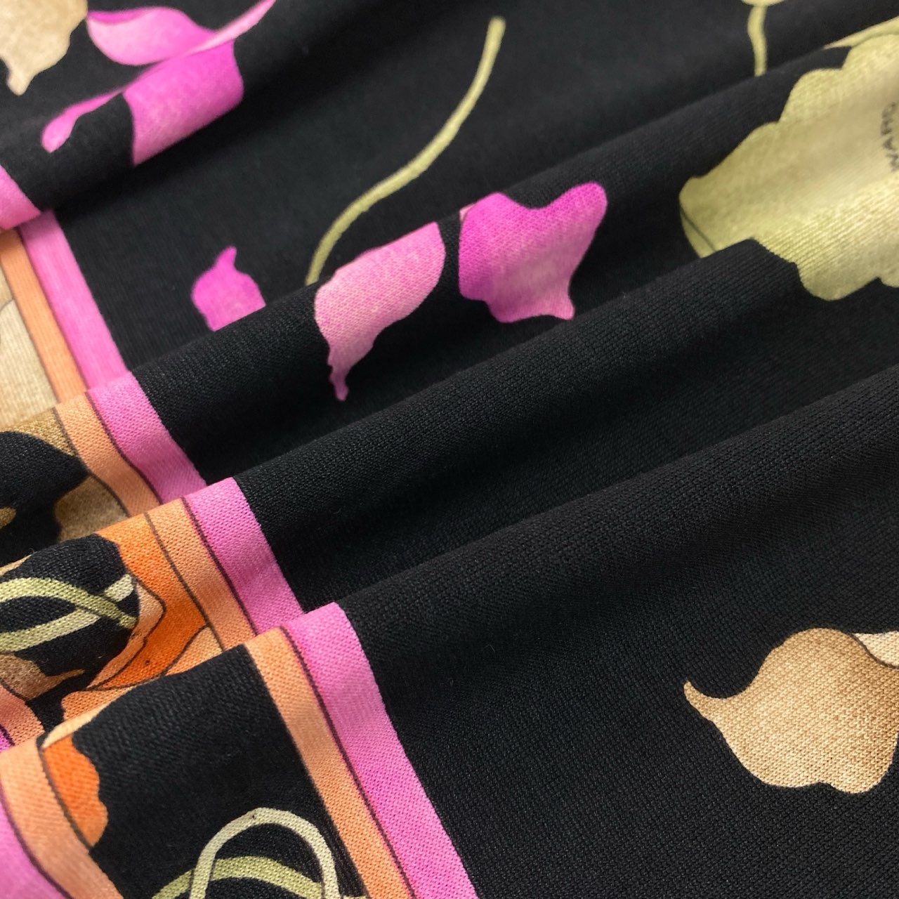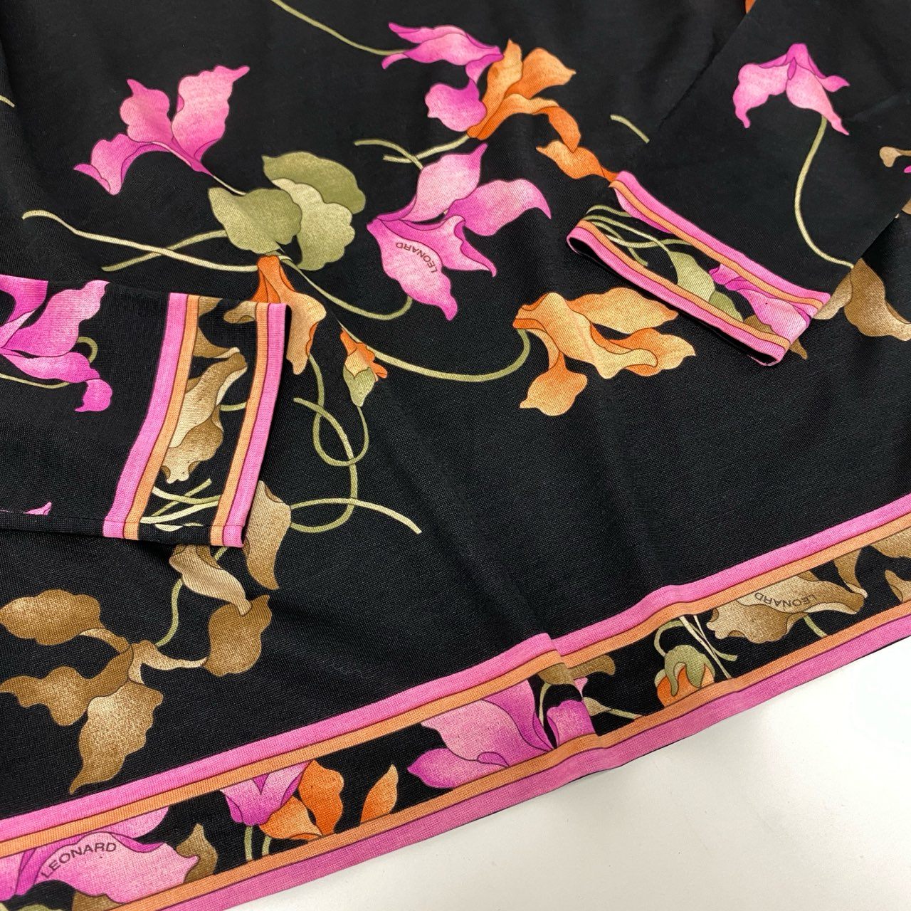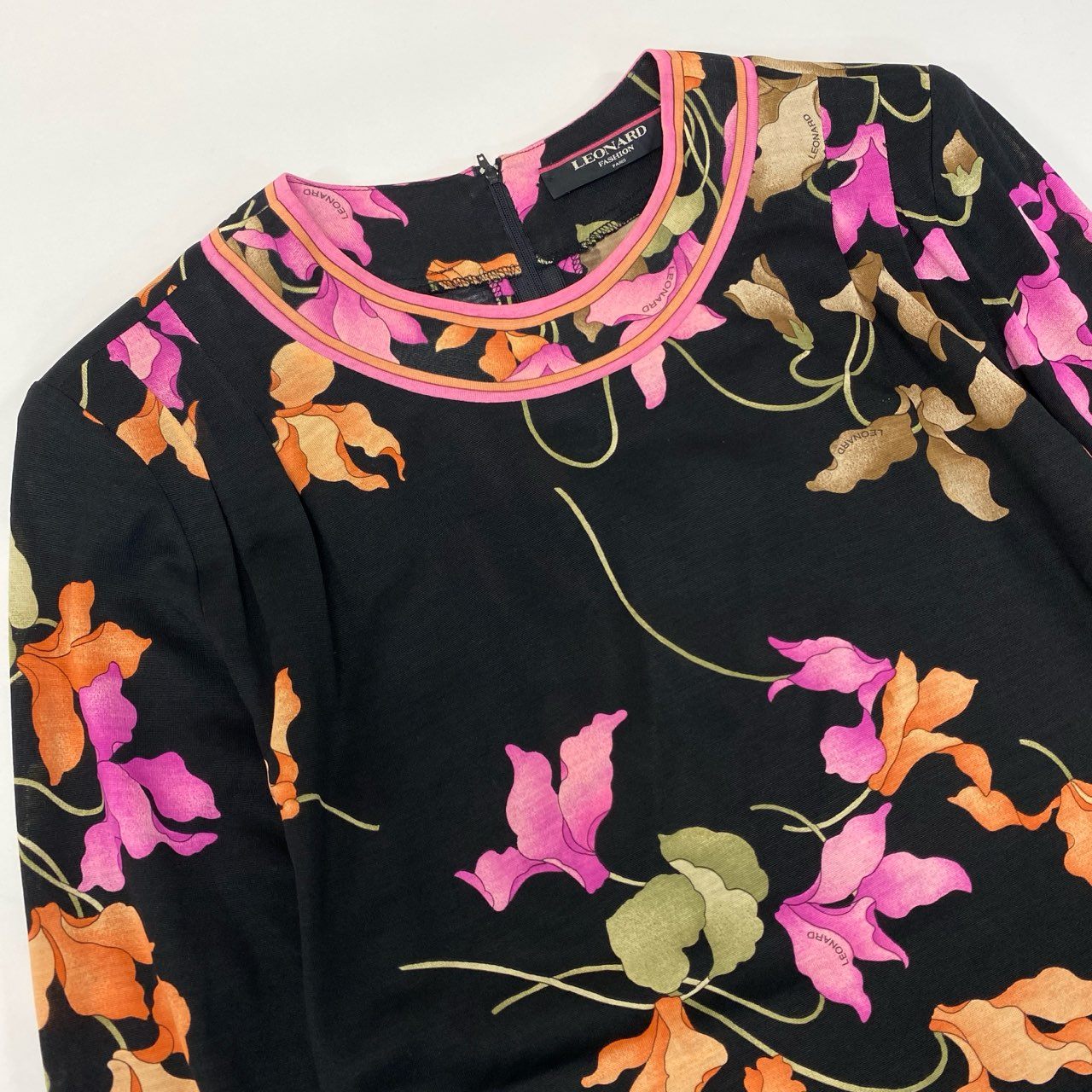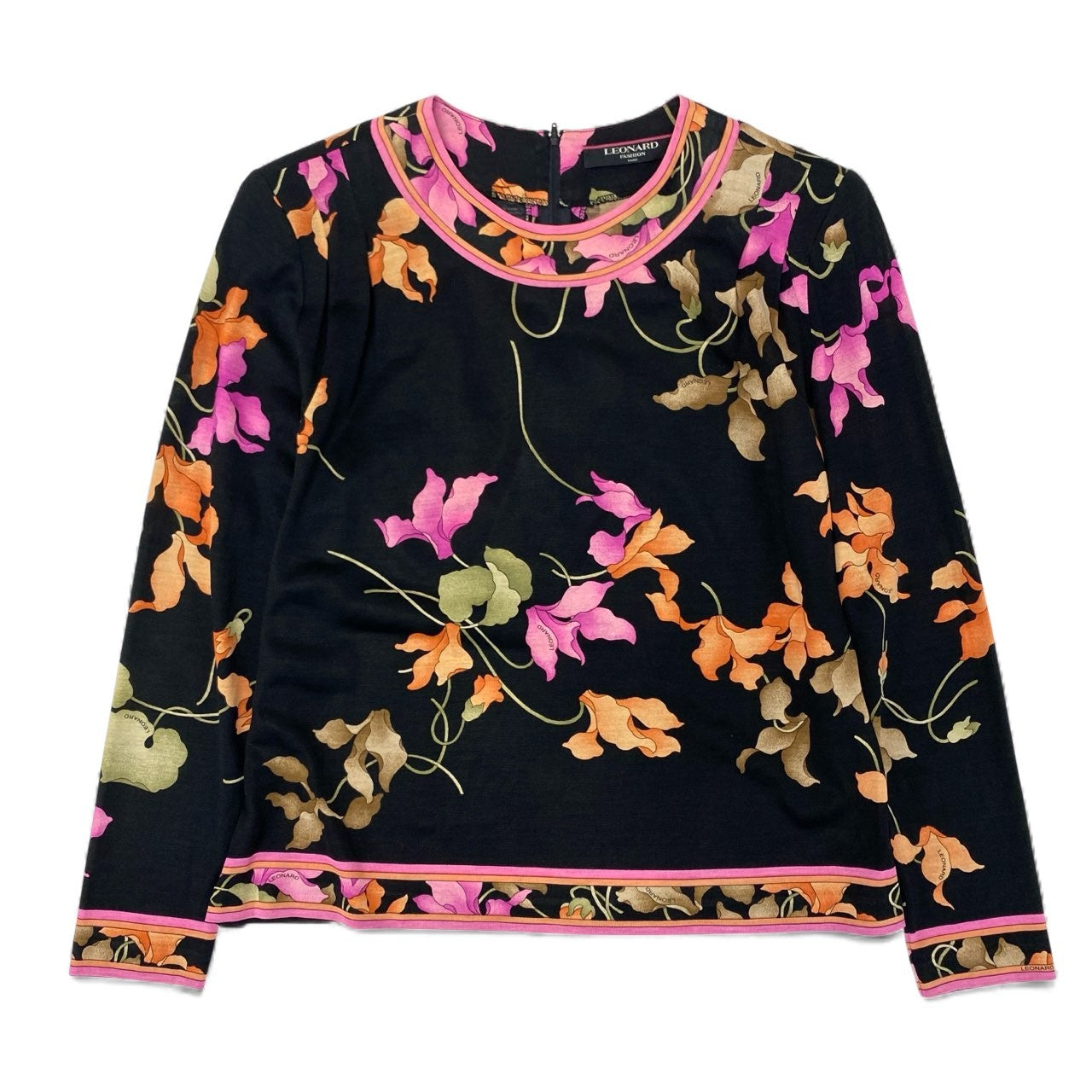 LEONARD(レオナール)の長袖カットソーです。ブラックをベースに、ピンクとオレンジの花柄が鮮やかに映える華やかな一枚。ブランド特有の滑らかで軽いジャージー素材は、着心地が快適でシワになりにくく、旅行や外出時にも扱いやすい点が魅力です。裾やネック周りのパイピングが全体を上品にまとめ、一枚でコーデの主役になるデザインです。デイリーからお食事会・お出かけシーンまで幅広く活躍します。