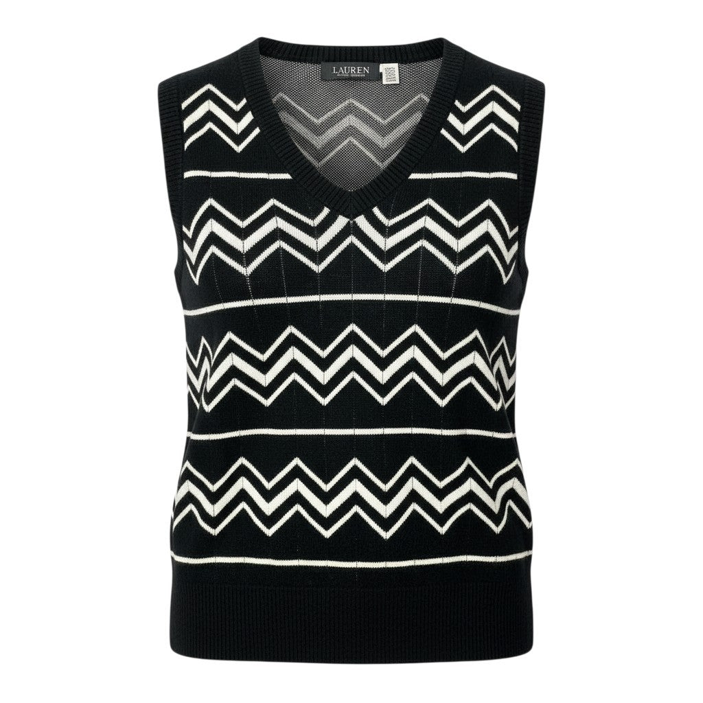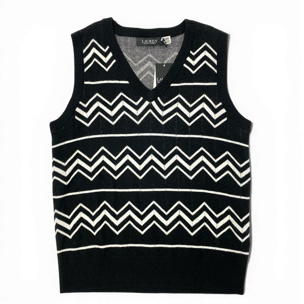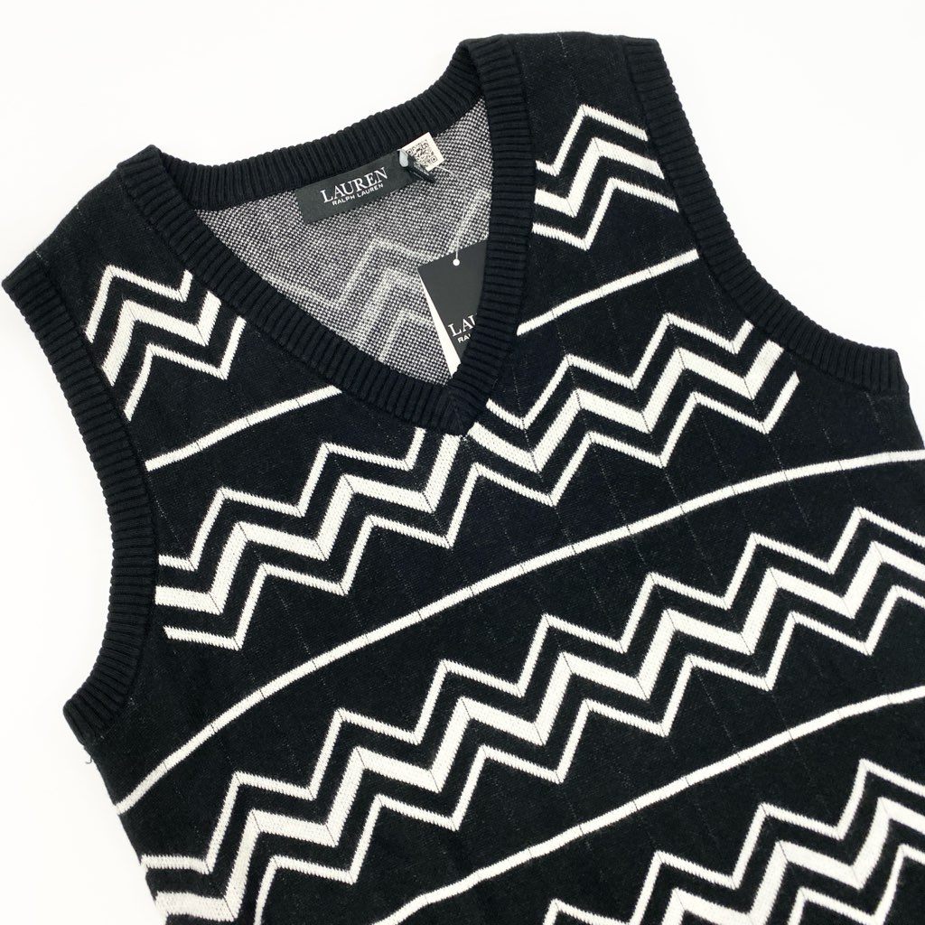 1a8 【未使用保管品】 LAUREN RALPH LAUREN ローレンラルフローレン ニットベスト ノースリーブニット Vネック シェブロン柄 モノトーン レディース M ブラック ホワイトu02t