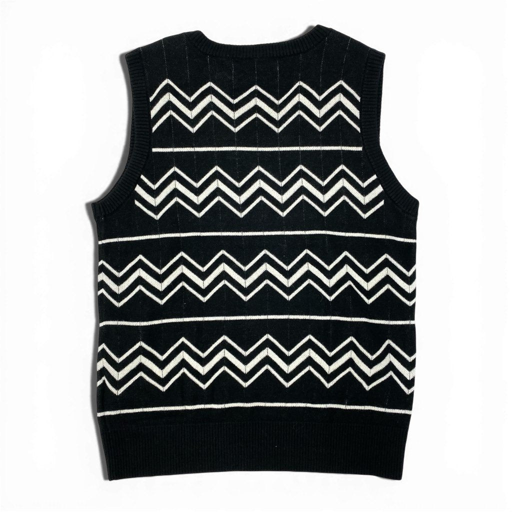 ブラック×ホワイトのモノトーン配色が洗練された印象のニットベストです。全体に施されたシェブロン(ジグザグ)柄がコーディネートのアクセントになります。素材はマットな質感のニットで、落ち着いた雰囲気と着回しやすさを両立。ローレンラルフローレンらしい上品なカジュアル感があり、シャツ合わせのきれいめスタイルからデイリーカジュアルまで幅広く活躍します。