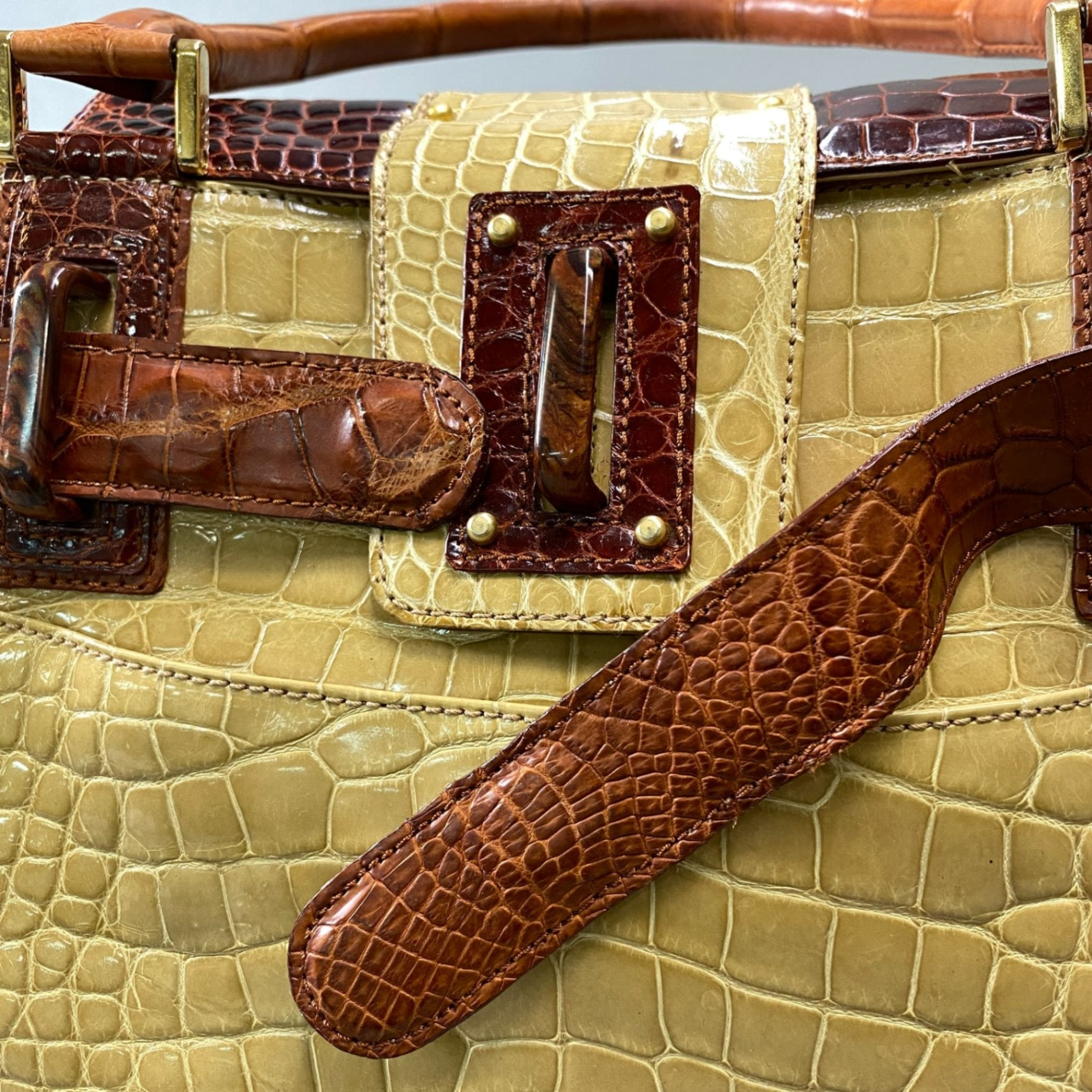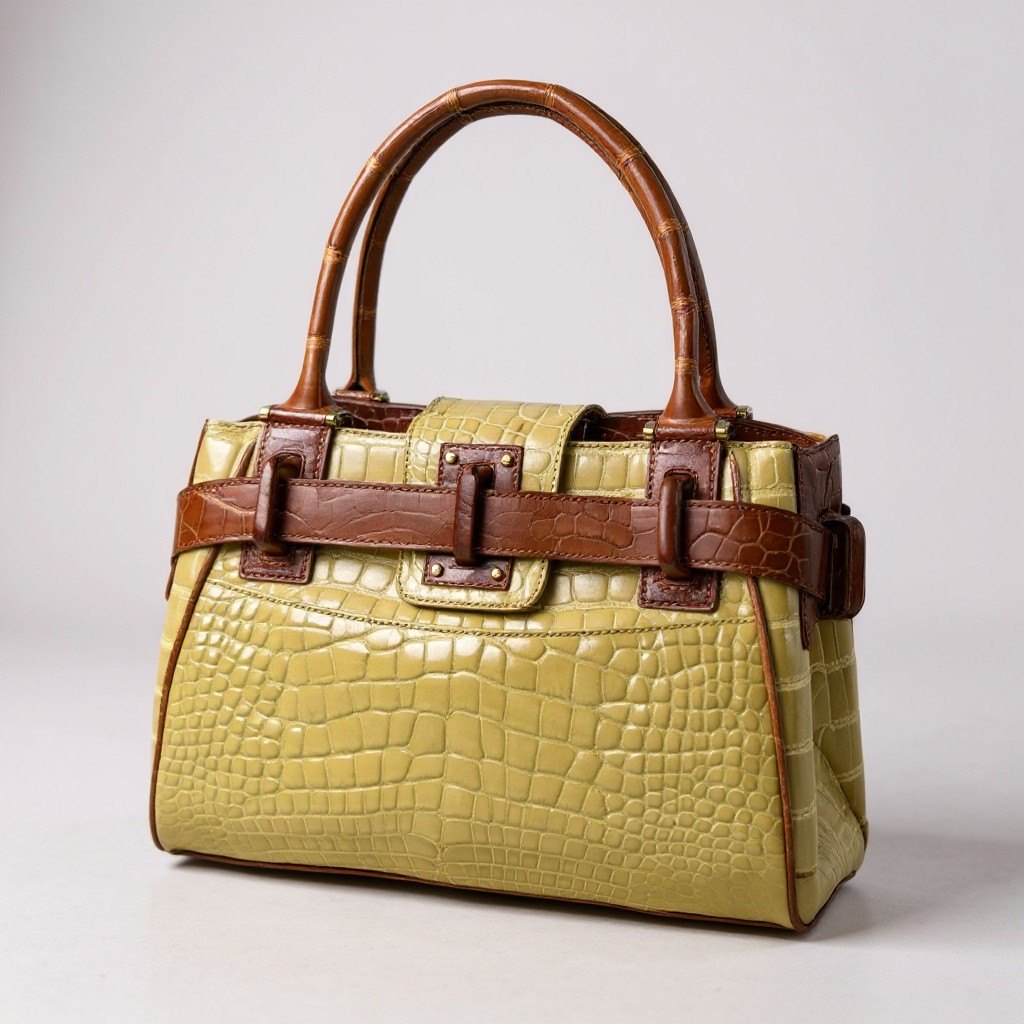 ベージュ×ブラウンのシャイニングクロコ調レザーが目を引く、NICO MARTELIのハンドバッグです。幅31.5cmの程よいサイズ感で、長財布やポーチ類をすっきり収納でき、普段使いに最適。 艶のあるクロコ型押しとベルト風のレザーディテールが上品さを演出し、きれいめから大人カジュアルまで幅広いスタイリングにマッチします。 持ち手を含めた高さは42cmあり、手持ち・腕掛けのどちらでもバランス良く持てる、実用性とデザイン性を兼ね備えた一品です。