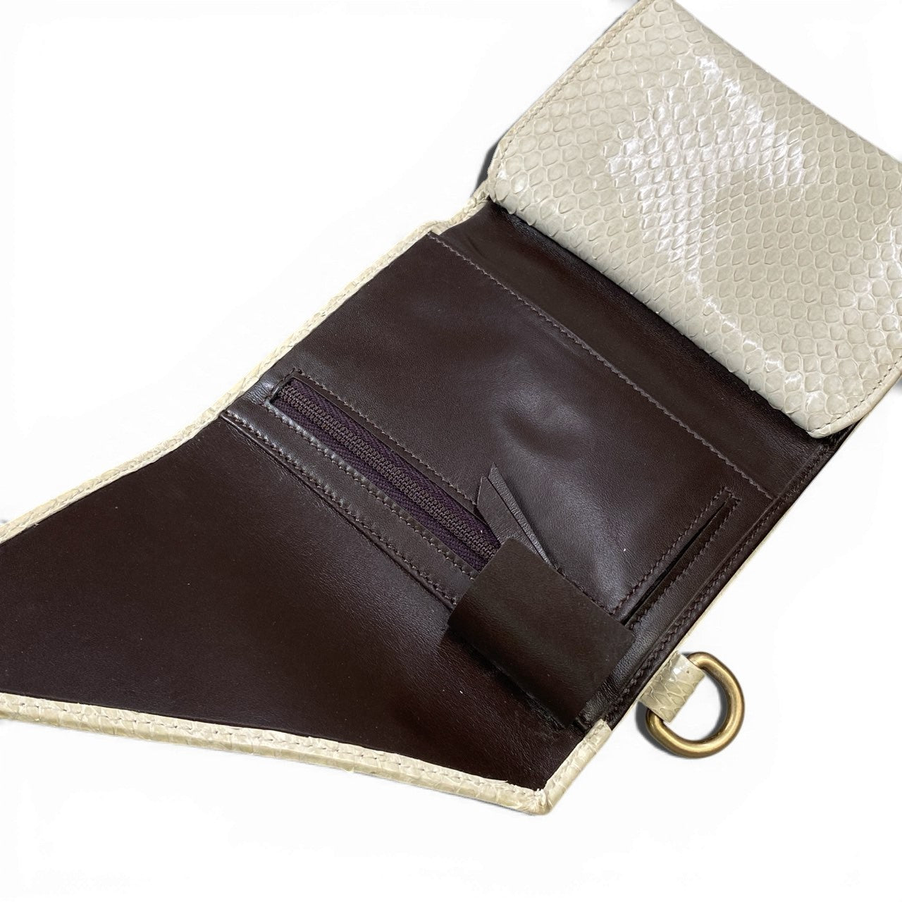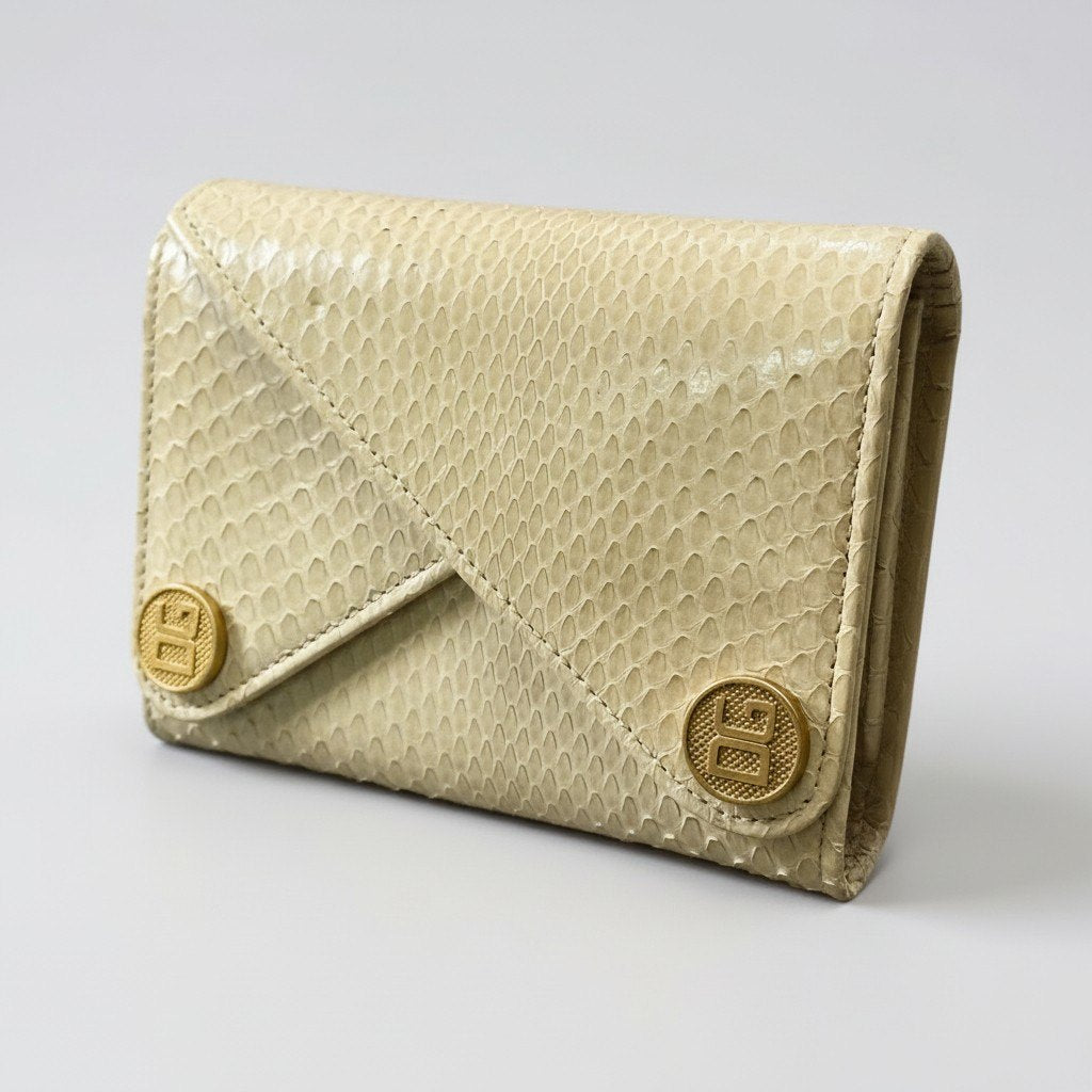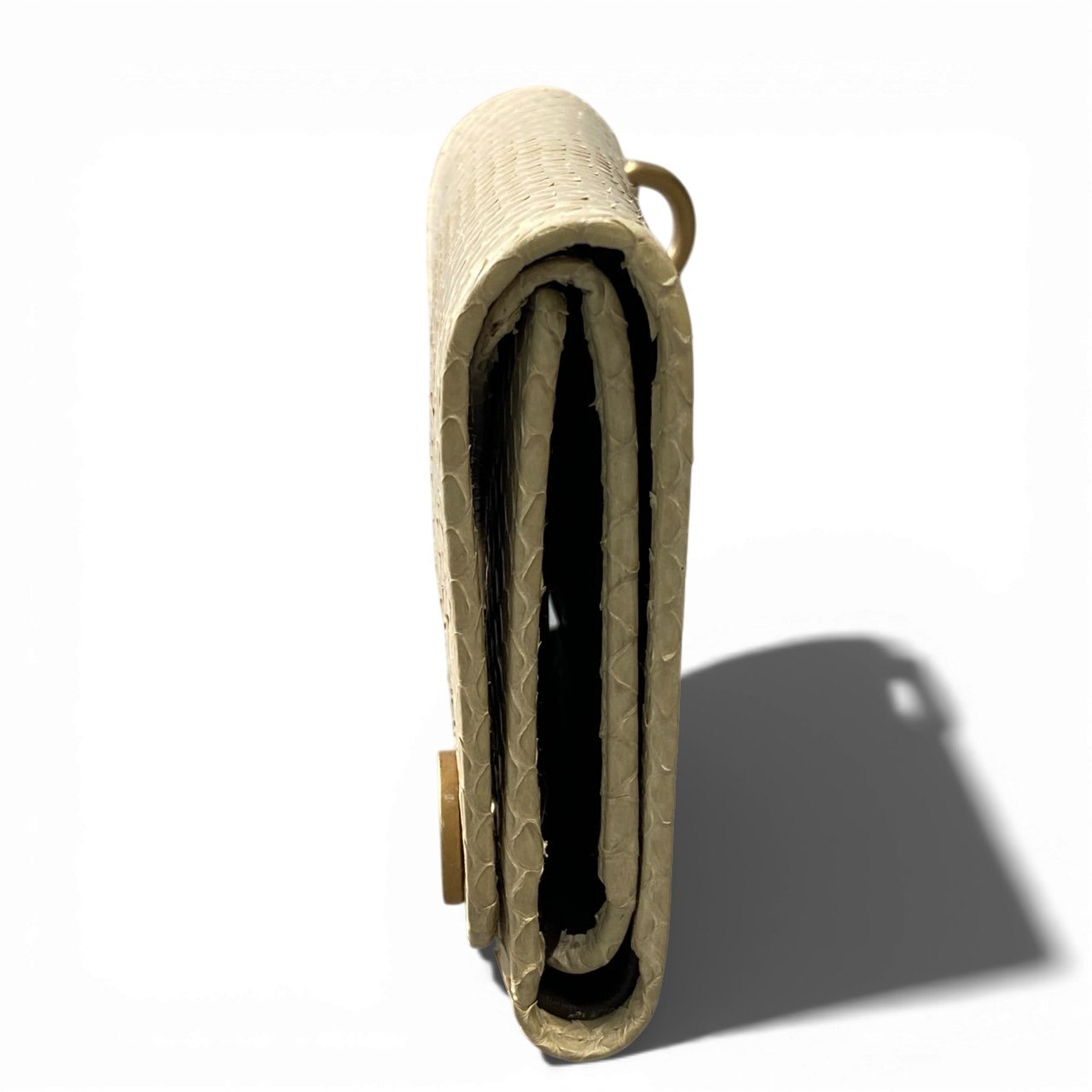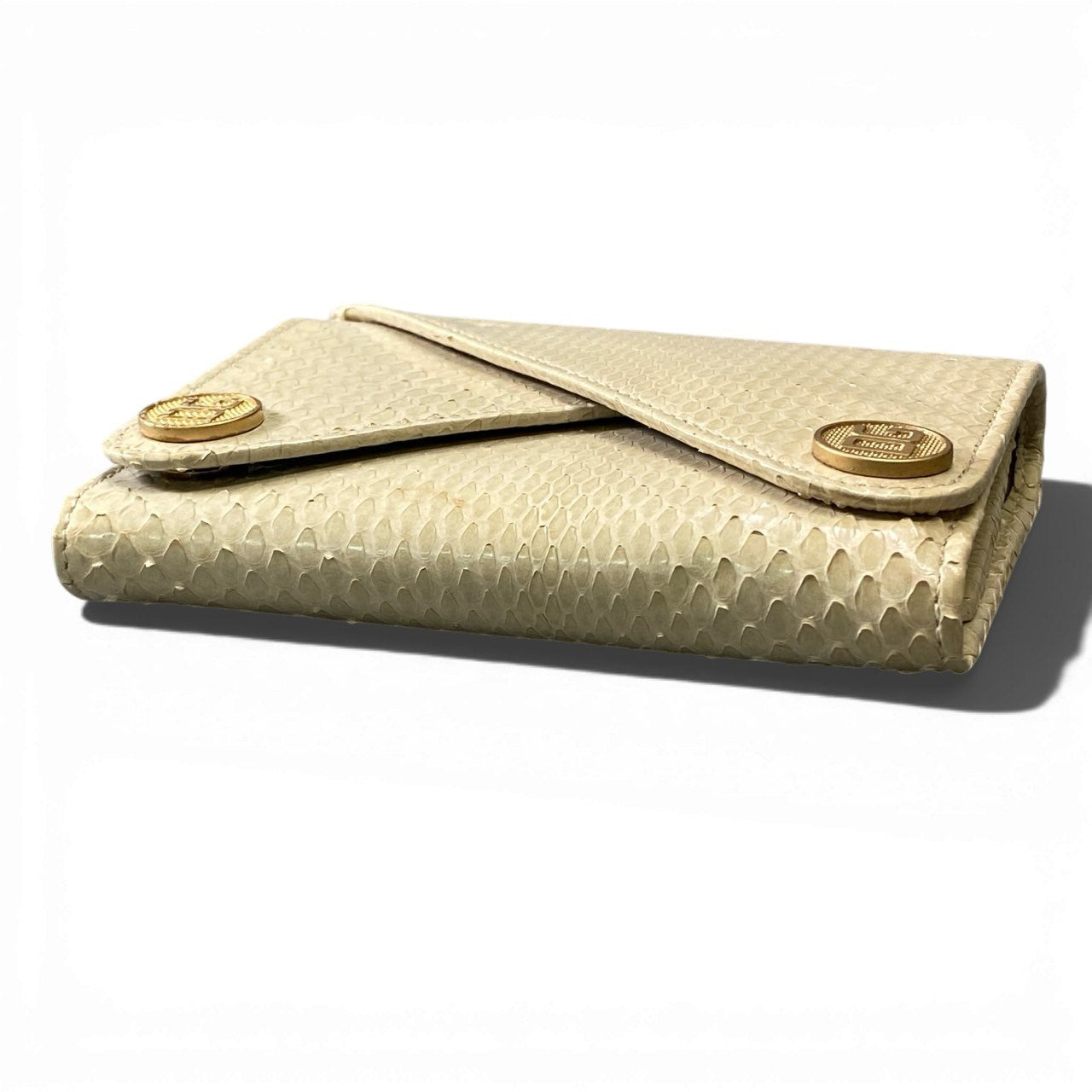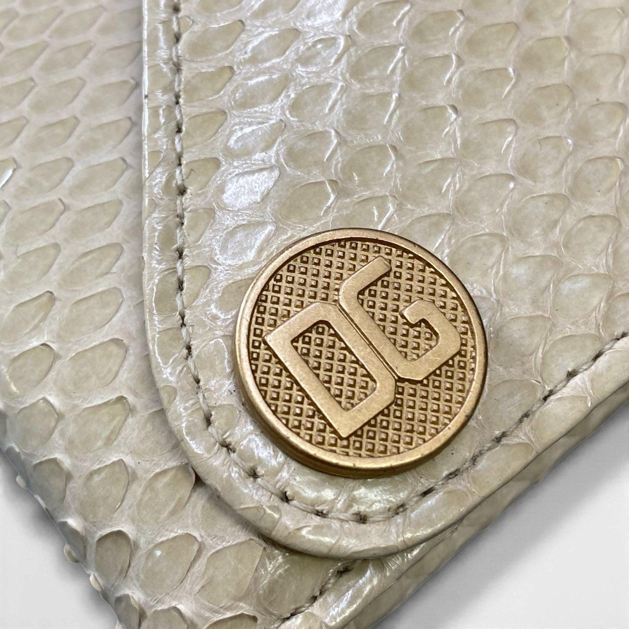 上品なアイボリー〜ライトベージュ系カラーが魅力の、DOLCE&GABBANAの三つ折り財布です。 立体感のあるパイソン型押しレザーが、光の当たり方で表情を変える高級感ある素材。 フロントのフラップにはゴールドトーンのDGメタルボタンを配し、クラシカルで華やかな印象に仕上げられています。 コンパクトながら存在感があり、きれいめスタイルやフォーマル寄りのコーディネートにも映えるアイテムです。