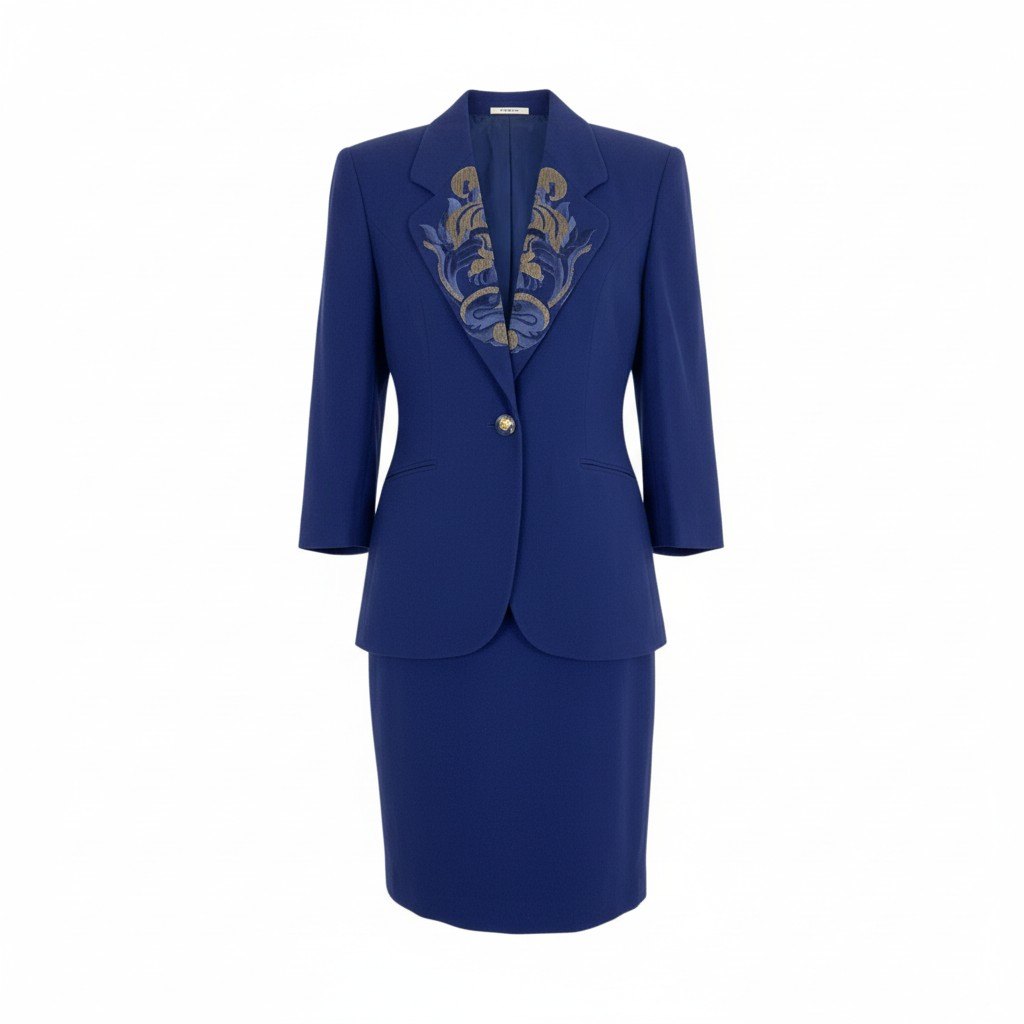 カラーは華やかなロイヤルブルーで、胸元にはゴールド糸を使用した重厚な刺繍モチーフが施された存在感抜群のスカートスーツです。フロントにはブランドらしい装飾ボタンを配置し、イタリアデザインらしいエレガンスが際立ちます。素材は上質なウール生地で、しっかりとした質感ながら滑らかな着心地が魅力。ロング丈スカートと長めのジャケットがクラシックな印象を与え、式典・フォーマル・ステージ衣装など華やかな場面で活躍します。ジャンフランコフェレらしい個性と上品さが融合した一着です。