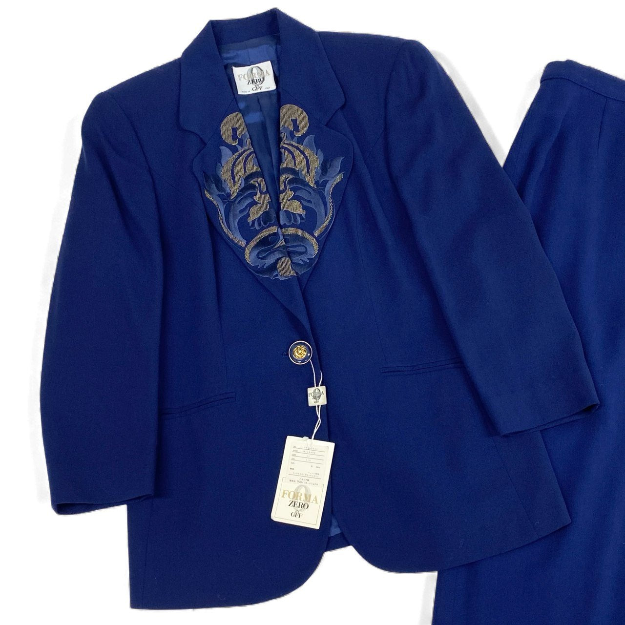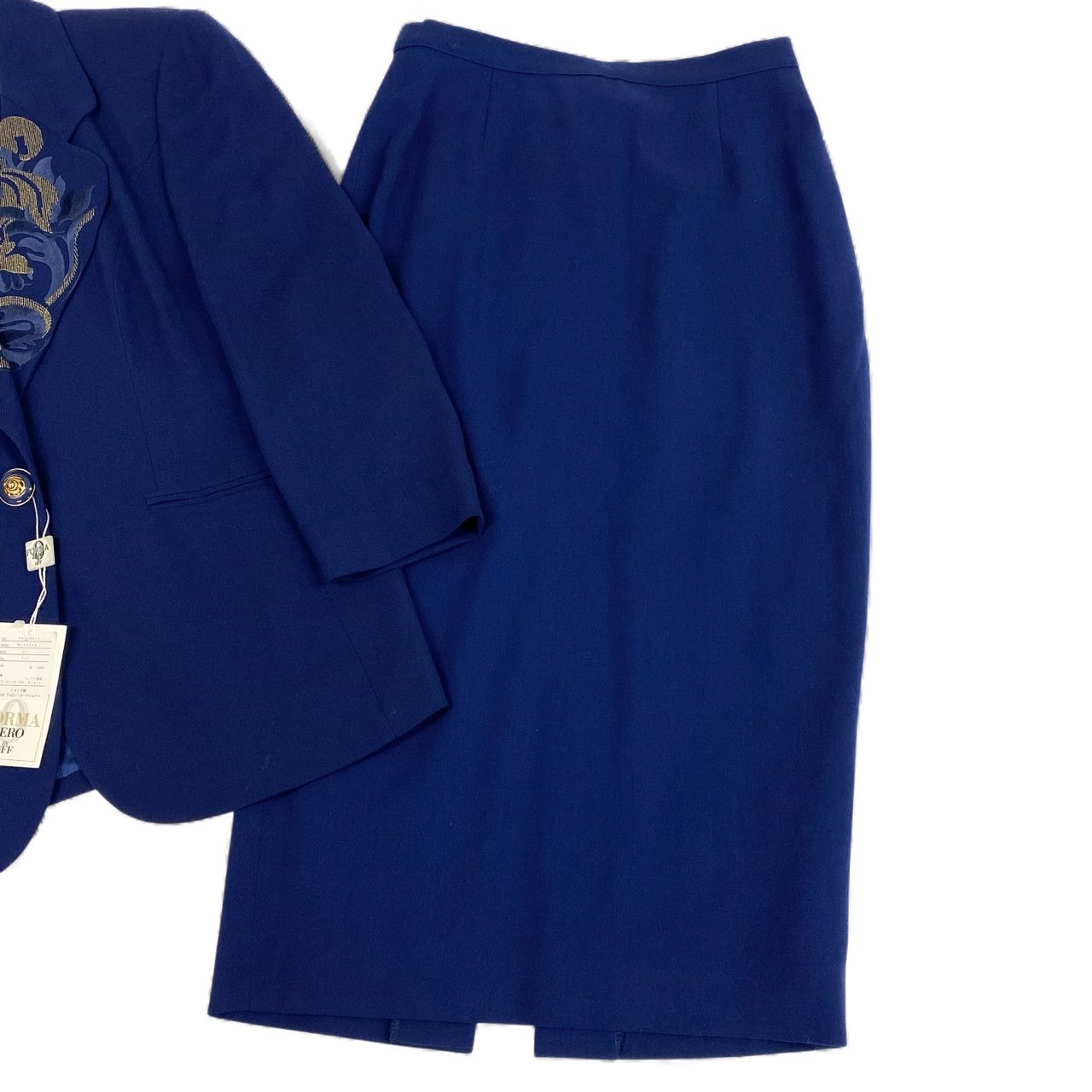 68L11《デッドストック》 Vintage GIANFRANCO FERRE ジャンフランコフェレ GFF セットアップ スカートスーツ 刺繍 装飾ボタン 44 ブルー ウール レディース 女性用u02t