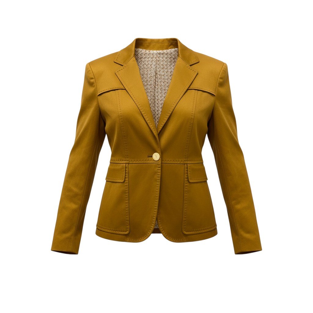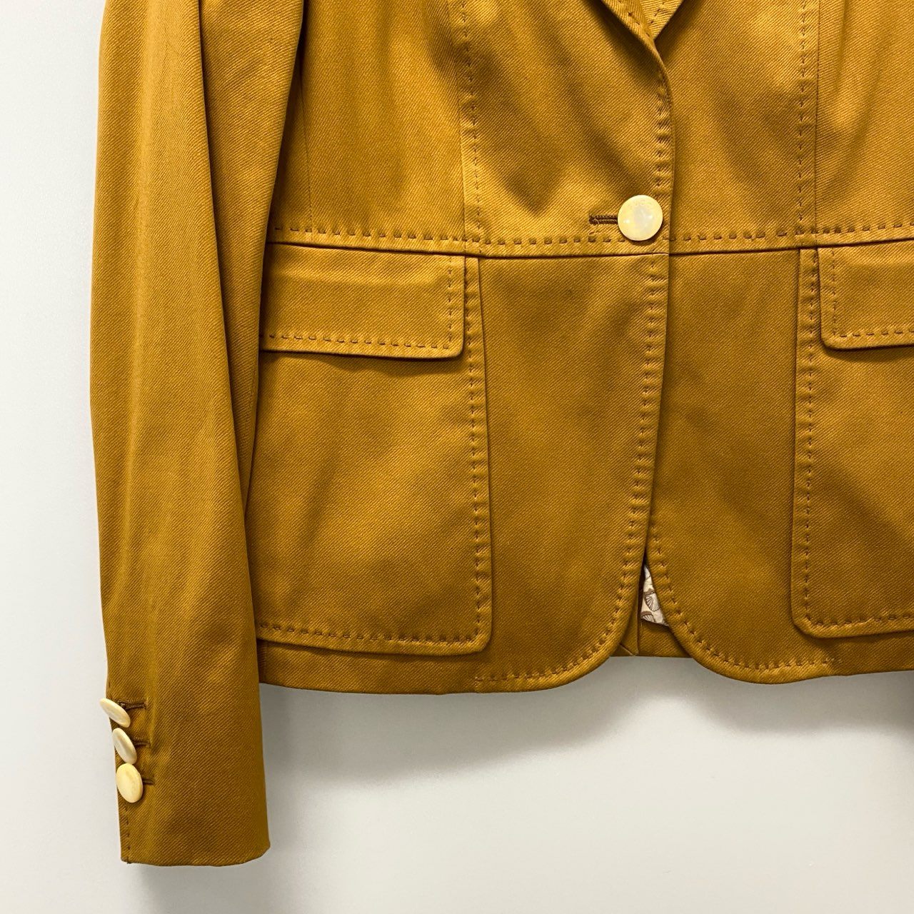 深みのあるキャメル(マスタード寄り)カラーが目を引く、GUCCIのテーラードジャケットです。 裏地には貝殻モチーフの総柄があしらわれ、さりげない遊び心とブランドらしさを感じさせます。 素材はマットでしなやかなコットン系生地で、軽やかさと上品なハリ感を両立。 デニムからスラックス、ワンピースまで合わせやすく、通勤からきれいめカジュアルまで幅広く活躍します。