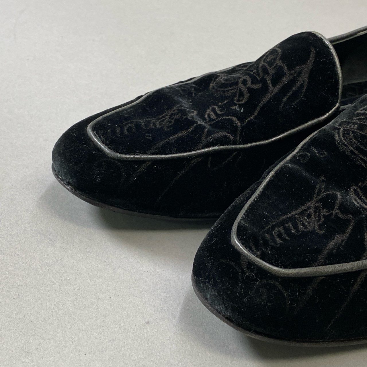 ベルルッティのオペラシューズ、ベロア素材のスリッポンです。写真からは深みのあるブラックのベロアに、同系色で描かれたカリグラフィ柄が浮かび上がり、上品かつ個性的な印象を与えています。柔らかいベロアの質感と洗練された細身のシルエットが特徴で、ドレスアップしたスタイルやラグジュアリーなカジュアルコーデに最適です。クラシックな中にベルルッティらしい芸術性が光る一足です。