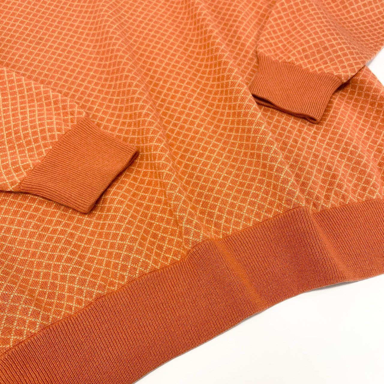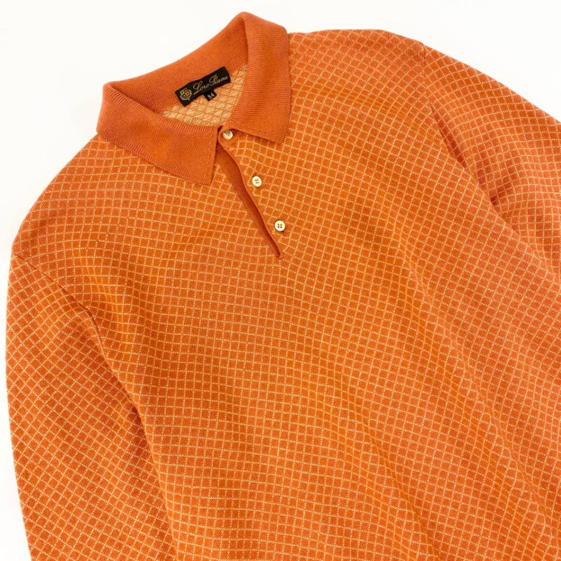 Loro Piana(ロロピアーナ)の長袖ポロシャツ。色は温かみのあるテラコッタオレンジで、繊細なダイヤ柄の編地が上品なアクセントを加えています。カシミヤとシルクを贅沢にブレンドした素材は、なめらかで柔らかく、肌に吸い付くような極上の着心地。ジャケットインにも適した上品な佇まいで、ラグジュアリーな大人のオフスタイルを演出します。