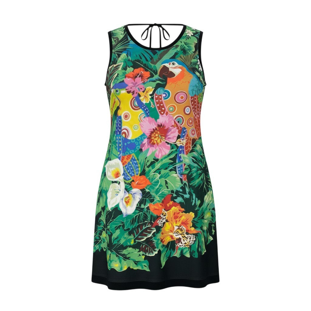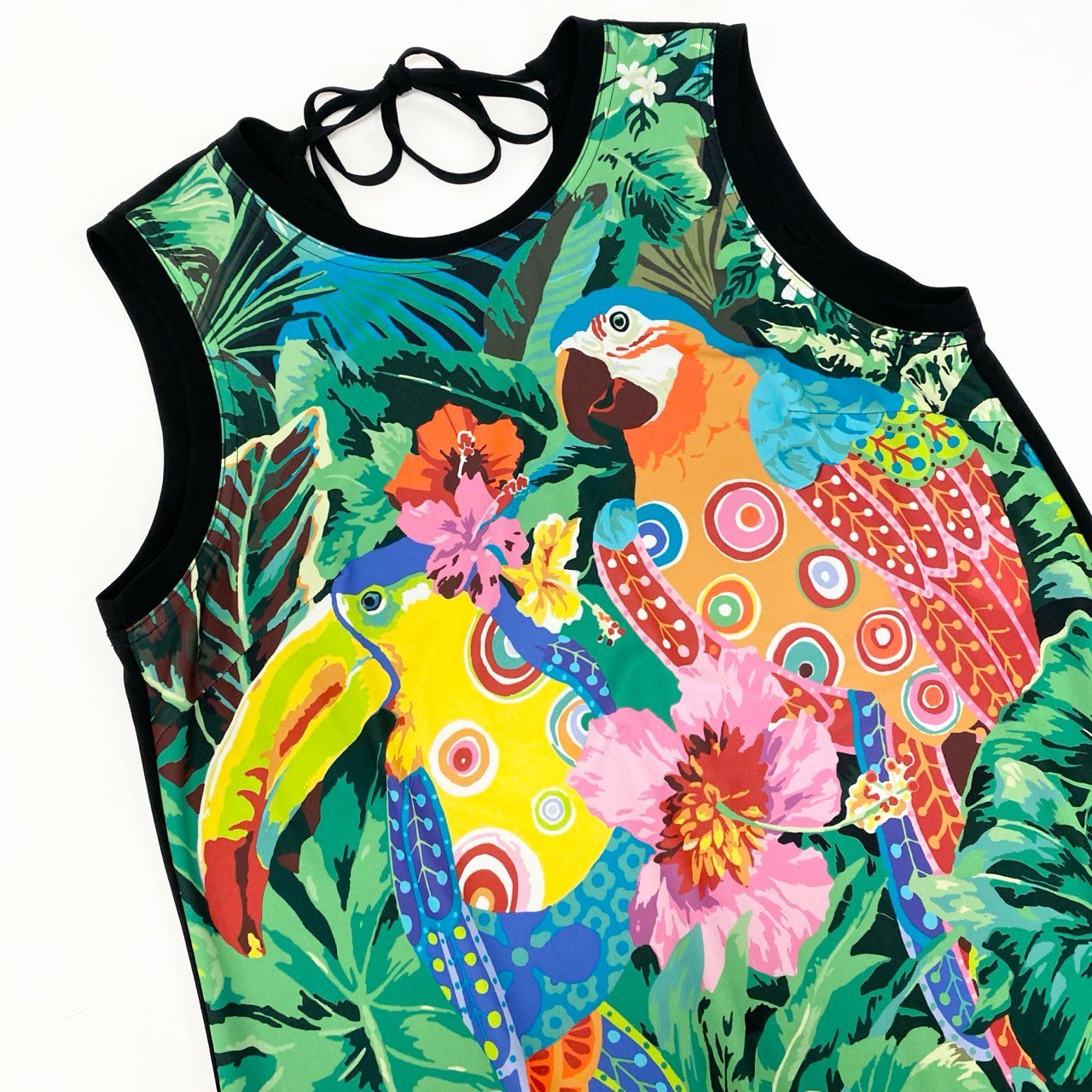 鮮やかなトロピカルグリーンを背景に、カラフルなオウム(パロット)や南国の花々が描かれた、TOKUKO 1er VOLらしいアート性の高いノースリーブワンピースです。ブラックの縁取りが全体を引き締め、ビビッドなプリントを際立たせるデザイン。軽やかで扱いやすいポリエステル素材を使用し、旅行先や夏のお出かけにも最適です。1枚着るだけで華やかな印象が完成し、イベント・リゾート・街歩きなど幅広いシーンで活躍します。