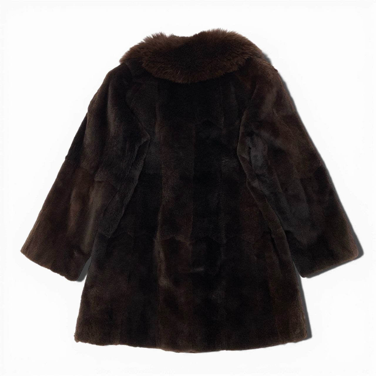 ブラウンカラーのレッドフォックス襟と、シェアードファーを組み合わせた高級感のある毛皮コートです。フォックス特有のボリューム感のある襟元が顔まわりを華やかに演出し、身頃は毛足を抑えたマットな質感で上品に仕上げられています。無地デザインながら素材のコントラストが際立ち、落ち着いた大人の印象です。フロントはすっきりとしたラインで、ワンピースやパンツスタイルとも相性良好。観劇や食事会など、冬のきちんとしたお出かけにおすすめの一着です。