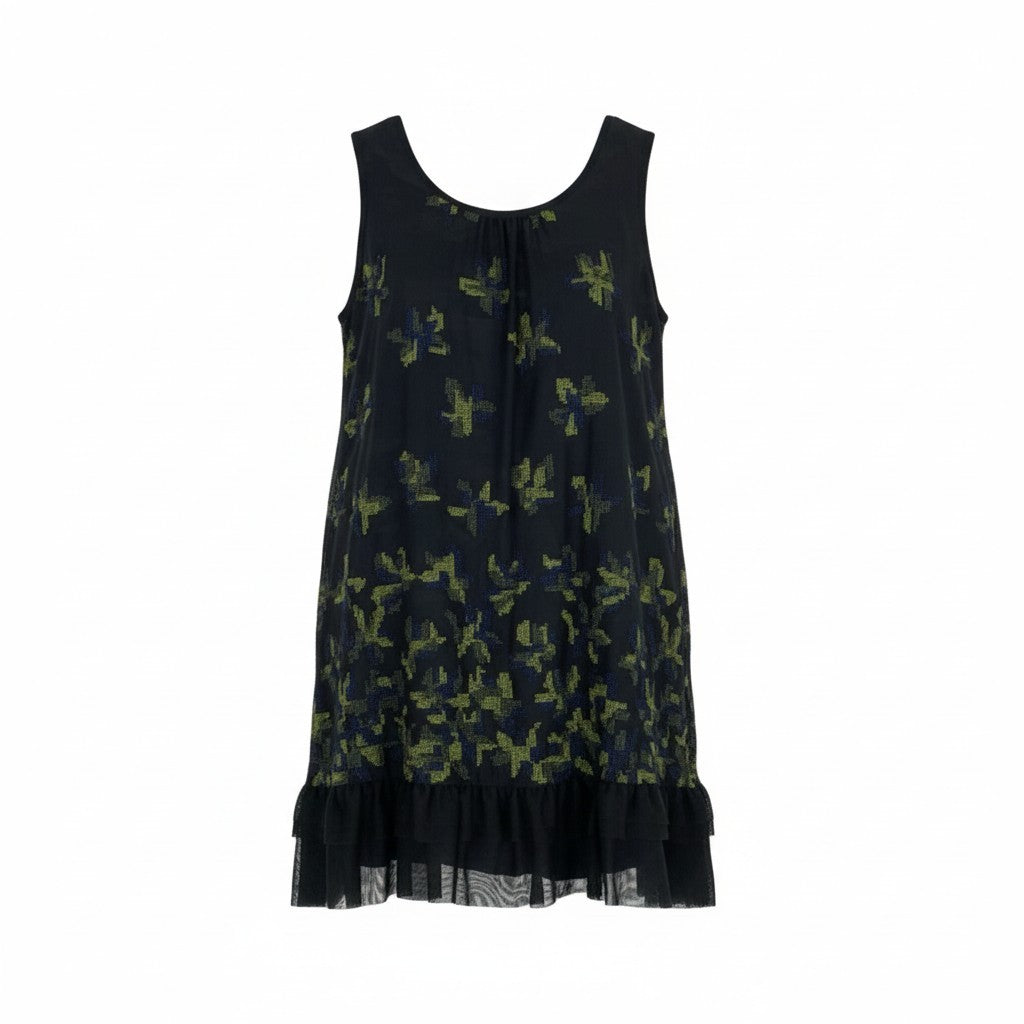 ブラックベースにグリーン×ブルー系の総柄刺繍が映える、トクコプルミエヴォルらしい立体感のあるノースリーブワンピースです。メッシュを重ねたレイヤード風のデザインで、動きに合わせて刺繍が浮き立つ華やかな表情が魅力。裾はフリル切り替えになっており、シンプルながら存在感のあるシルエットを演出します。軽やかな素材感でシーズン問わず使いやすく、旅行・お出かけ・ステージ衣装など幅広いシーンで活躍します。単体着用はもちろん、長袖インナーとの重ね着もおすすめです。