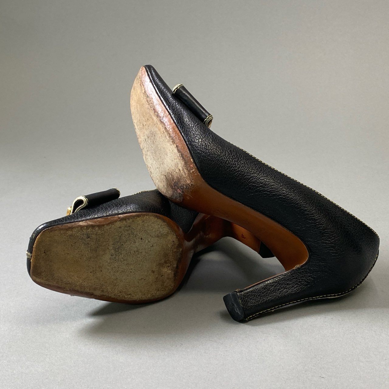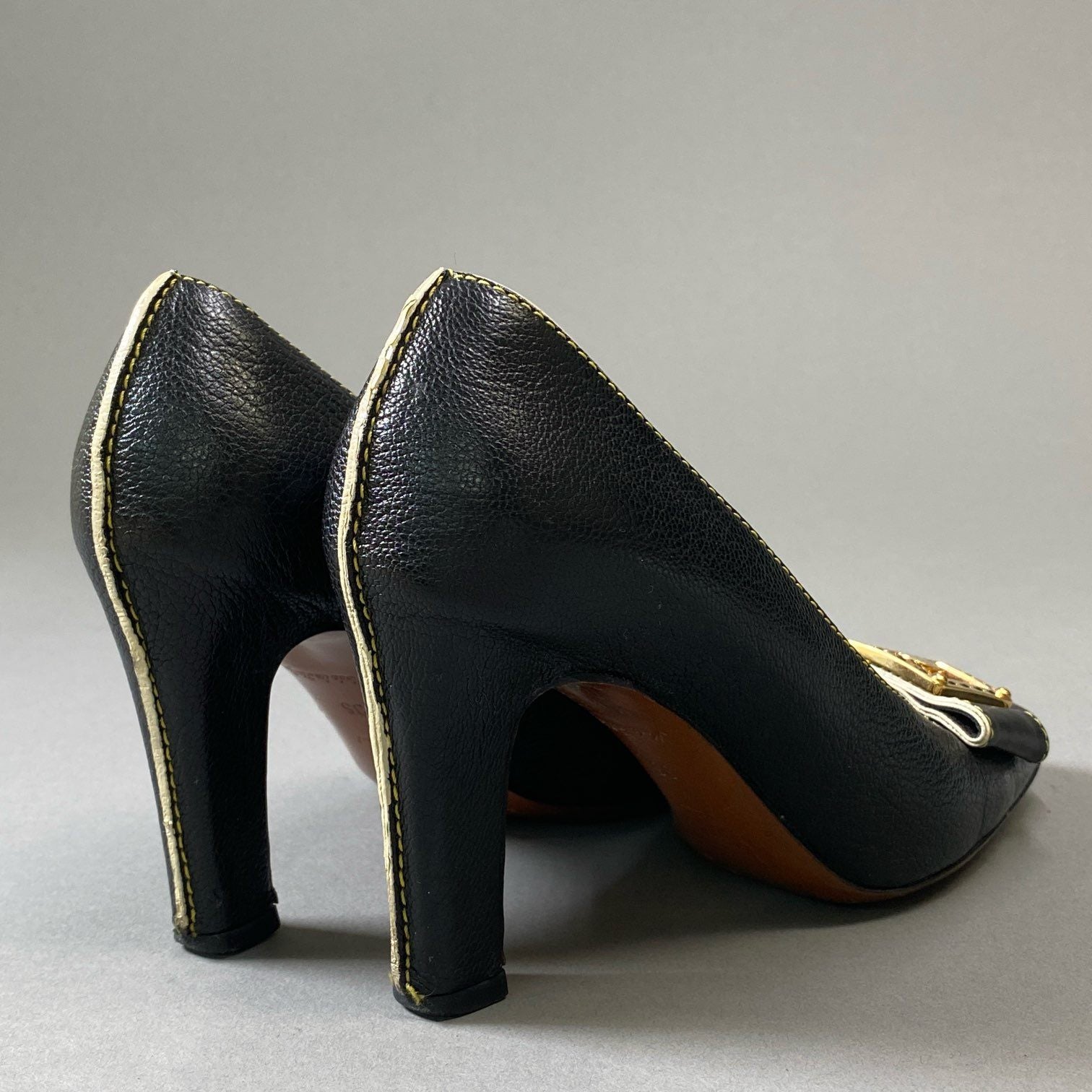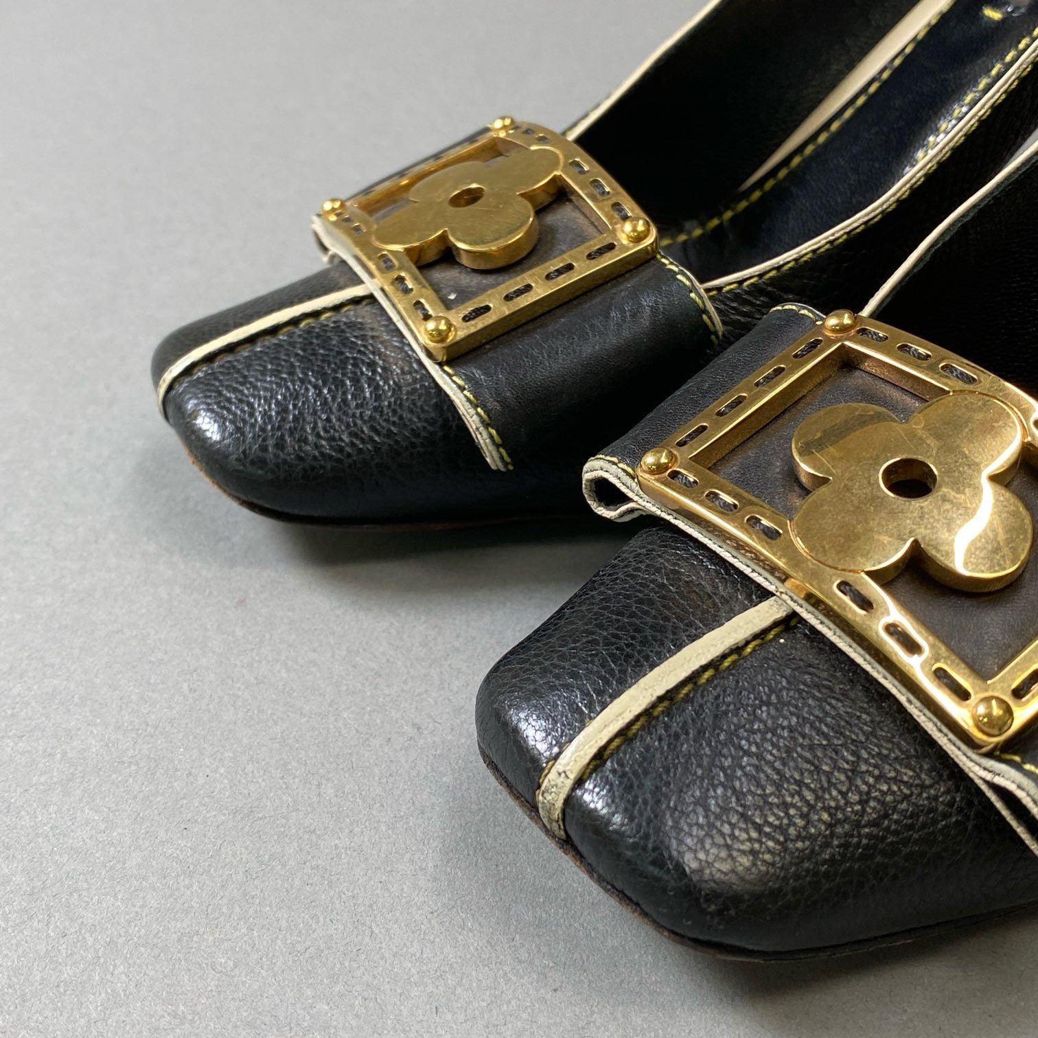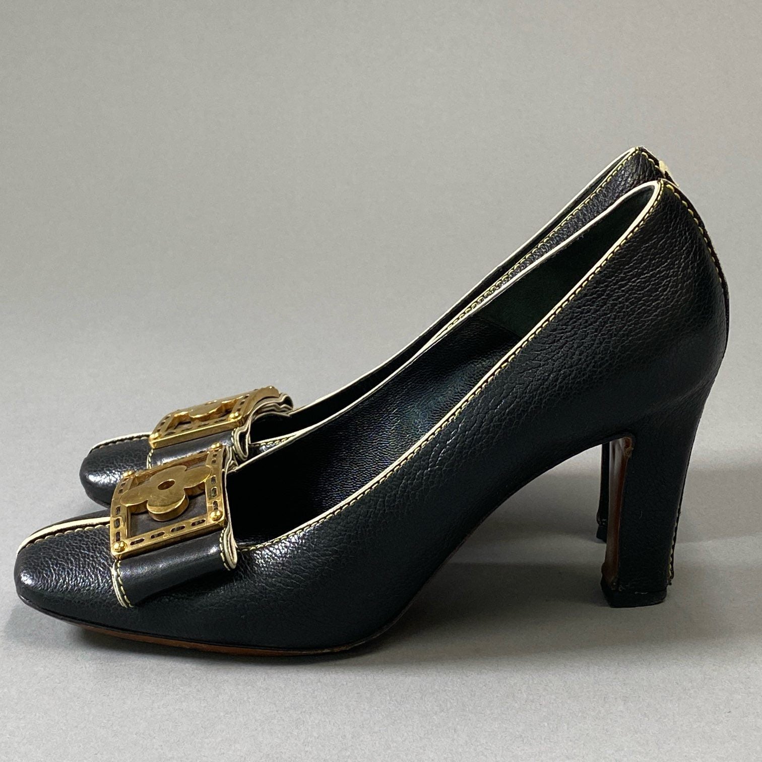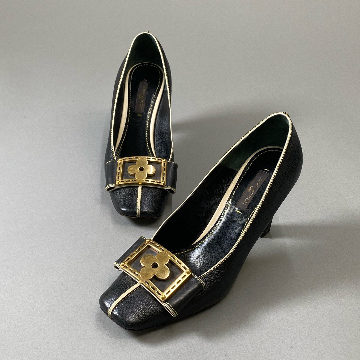 3i30 LOUIS VUITTON ルイヴィトン ゴールドフラワープレート スクエアトゥ ヒール パンプス ステッチ 35サイズ ブラック レザー レディースt18r