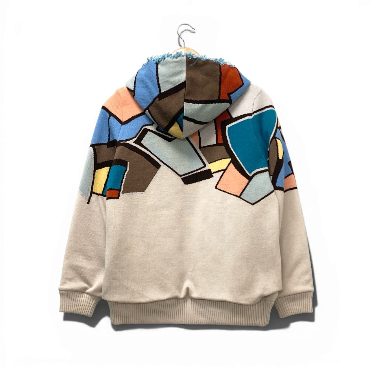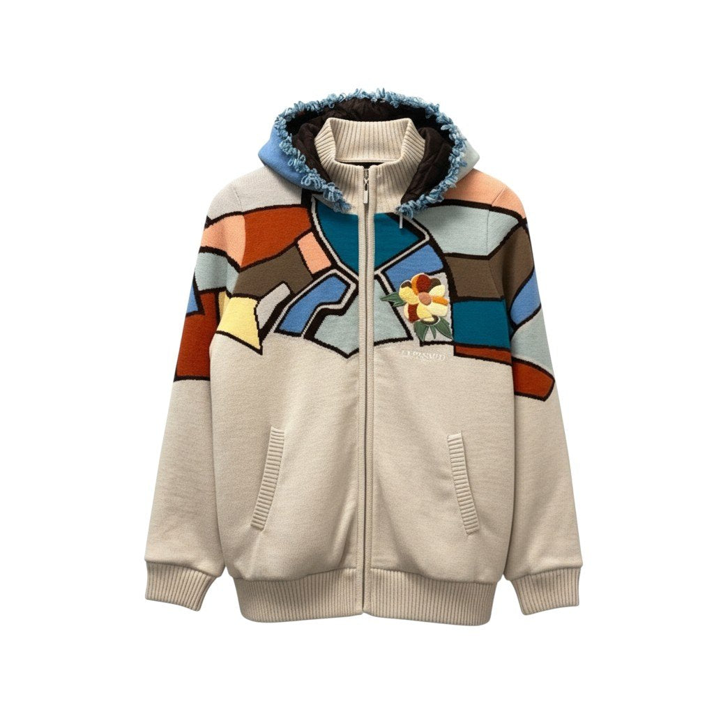 アイボリーベージュをベースに、ブルー・テラコッタ・ブラウンなどを組み合わせた幾何学ブロック柄が印象的なジップアップニットです。胸元には立体感のあるフラワー刺繍が施され、華やかなアクセントをプラス。やや毛足を感じるあたたかみのあるウール素材で、フードは取り外し可能な2WAY仕様です。リブ仕様の裾と袖口がシルエットを引き締め、カジュアルから上品な大人コーデまで幅広く活躍する一着です。