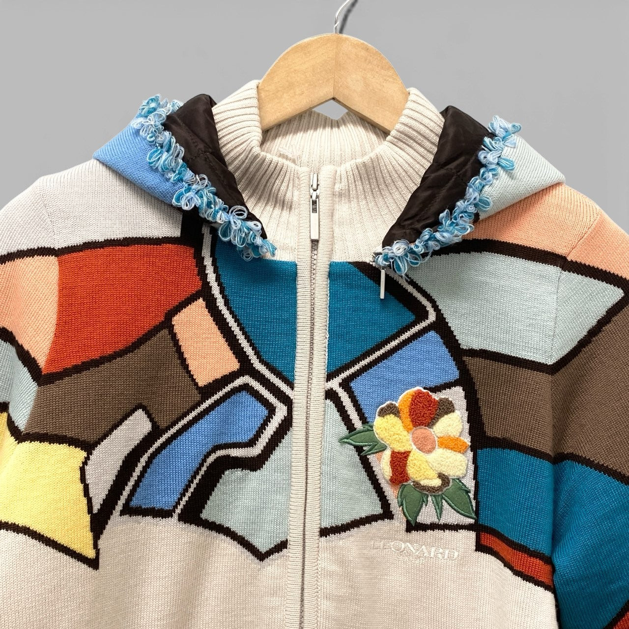 19b13 LEONARD SPORT レオナール スポーツ ジップアップニットフーディー ジャケット 花柄刺繍 フード取り外し可 0527752 42サイズ マルチカラー ウール100% レディース 女性用u02t