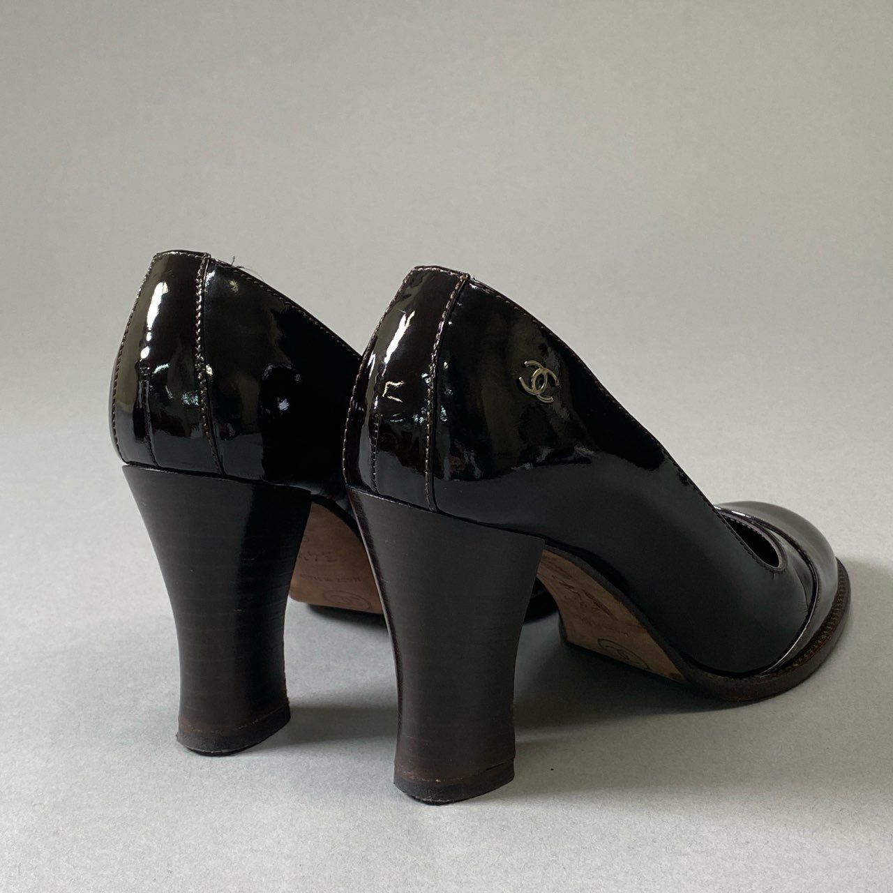 シャネルのクラシカルなパンプス。艶やかなブラックのパテントレザーが、光沢感とラグジュアリーさを演出しています。サイドにはさりげなくココマークが配され、ブランドらしいアイコニックなアクセントに。ヒールは約8cmで、美しいシルエットと脚長効果を叶えつつ、フォーマルからパーティーシーンまで幅広く活躍します。シンプルながら存在感のある一足です。