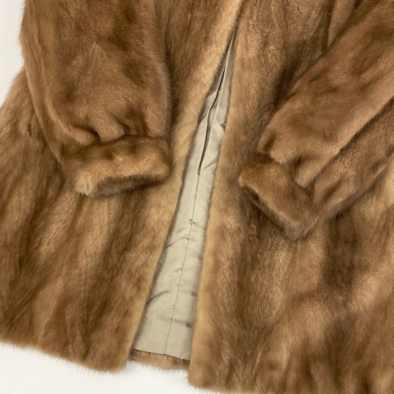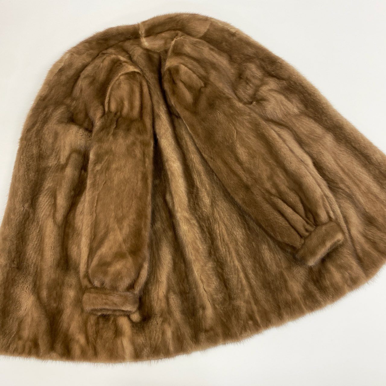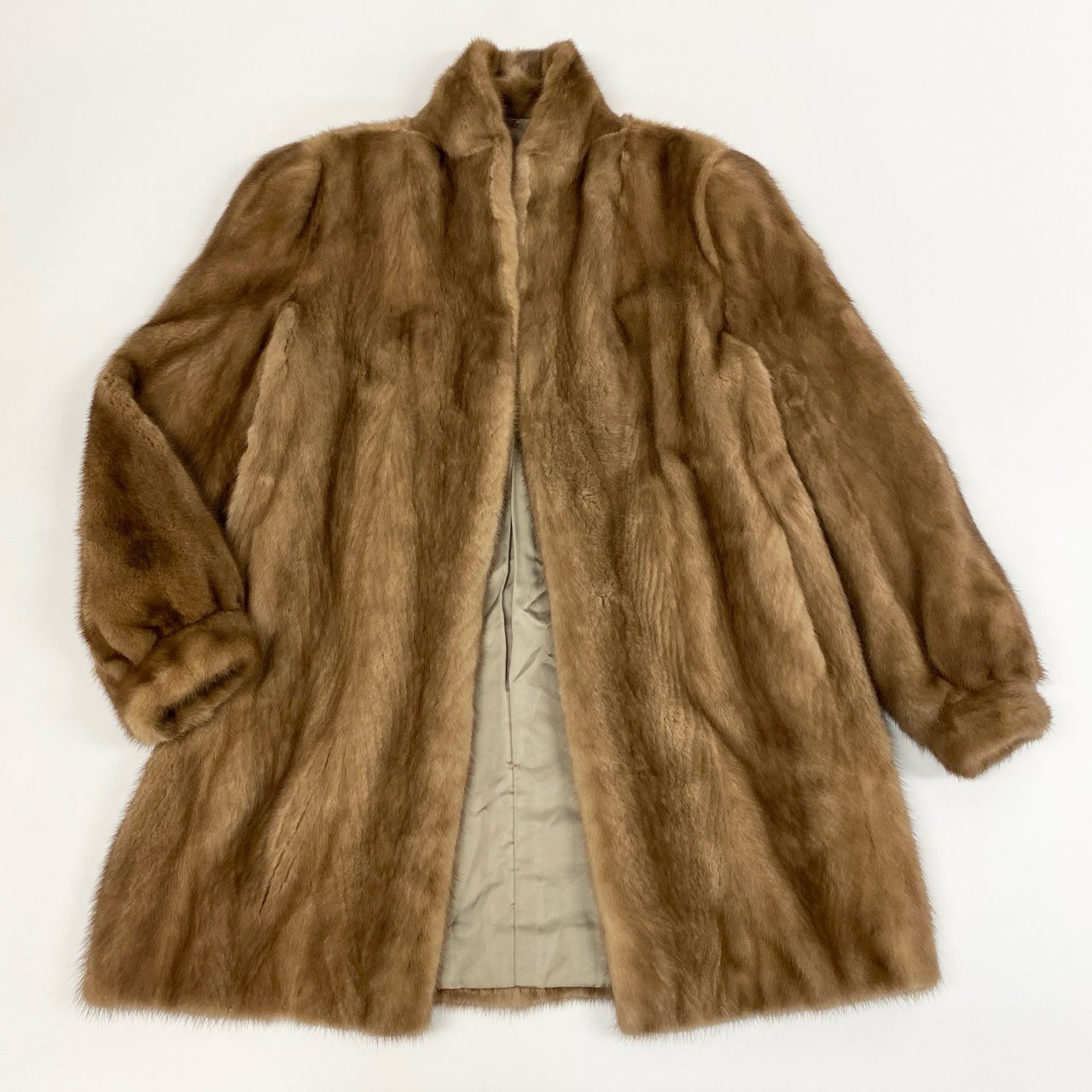 本品の毛皮コートは、柔らかなライトブラウンカラーが印象的で、ナチュラルな光沢感が高級感を引き立てます。毛足はなめらかで上品な艶があり、軽やかさと暖かさを兼ね備えています。シンプルなデザインながらも袖口にふんわりとした立体感があり、女性らしい優雅さを演出。フォーマルなシーンから冬のお出かけスタイルまで幅広く対応し、大人のコーディネートに華を添える一着です。