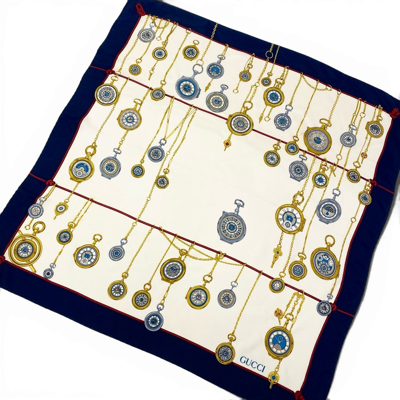 b20 GUCCI グッチ Pocket Watch Silk Scarf 懐中時計柄 スカーフ ネイビー ホワイト シルク100% イタリア製t18r