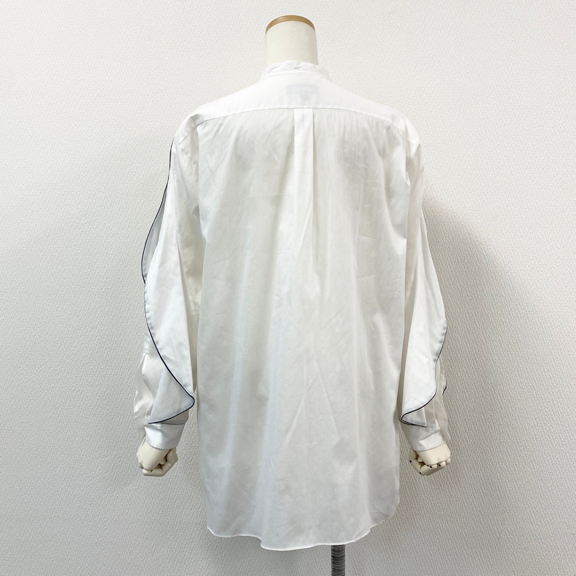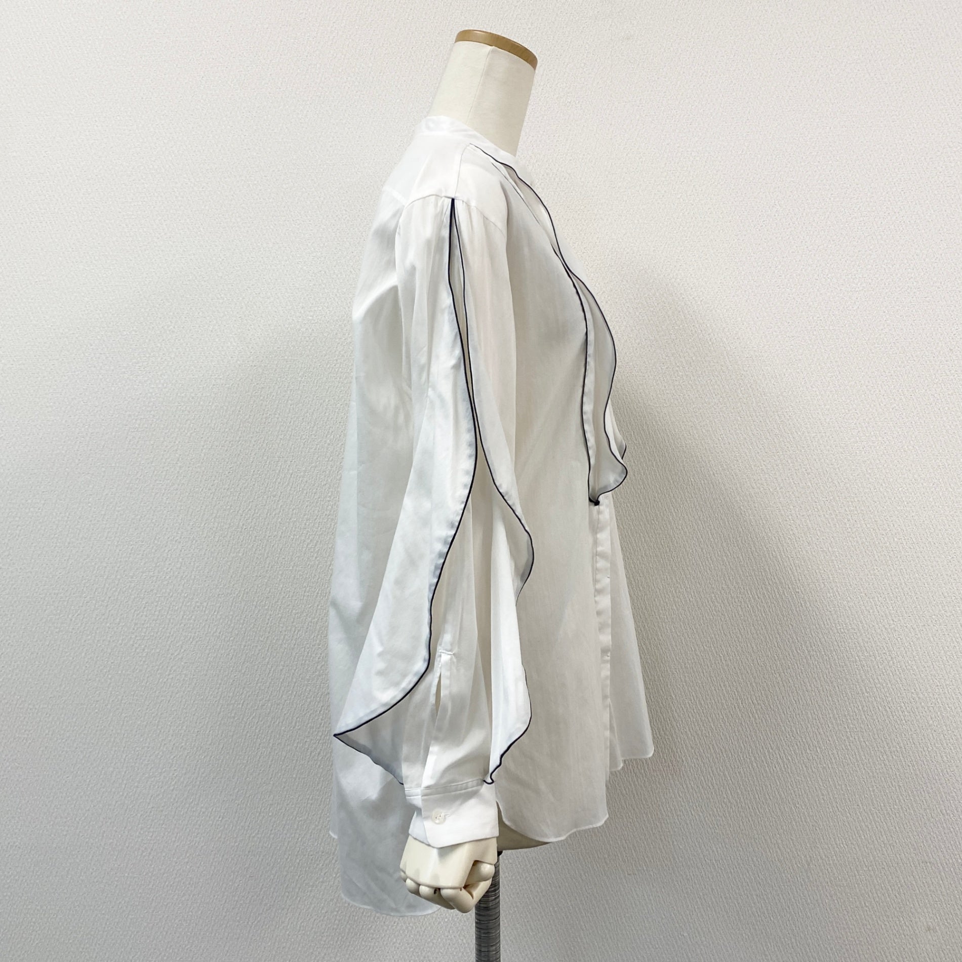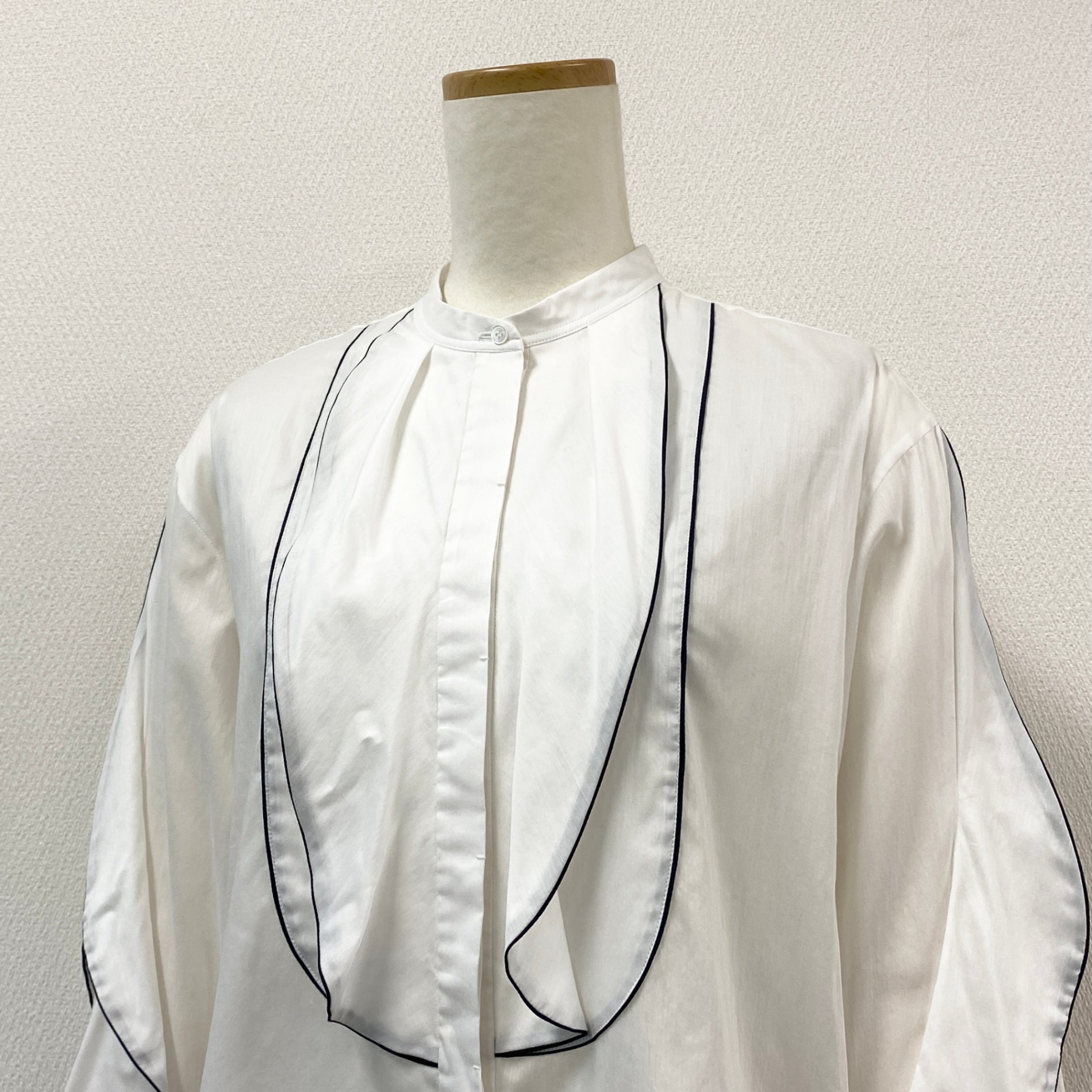 54g10 《美品》 Drawer ドゥロワー バンドカラー パイピング 比翼 長袖シャツ 36 ホワイト コットンシルク ブラウス