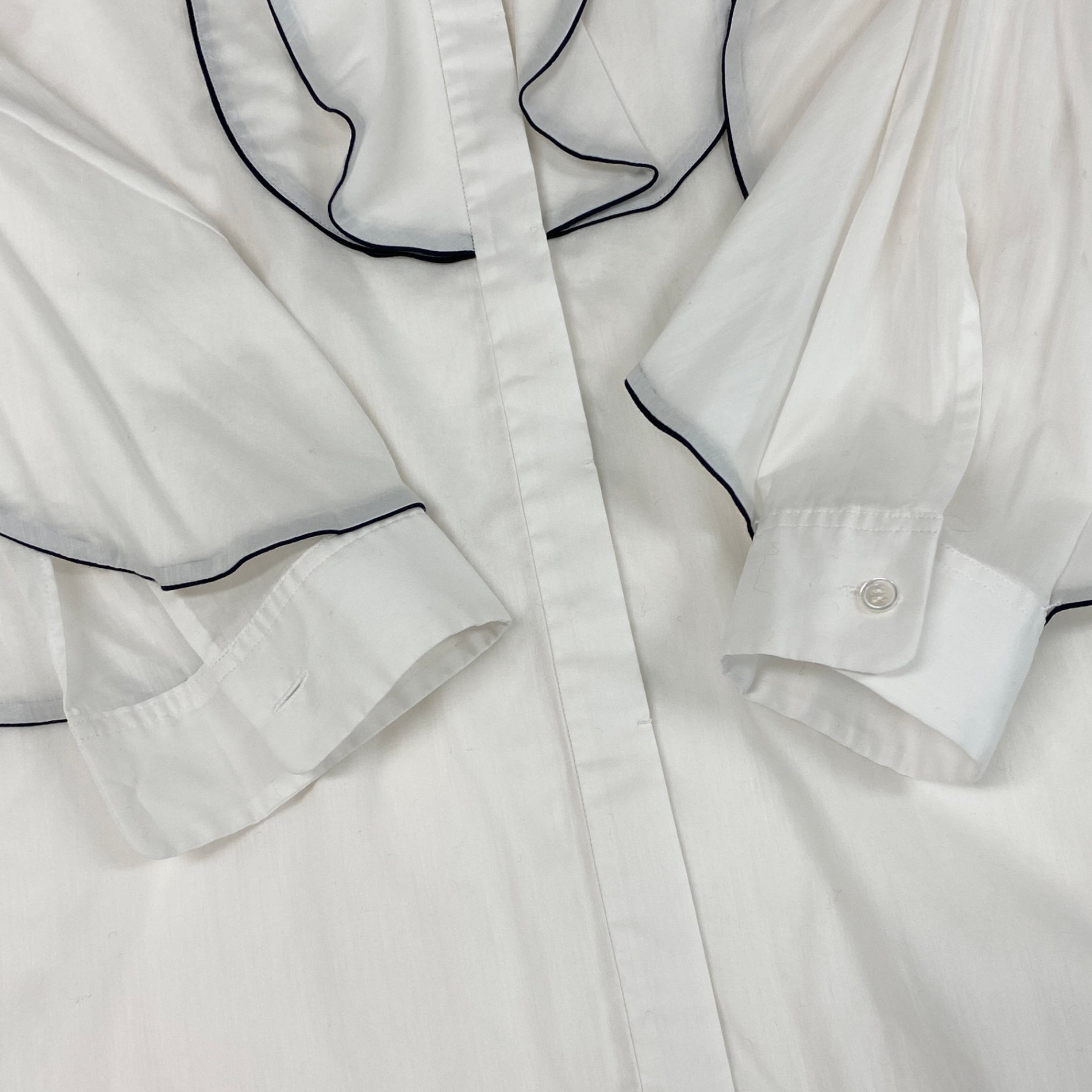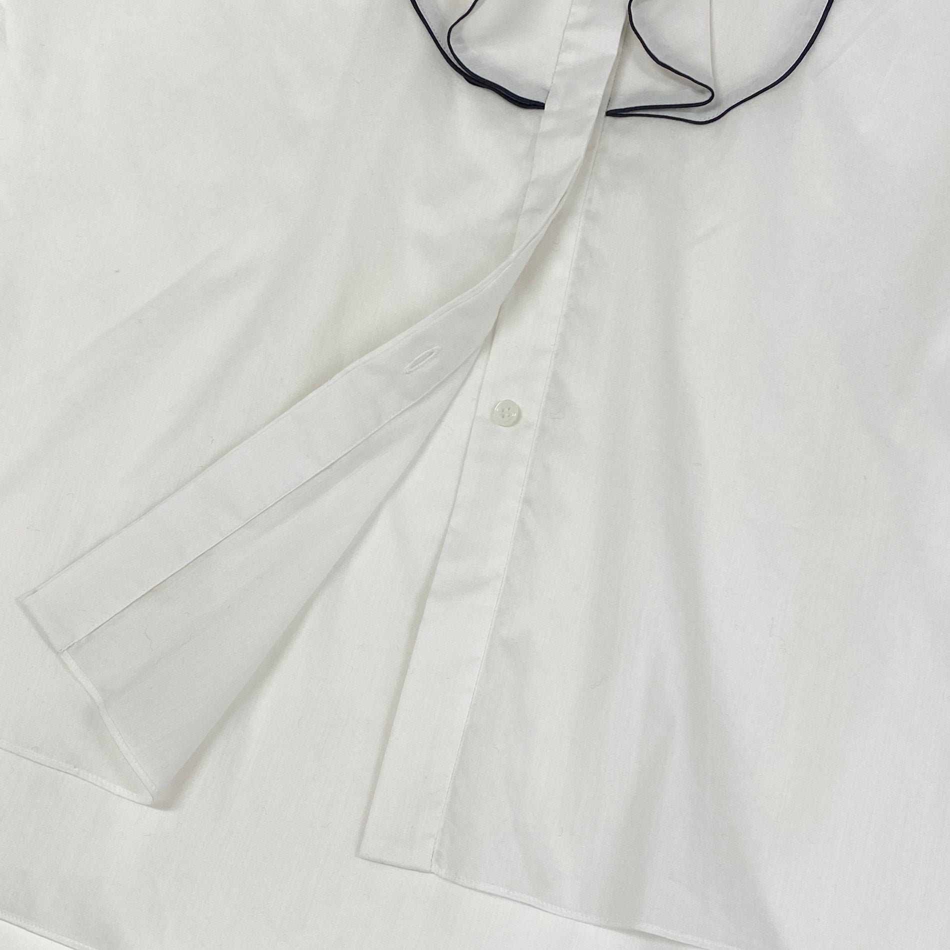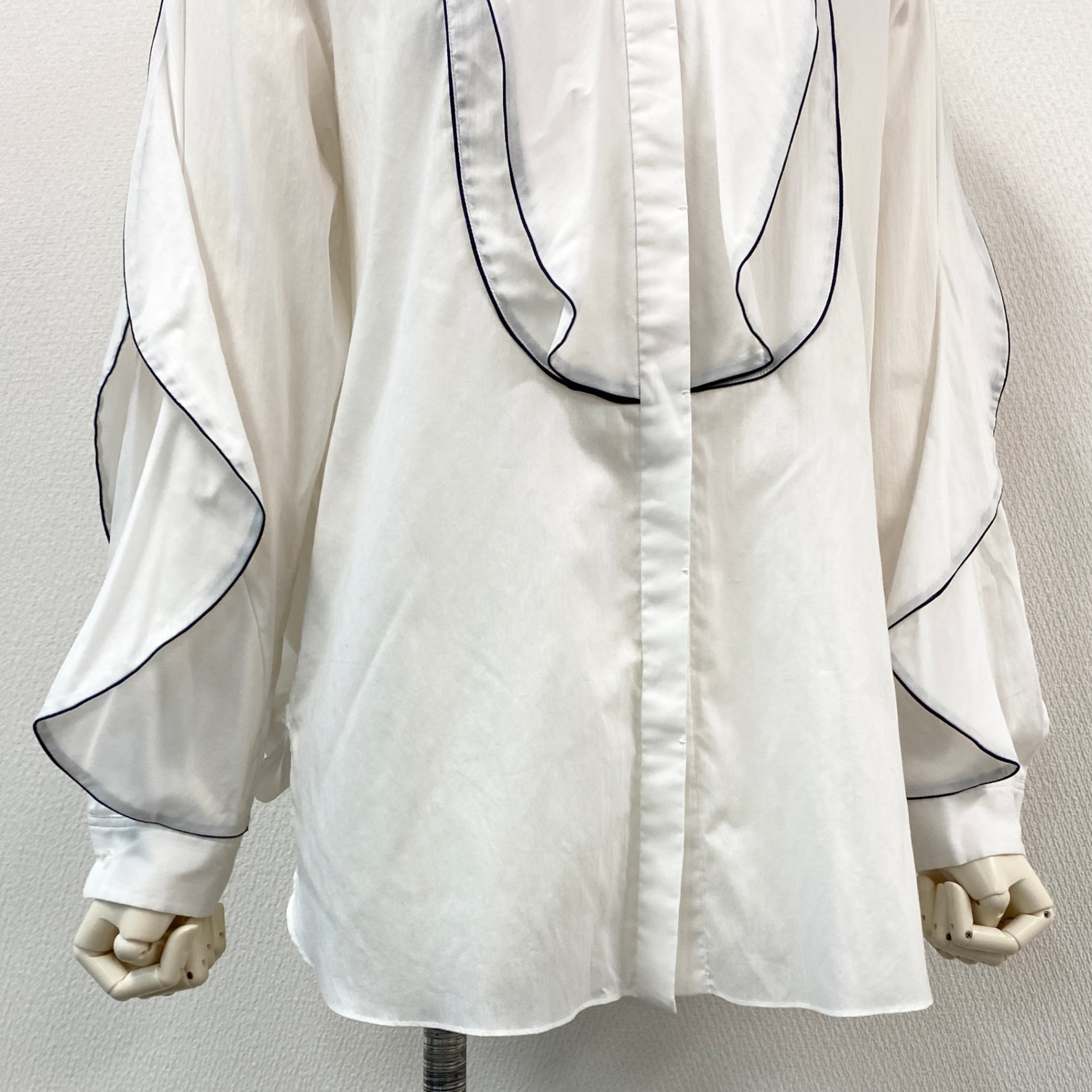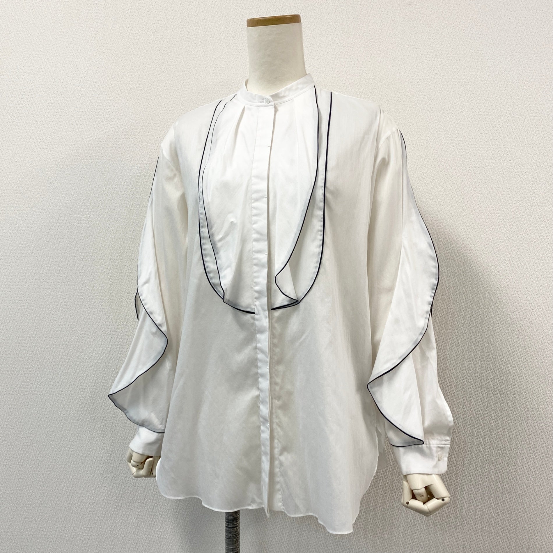 54g10 《美品》 Drawer ドゥロワー バンドカラー パイピング 比翼 長袖シャツ 36 ホワイト コットンシルク ブラウス