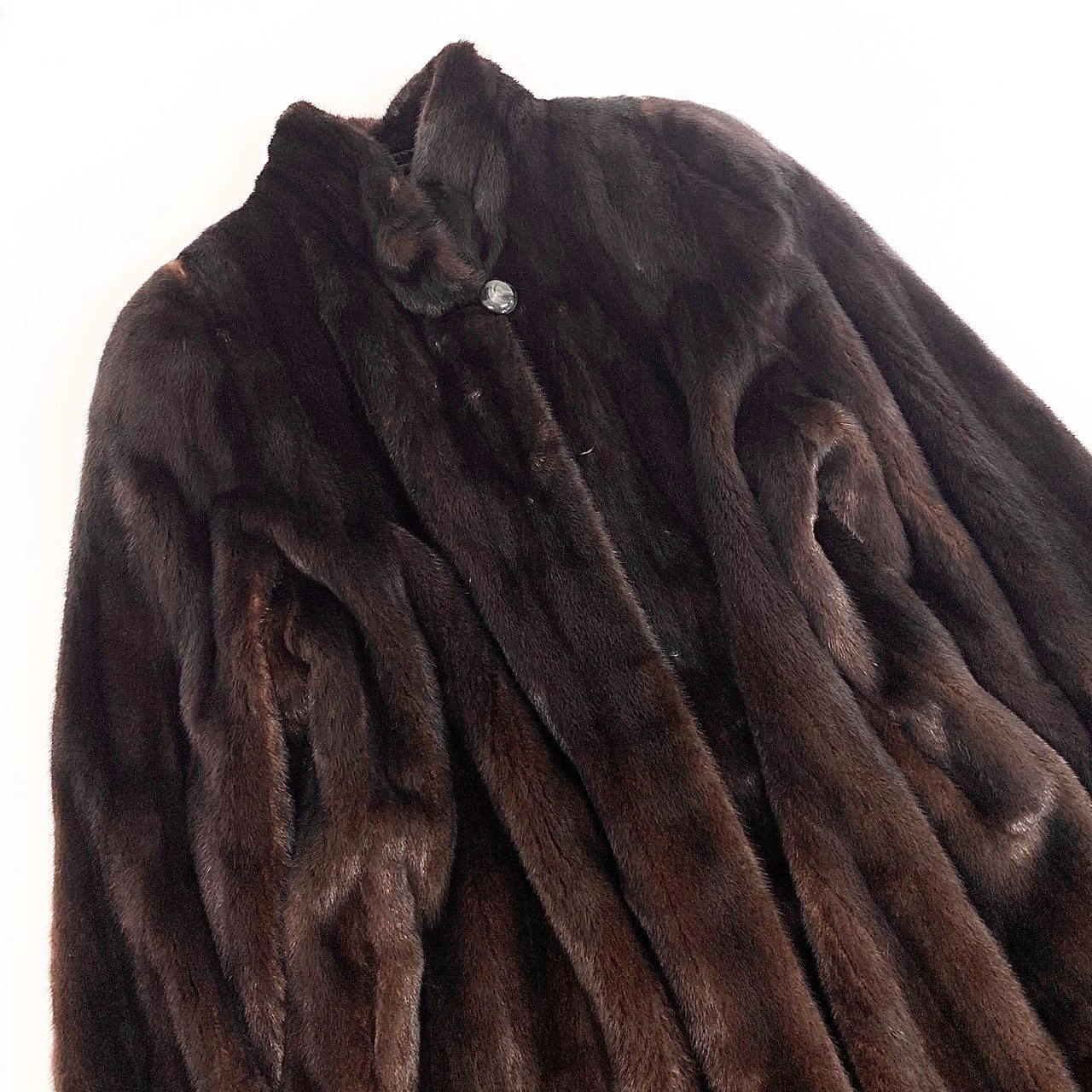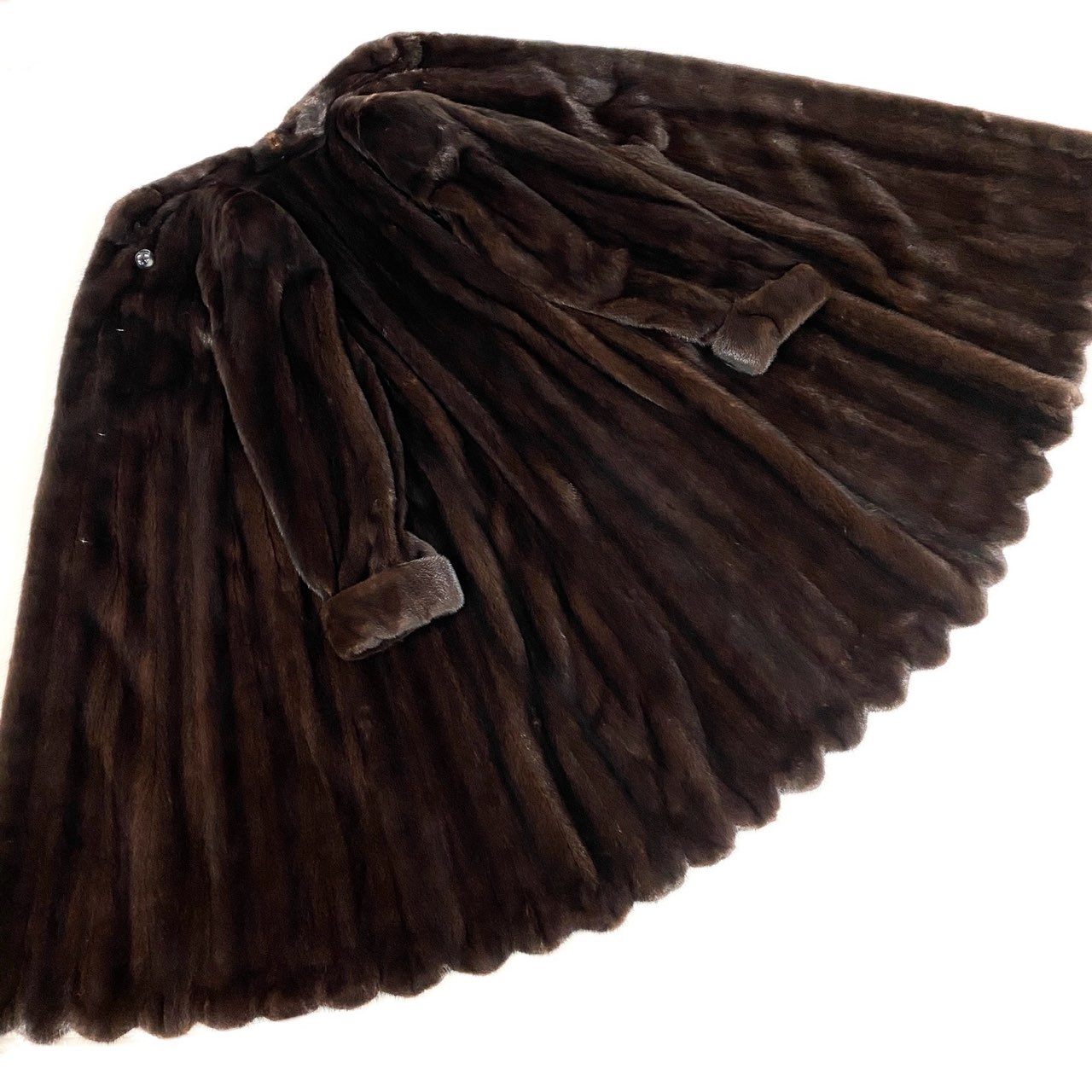 写真からは、深みのあるマホガニーブラウンのミンクファーが使用されており、自然な濃淡の縦ラインが美しい高級感を演出します。 毛足はなめらかで光沢があり、しっとりとした手触りが特徴の上質素材です。 裾のフリルラインが女性らしさを添え、シルエット全体がふんわり広がる上品なAラインに仕上がっています。 フロントには上品な装飾ボタンが付き、フォーマルドレスにもデイリーの冬アウターにも相性抜群。 特別なお出かけから普段のラグジュアリーな装いまで、幅広いシーンで存在感を放つ一着です。