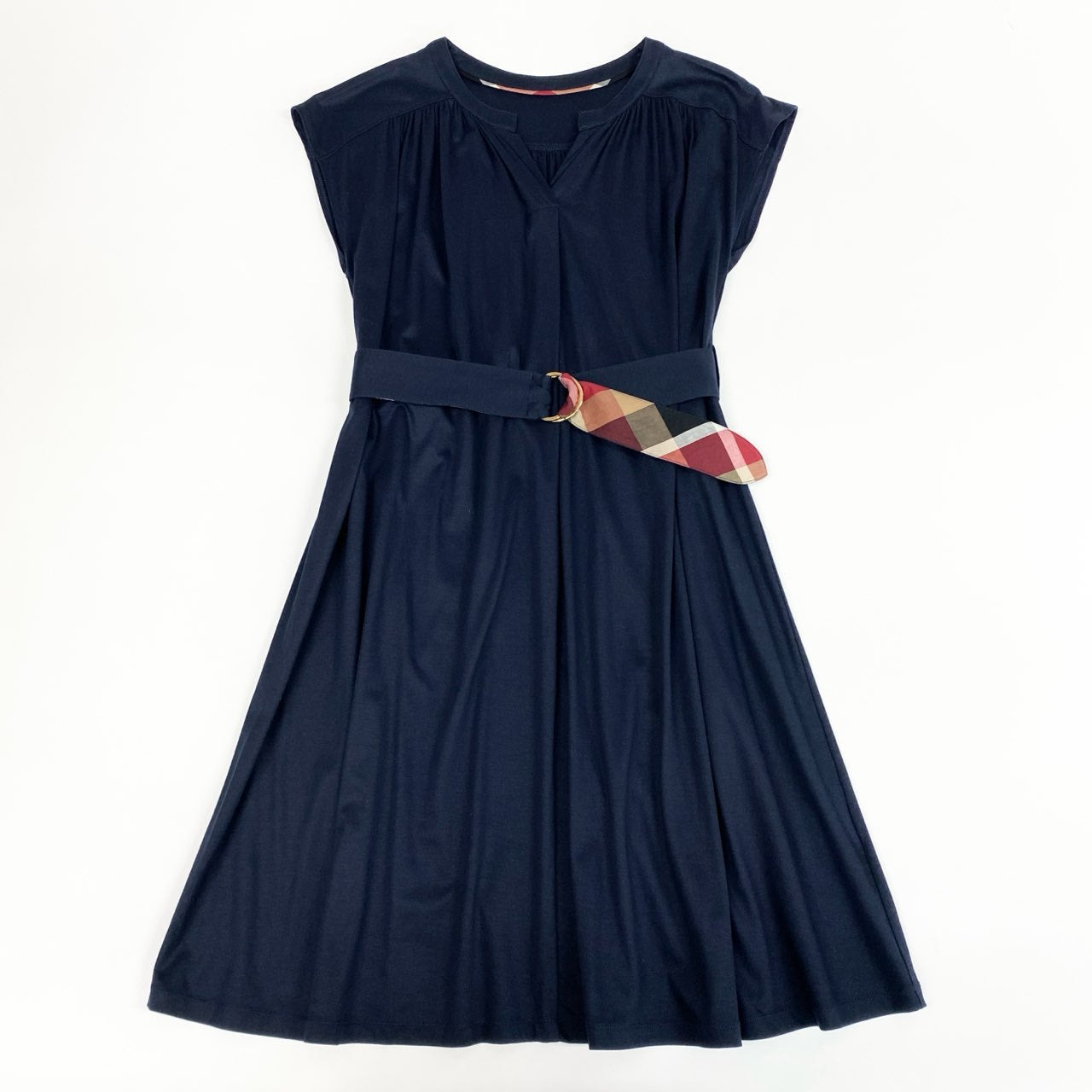 深みのあるミッドナイトネイビーのボディに、ブランド象徴のクレストブリッジチェック柄ベルトが映える上品なデザイン。 柔らかなストレッチジャージー素材が落ち感のあるドレープを生み、体型を美しく見せます。 フレンチスリーブとノーカラーのVネックラインが顔まわりをすっきりと見せ、知的な印象を演出。 通勤やランチ会などのきれいめカジュアルから、軽いフォーマルシーンまで対応する一枚です。