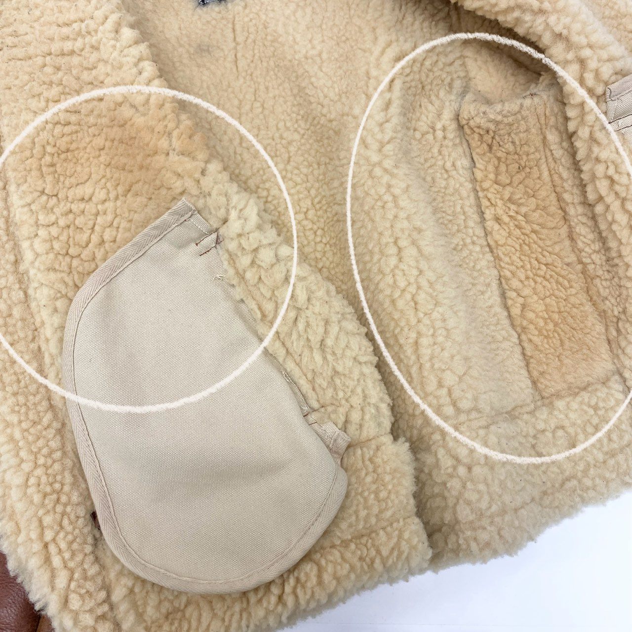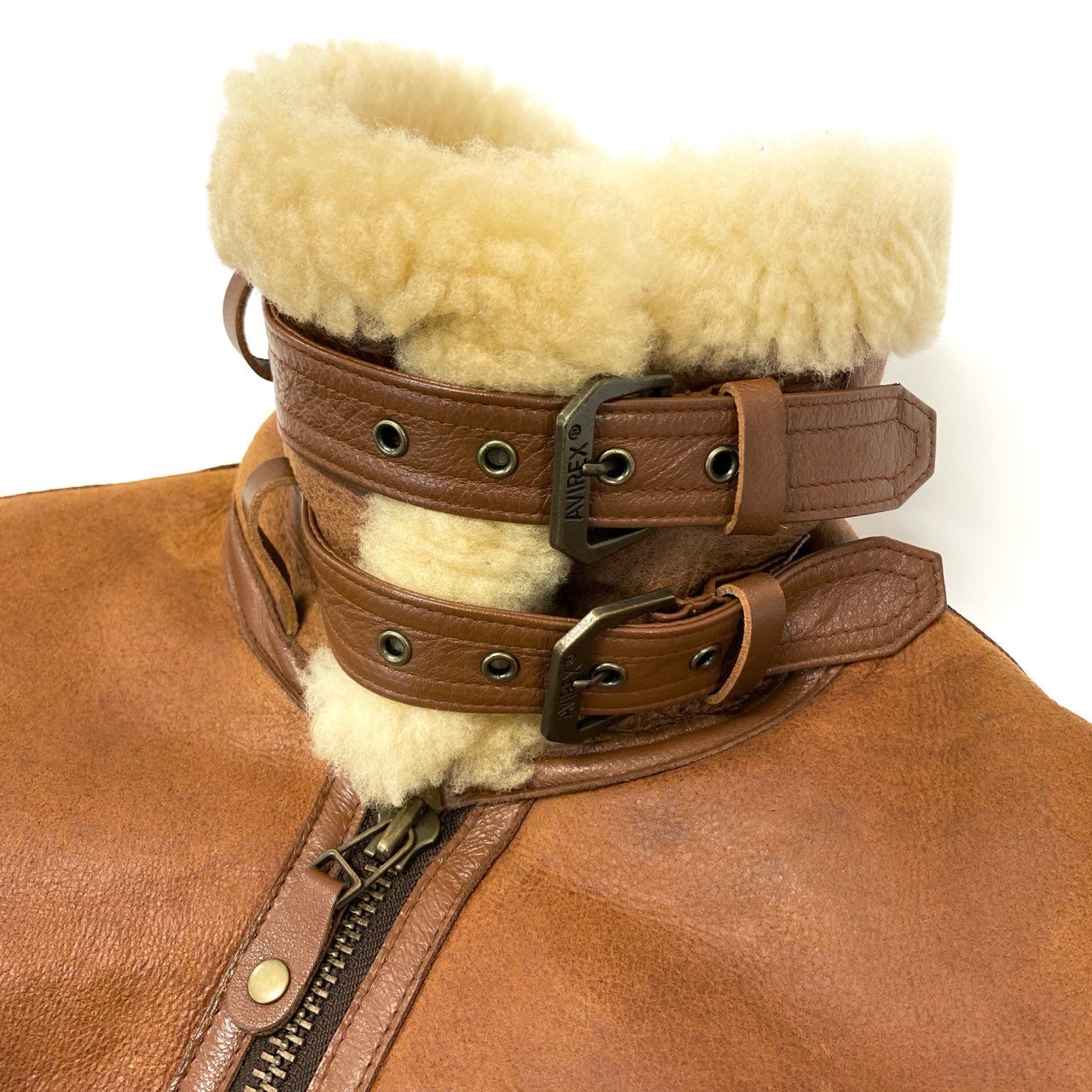 ヴィンテージ感あふれるブラウンムートンに、背面のピンナップガール&星条旗モチーフのペイントデザインが映えるAVIREX(アヴィレックス)フライトジャケット/モデル6151094。ボア襟と袖口・裾のシープボアが暖かさをキープし、存在感のあるバックアートが唯一無二のスタイルを演出します。厚手のレザーとリアルムートンの質感が重厚で、ミリタリー×アメカジの王道を体現する一着です。