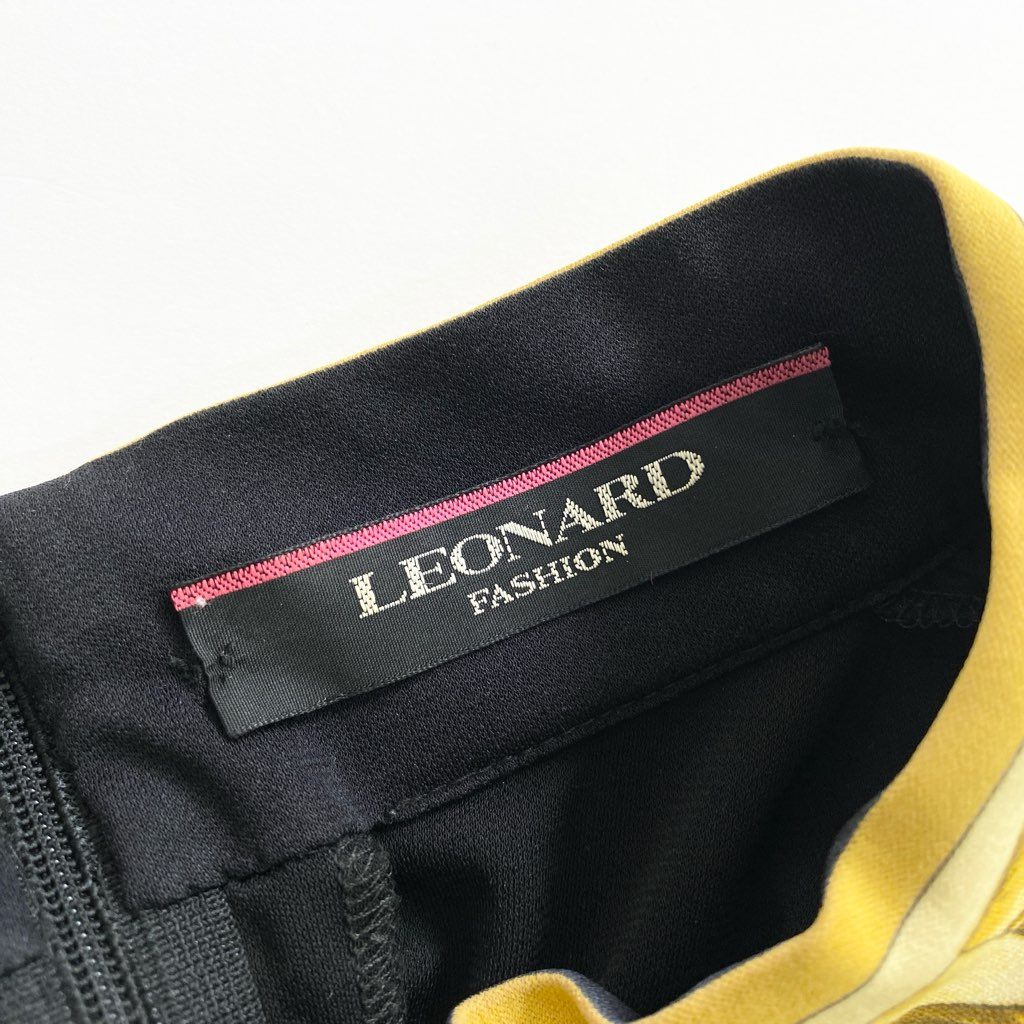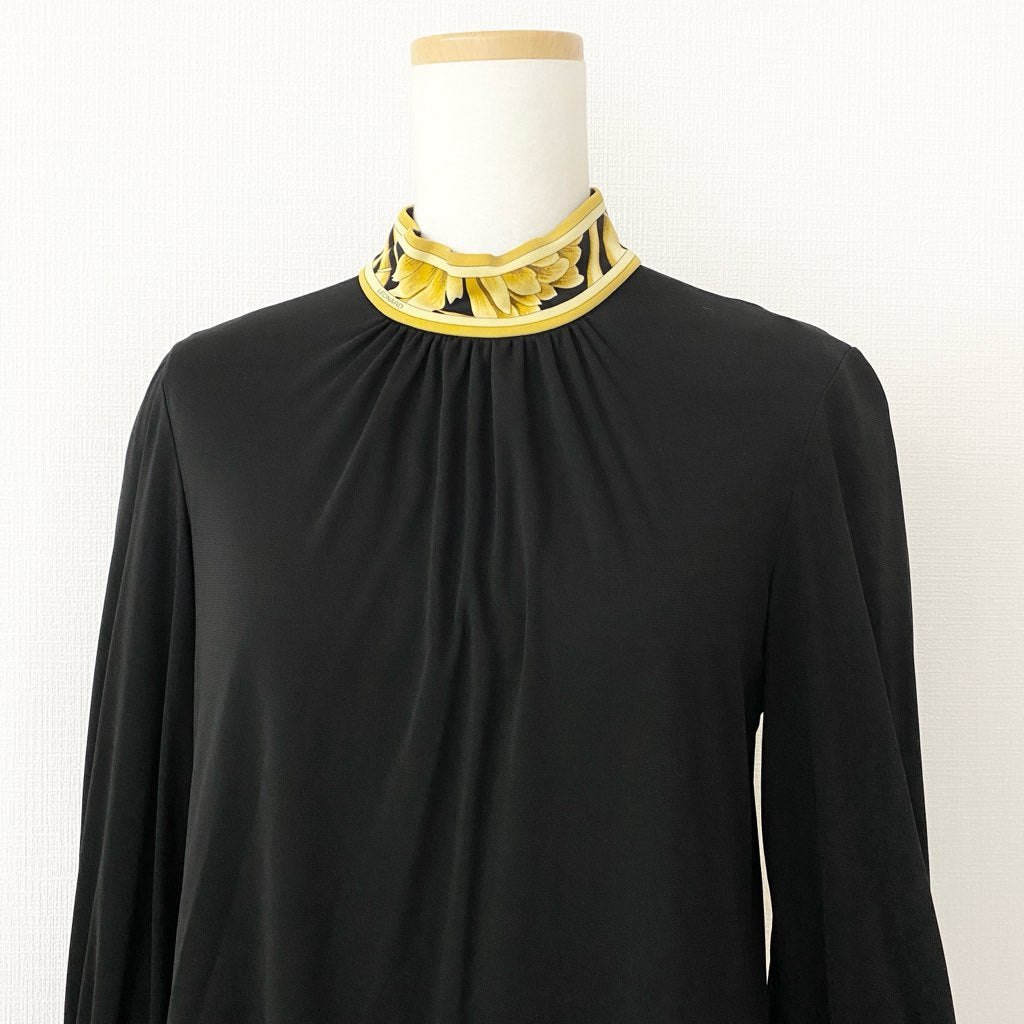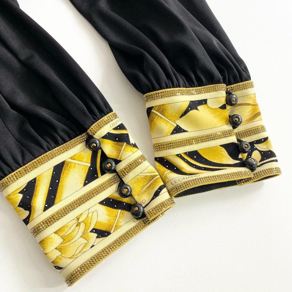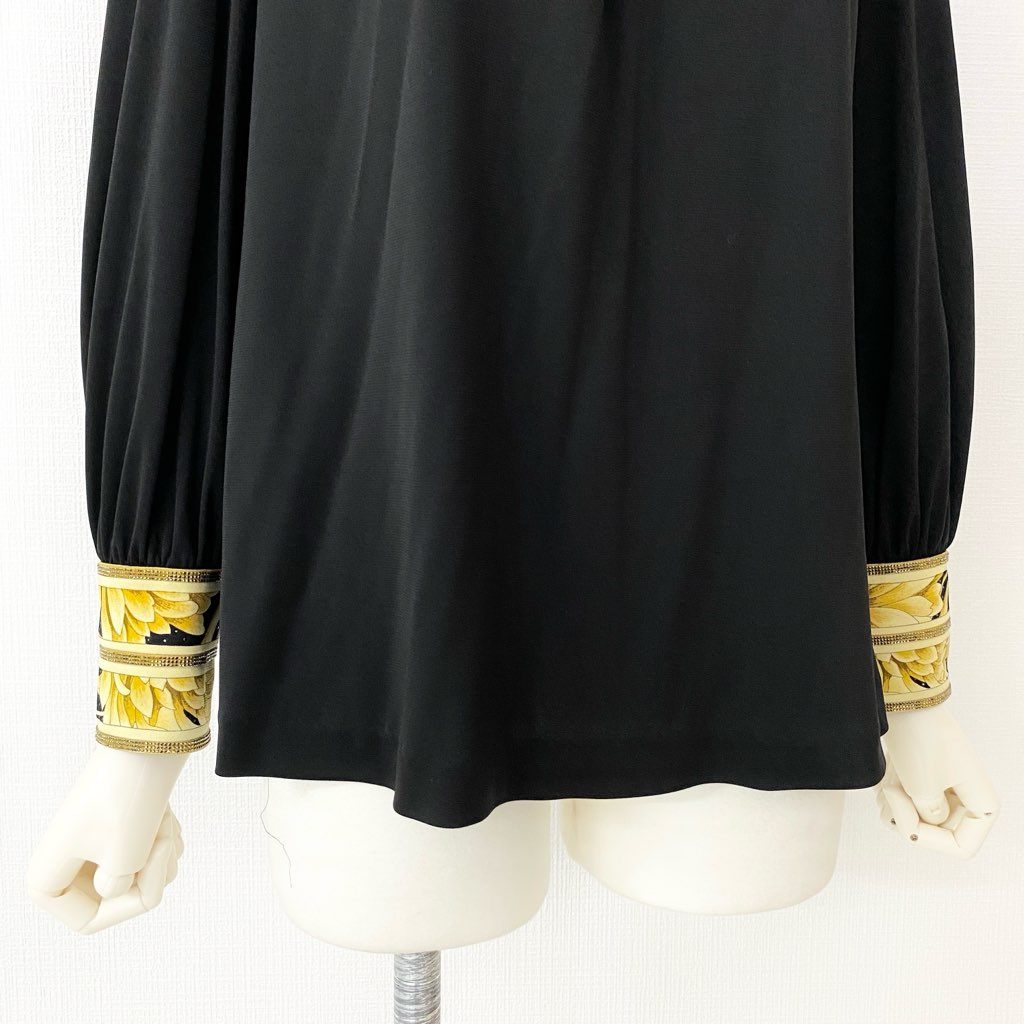 34d10 《美品》 LEONARD レオナール カンカン素材 ハイネック 長袖Tシャツ カットソー トップス ラインストーン装飾 花柄プリント切替 サイズM ブラック レディース 日本製