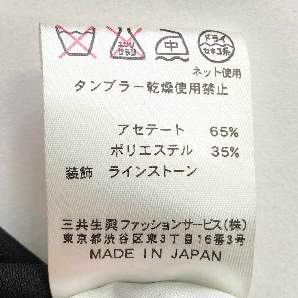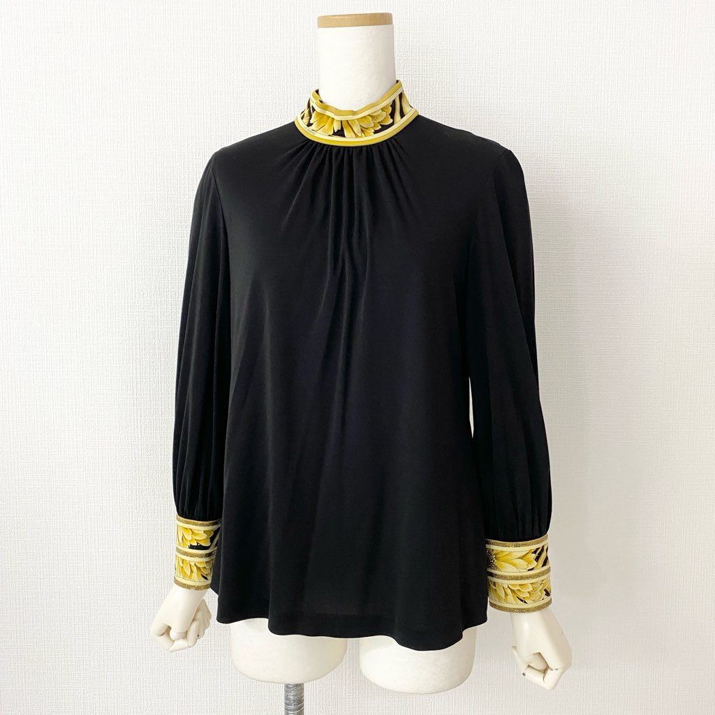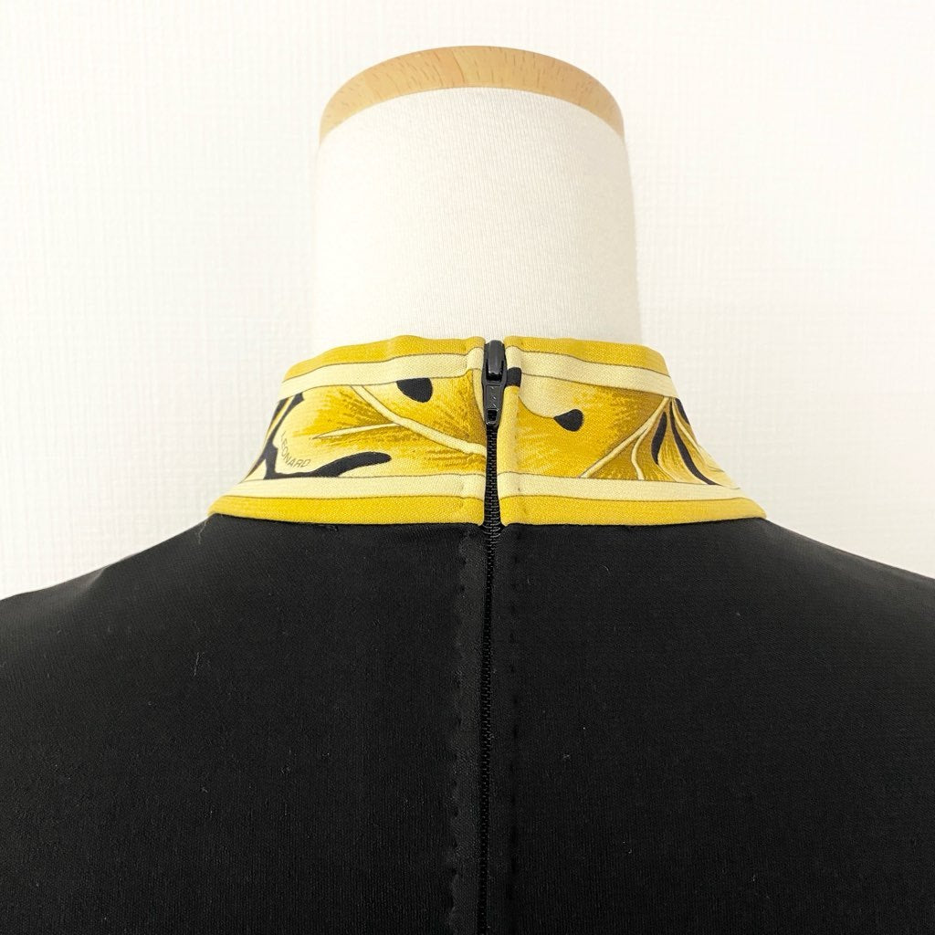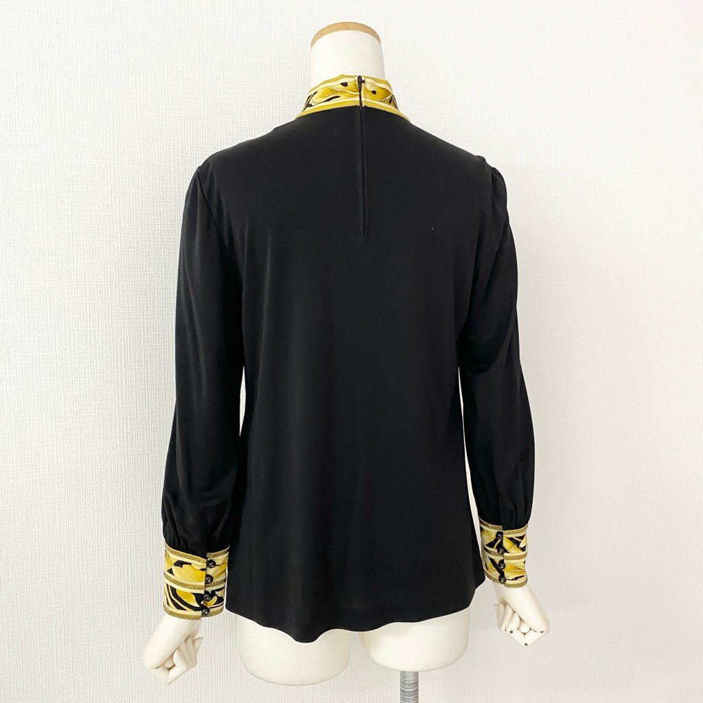 34d10 《美品》 LEONARD レオナール カンカン素材 ハイネック 長袖Tシャツ カットソー トップス ラインストーン装飾 花柄プリント切替 サイズM ブラック レディース 日本製