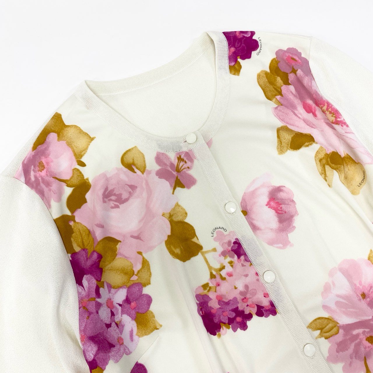 38k16 LEONARD レオナール カーディガン カンカン素材 花柄 日本製 0157201 42サイズ アイボリー マルチカラー レディースu02t