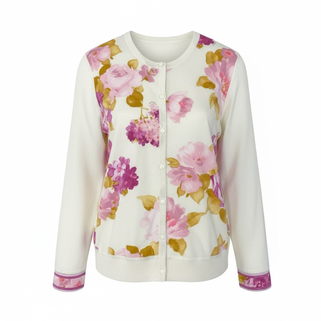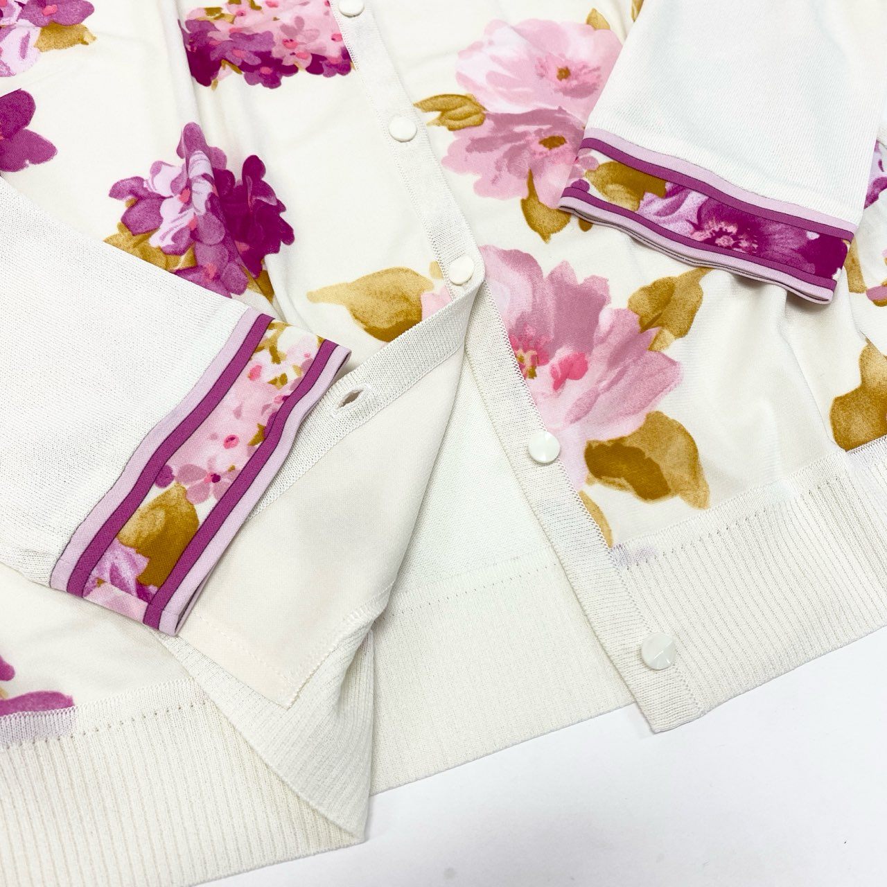 優しい オフホワイト をベースに、ピンク〜パープル系の華やかな フラワープリント を大胆に配したLEONARDらしい上品なカーディガンです。 前身頃は滑らかなジャージー素材で着心地が軽く、袖口のパープルラインがさりげないアクセントになっています。 腰までしっかり隠れる丈感で、パンツにもスカートにも合わせやすい万能デザイン。 春先から秋口までロングシーズン活躍し、1枚羽織るだけで華やかなスタイリングが完成します。 デイリーはもちろん、お食事会や旅行などのきれいめシーンにもおすすめのアイテムです。