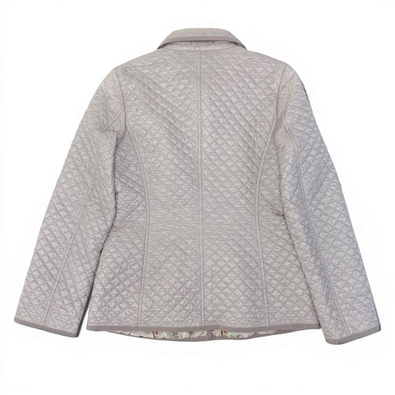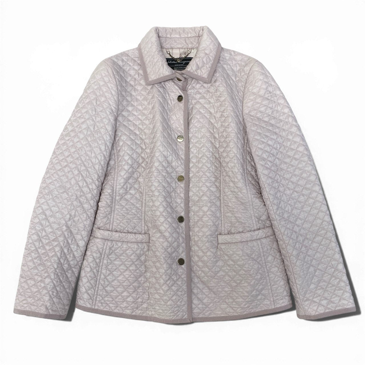 上品なライトグレーベージュ系カラーが魅力の、サルヴァトーレ・フェラガモのキルティングジャケットです。表地はマットな質感で落ち着きがあり、裏地にはシルクの総柄プリントを贅沢に使用。さりげなく見える内側のデザインまでこだわった、ラグジュアリー感のある一着です。デイリーからきれいめなお出かけまで、幅広いシーンで活躍します。