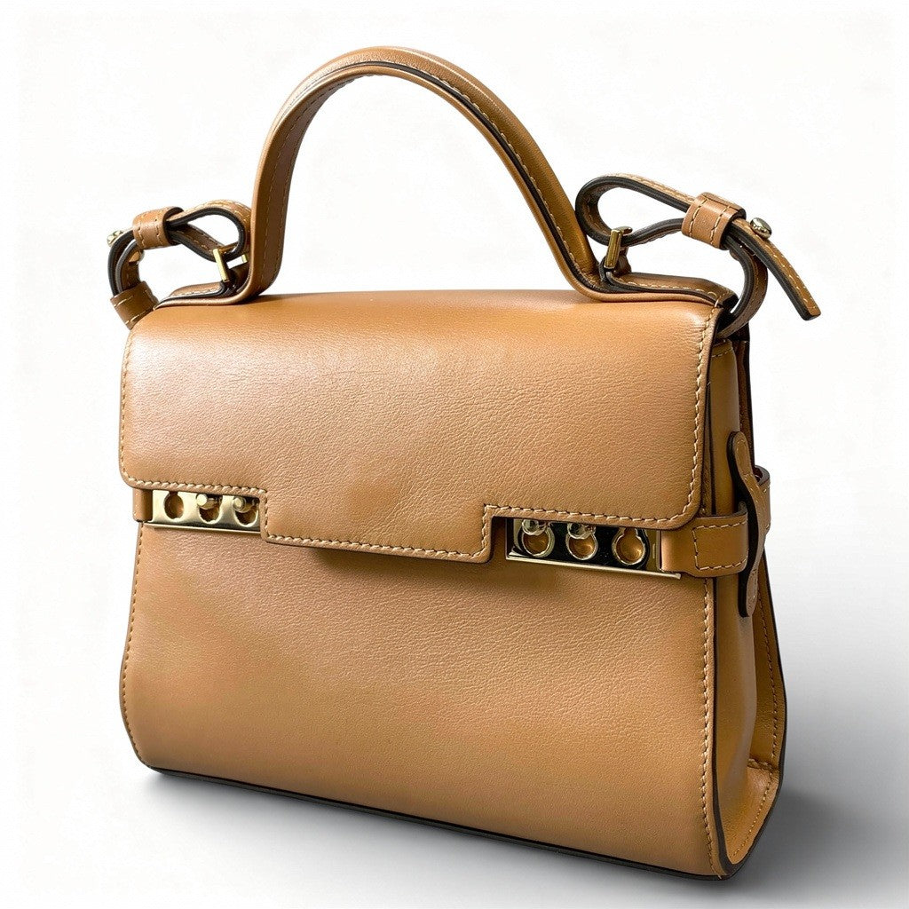 DELVAUXの名作「タンペートPM」は、洗練されたキャメルブラウン系カラーが魅力の2wayショルダーバッグです。 写真からは、滑らかで上質なマットレザーと、フロントにあしらわれたゴールドトーンのメタル金具ディテールが確認できます。 無地デザインで主張しすぎず、上品なクラシックスタイルを演出。 普段のお出かけはもちろん、ワンピースやきれいめコーデに合わせたセミフォーマルシーンにもおすすめの逸品です。
