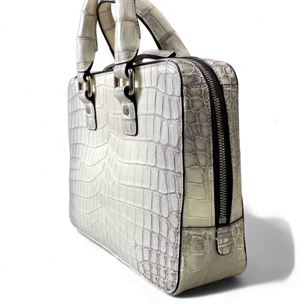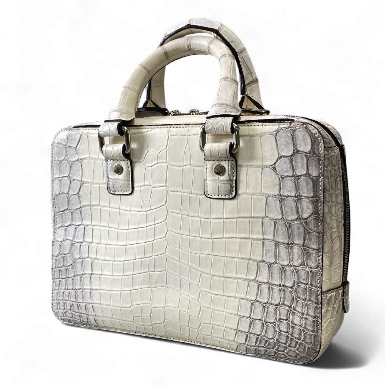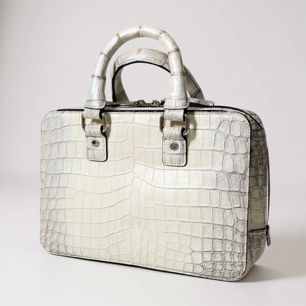 池田工芸ならではの上質なクロコダイルレザーを使用した、圧倒的存在感を誇るメンズブリーフケースです。色味は写真の通り、淡い光沢を放つパールグレーホワイト系で、腑模様の立体感が美しく際立っています。無駄のないスクエアフォルムと重厚なハンドル金具が高級感を演出し、コンパクトながら確かな収納力を備えた実用性の高い設計です。ビジネスシーンはもちろん、ドレススタイルにもマッチし、持つだけで品格を高めてくれる逸品です。プレゼントや特別な日のバッグとしてもおすすめです。