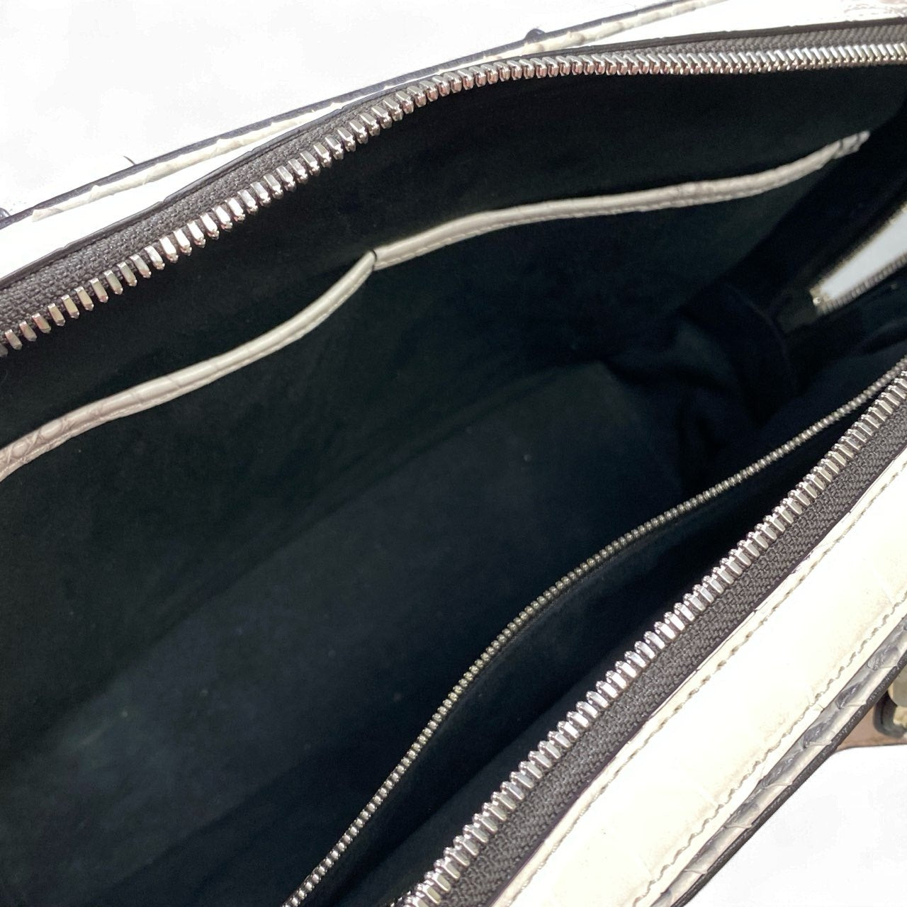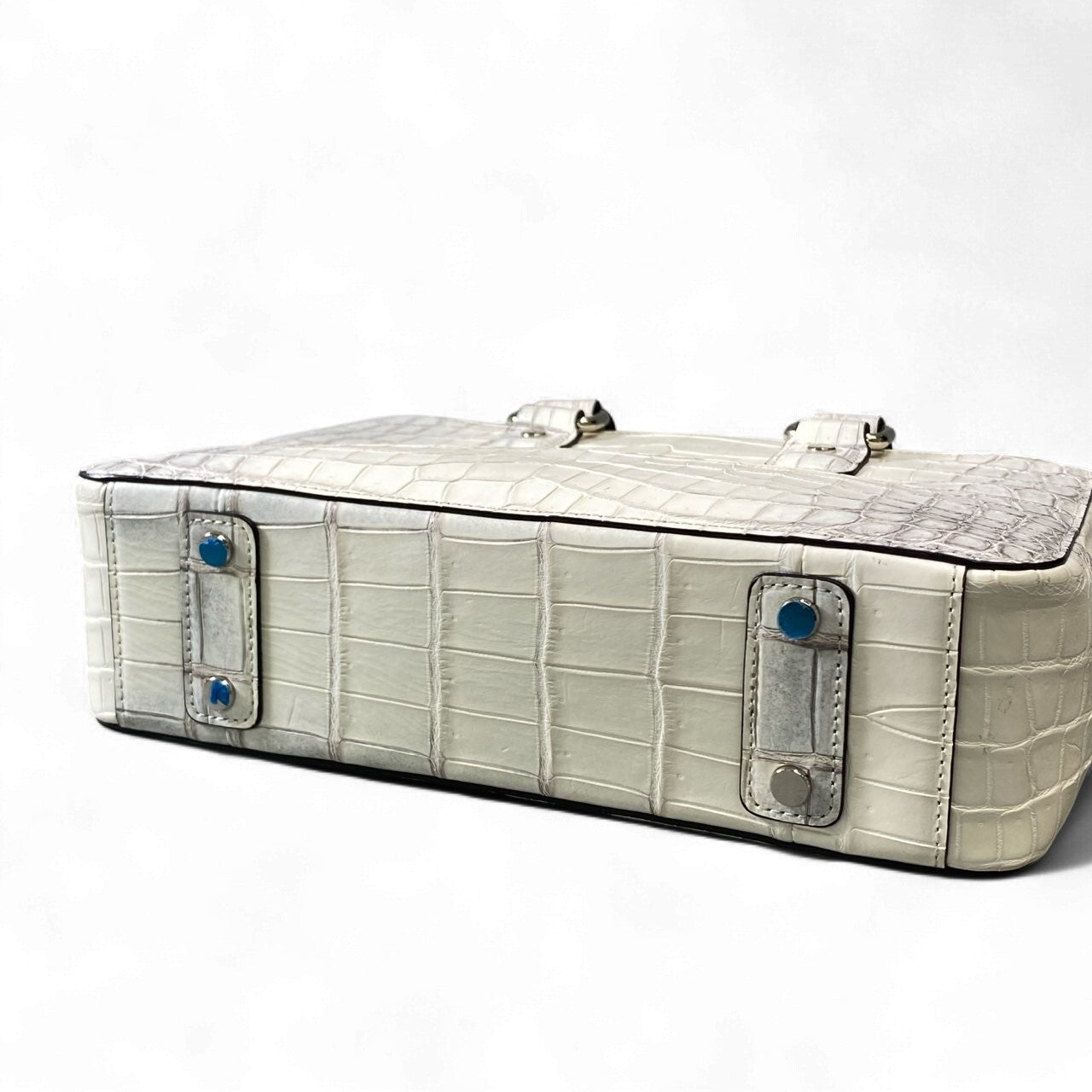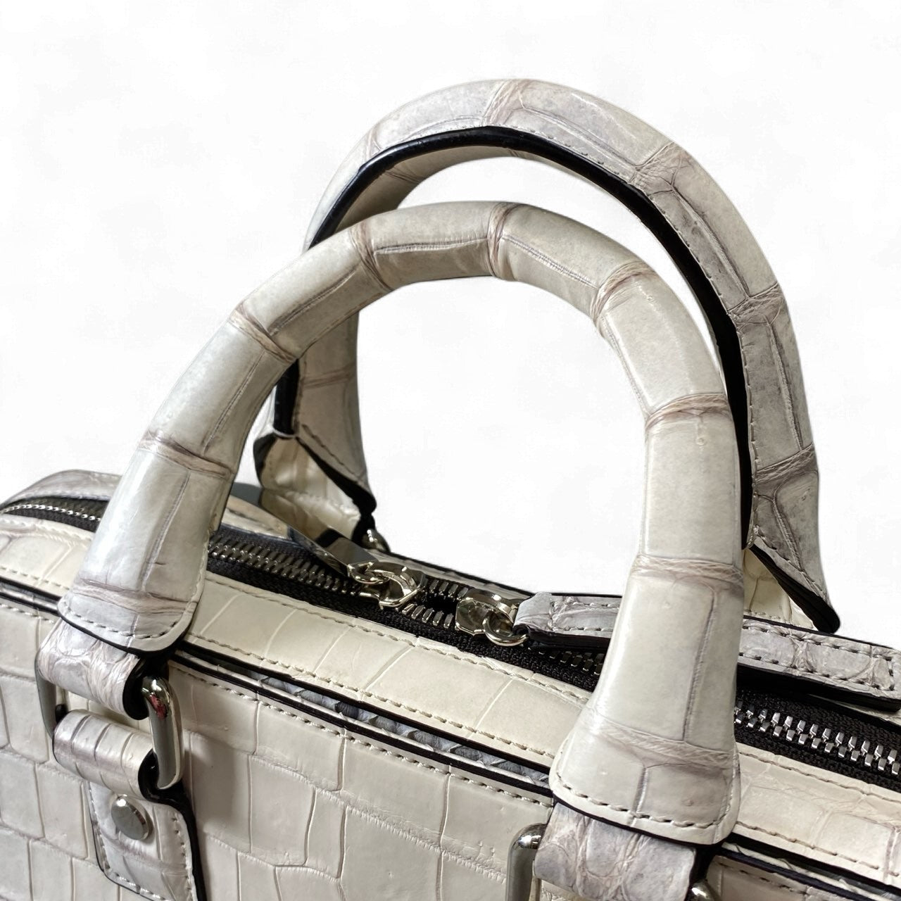 池田工芸ならではの上質なクロコダイルレザーを使用した、圧倒的存在感を誇るメンズブリーフケースです。色味は写真の通り、淡い光沢を放つパールグレーホワイト系で、腑模様の立体感が美しく際立っています。無駄のないスクエアフォルムと重厚なハンドル金具が高級感を演出し、コンパクトながら確かな収納力を備えた実用性の高い設計です。ビジネスシーンはもちろん、ドレススタイルにもマッチし、持つだけで品格を高めてくれる逸品です。プレゼントや特別な日のバッグとしてもおすすめです。