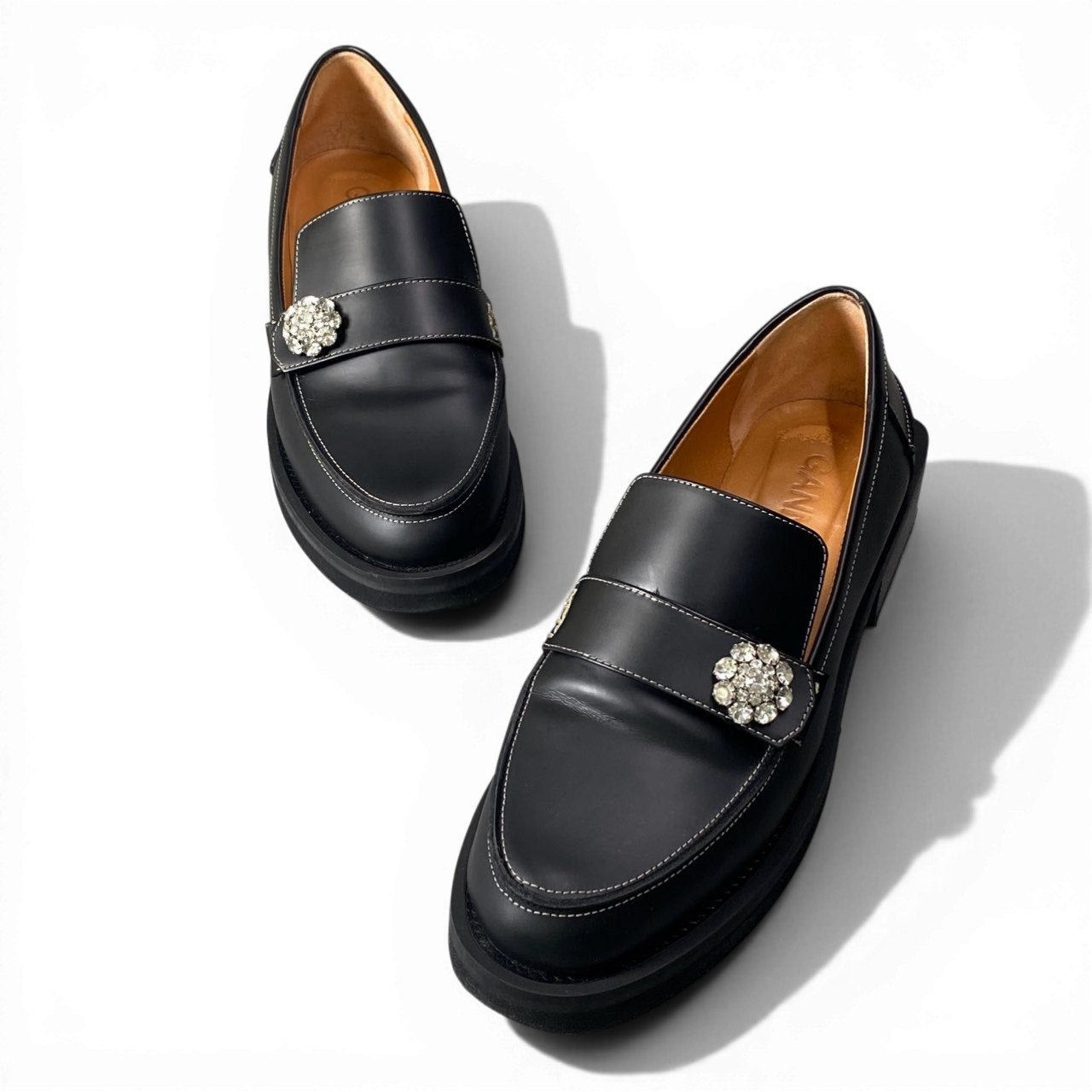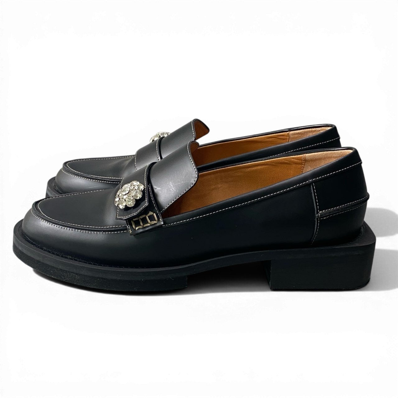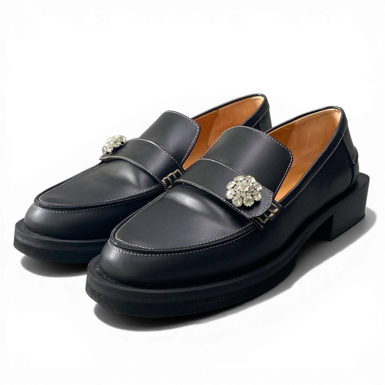 1c23 GANNI ガニ― クリスタルボタン付き レザーローファー ビジュー 革靴 フラットシューズ レディース 女性用 40 ブラックu02t