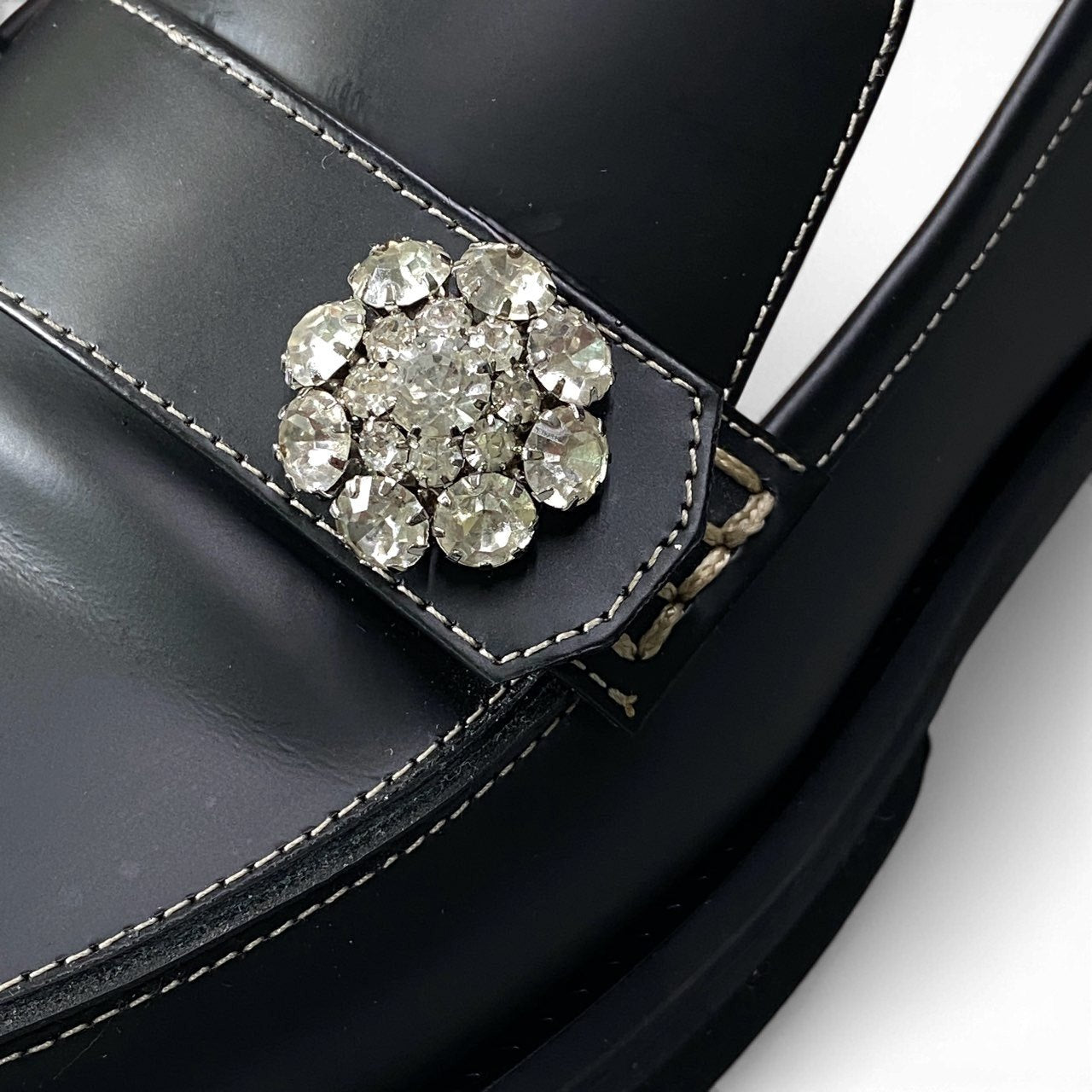 光沢のあるブラックレザーに、クリスタル装飾が映えるエレガントなローファーです。 フロントのビジュー付きストラップが華やかなアクセントとなり、シンプルながら存在感のあるデザインです。 程よい厚みのソールと低めヒールで、履き心地とスタイルアップを両立しています。 カジュアルからきれいめコーデまで幅広く活躍し、デイリーからお出かけまで使いやすい一足です。