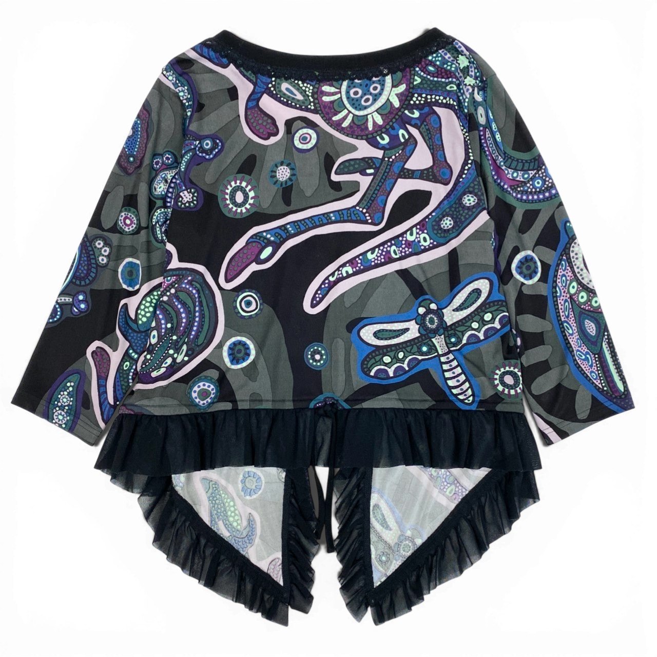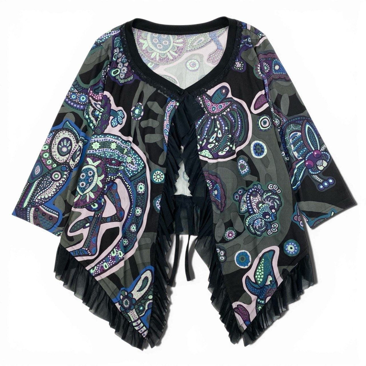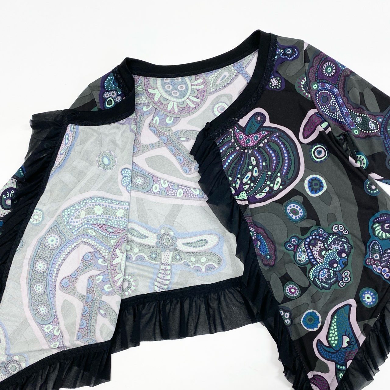 カーキグリーンをベースに、パープルやブルーを効かせた総柄プリントが印象的なカーディガンです。 ペイズリー調やオリエンタルモチーフがミックスされたアート性の高いデザイン。 裾にはブラックのチュールフリルがあしらわれ、軽やかで動きのあるシルエットを演出します。 シンプルなインナーに羽織るだけで主役になる、トクコらしい個性が光る一着です。