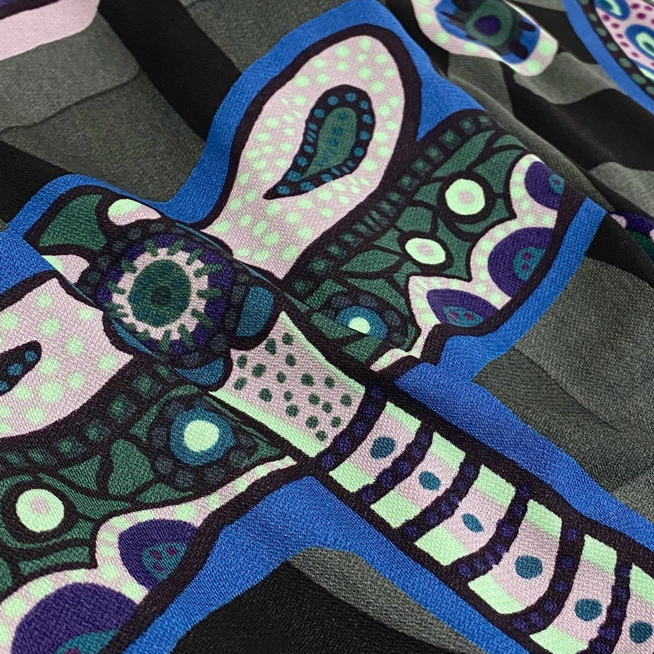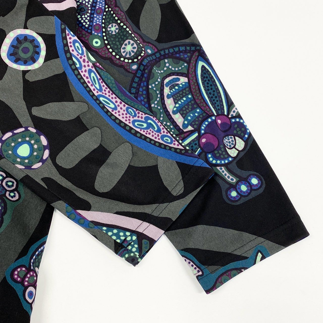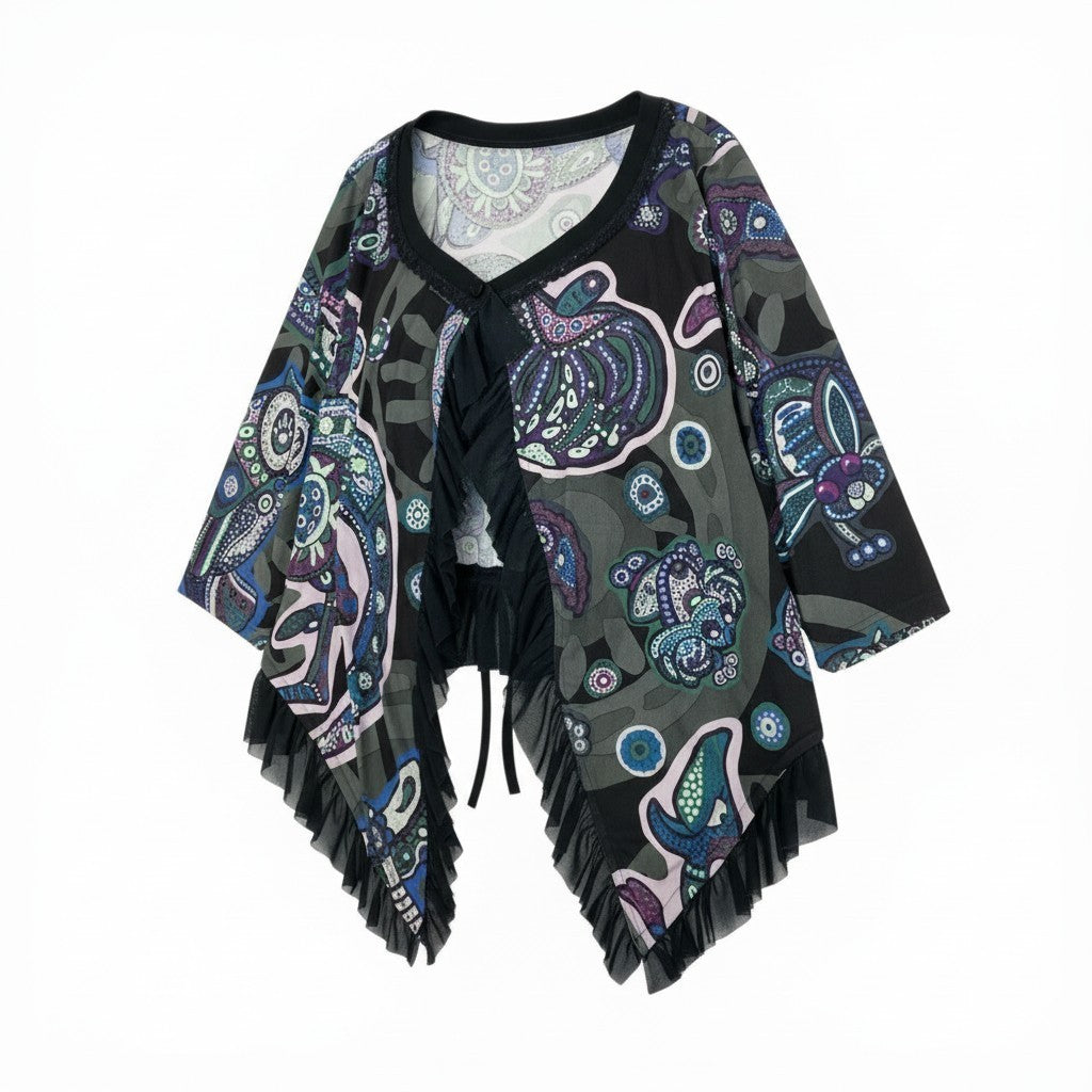 カーキグリーンをベースに、パープルやブルーを効かせた総柄プリントが印象的なカーディガンです。 ペイズリー調やオリエンタルモチーフがミックスされたアート性の高いデザイン。 裾にはブラックのチュールフリルがあしらわれ、軽やかで動きのあるシルエットを演出します。 シンプルなインナーに羽織るだけで主役になる、トクコらしい個性が光る一着です。