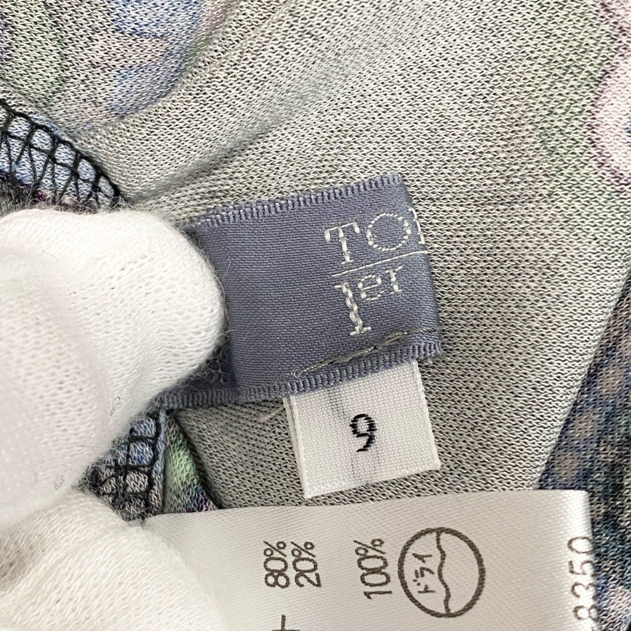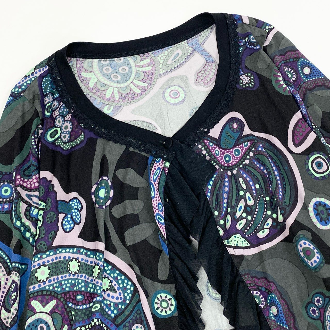 51b27 【美品】 TOKUKO 1er VOLトクコプルミエヴォル ロングスリーブ カーディガン トップス 七分袖 フリル 総柄プリント レディース 女性服 サイズ9 マルチカラーu02t