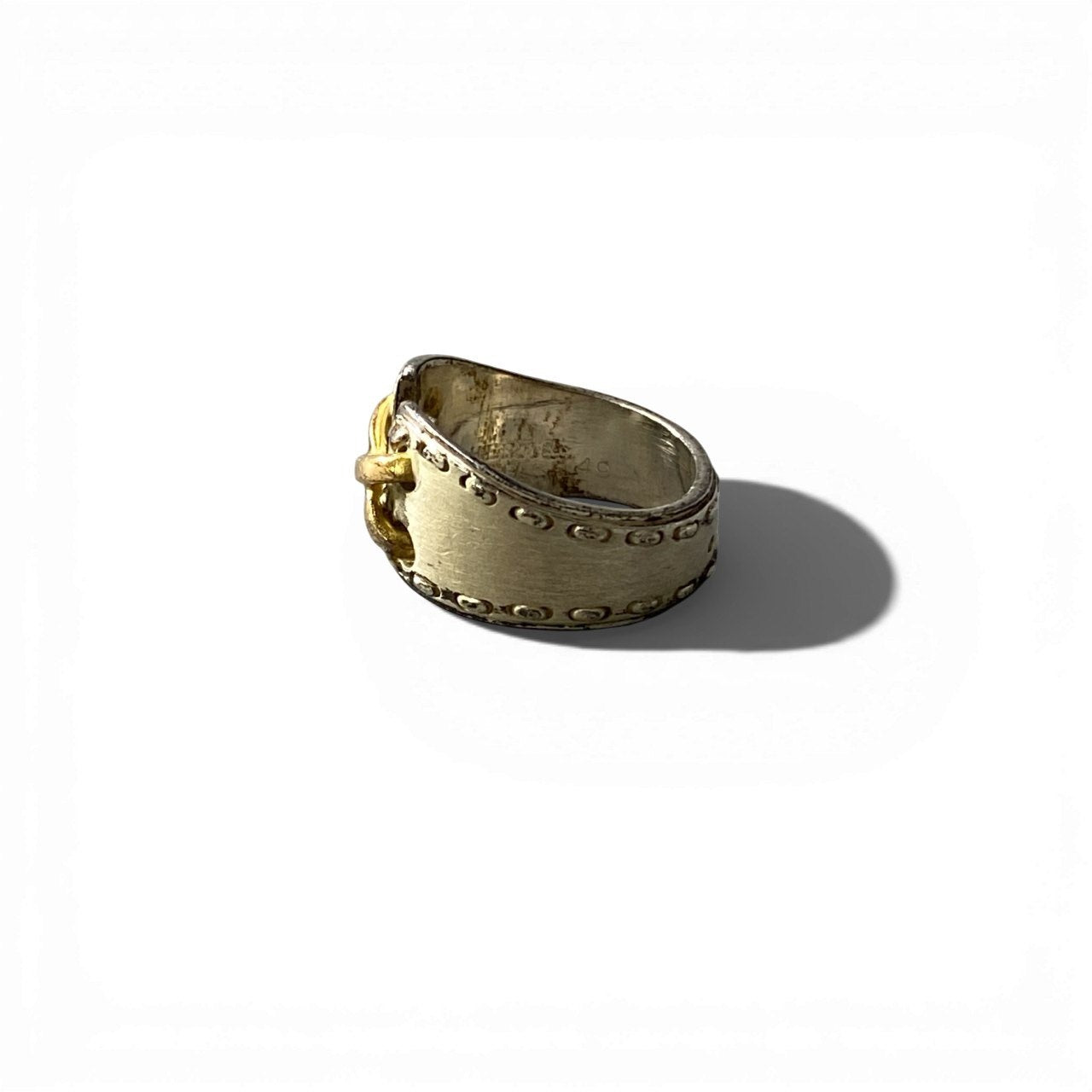 エルメスらしい重厚感とクラフト感が際立つ、メキシコリングです。 シルバー925をベースにK18ゴールドを組み合わせたコンビデザインで、立体的なモチーフが印象的。 マット寄りのシルバーにゴールドのコントラストが映え、手元に上品な存在感を与えます。 シンプルな装いに一点投入するだけで、洗練されたヴィンテージムードを演出できるアクセサリーです。