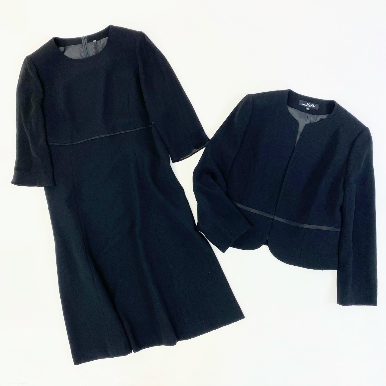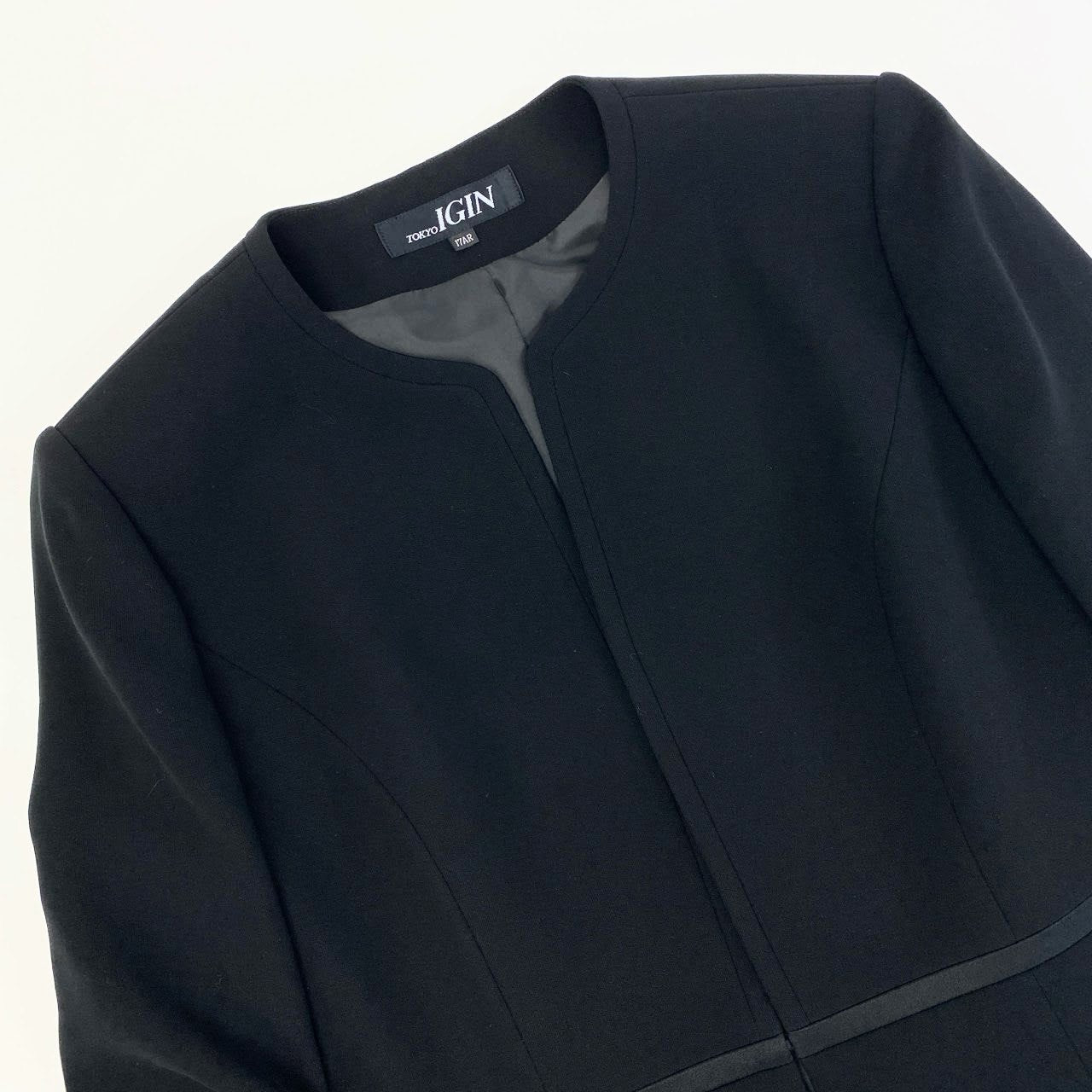 東京イギンのフォーマル用ワンピース&ジャケットセットアップ。深みのあるブラックカラーが凛とした印象を与え、光沢を抑えたマットなウール混素材で上質感を演出します。ワンピースは高めのウエスト切り替えでスタイルアップ効果があり、ジャケットはノーカラーで顔まわりをすっきり見せるデザイン。礼服として葬儀・法要はもちろん、卒入学式や式典にも幅広く活躍する一着です。