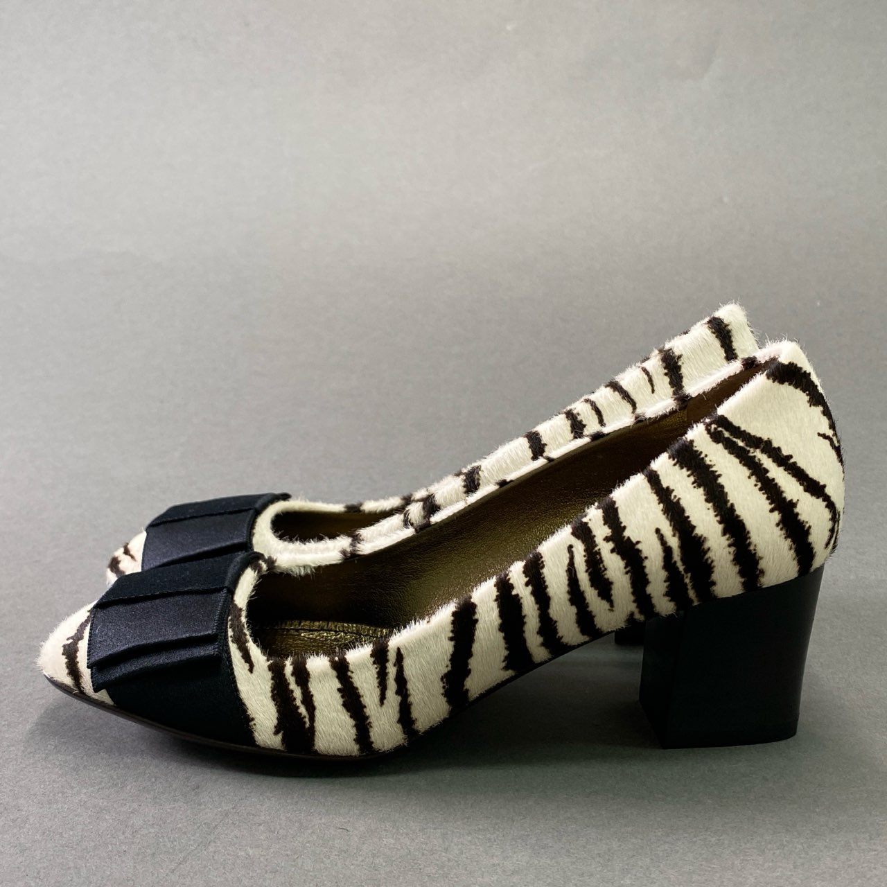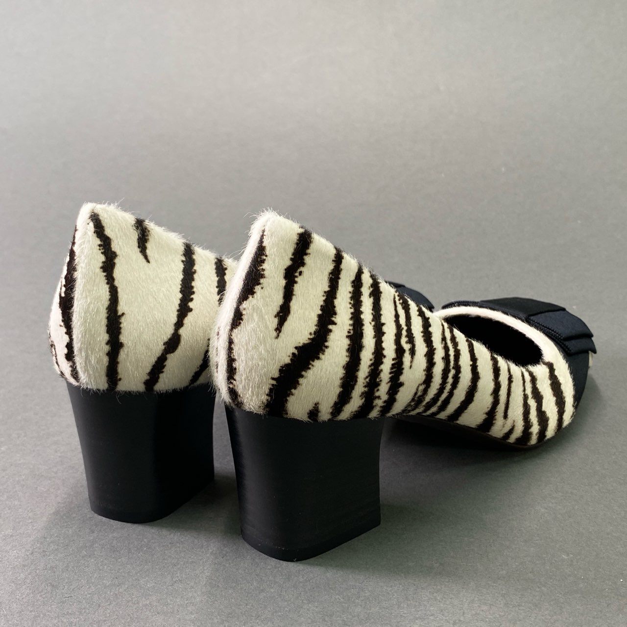 1f23 《未使用》 LANVIN ランバン ハラコ リボンパンプス 37 ホワイト ブラック レザー シューズ 箱付き