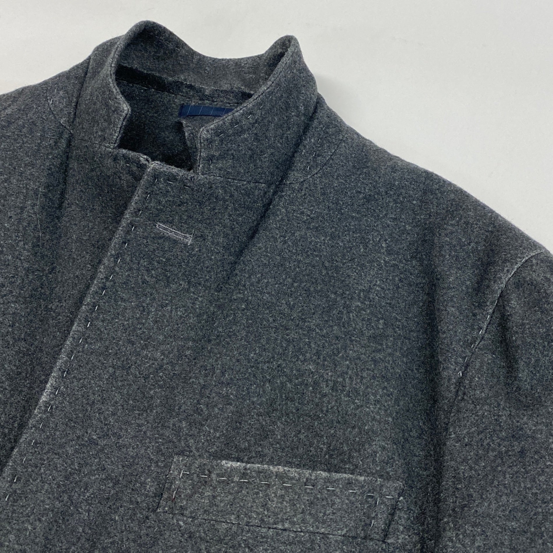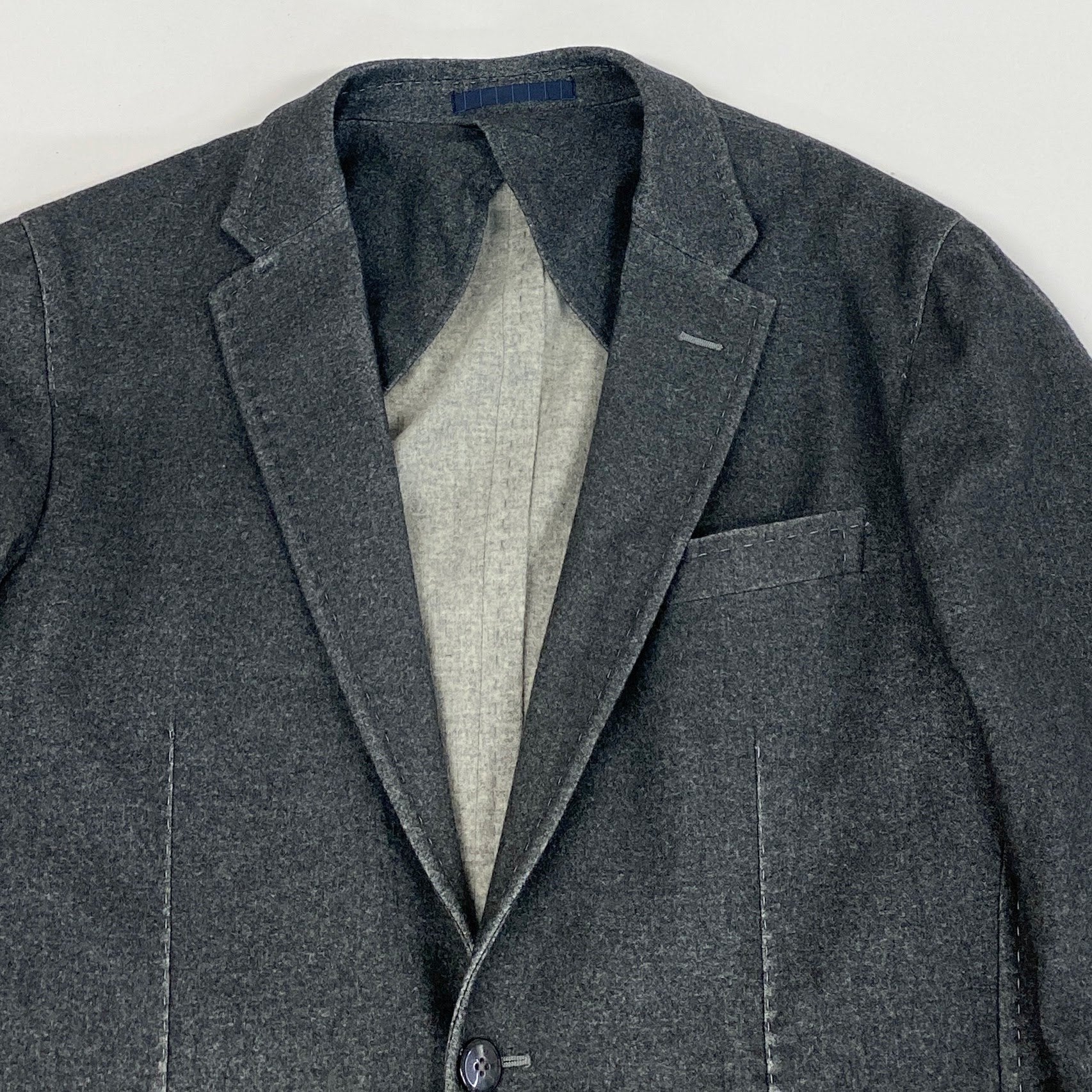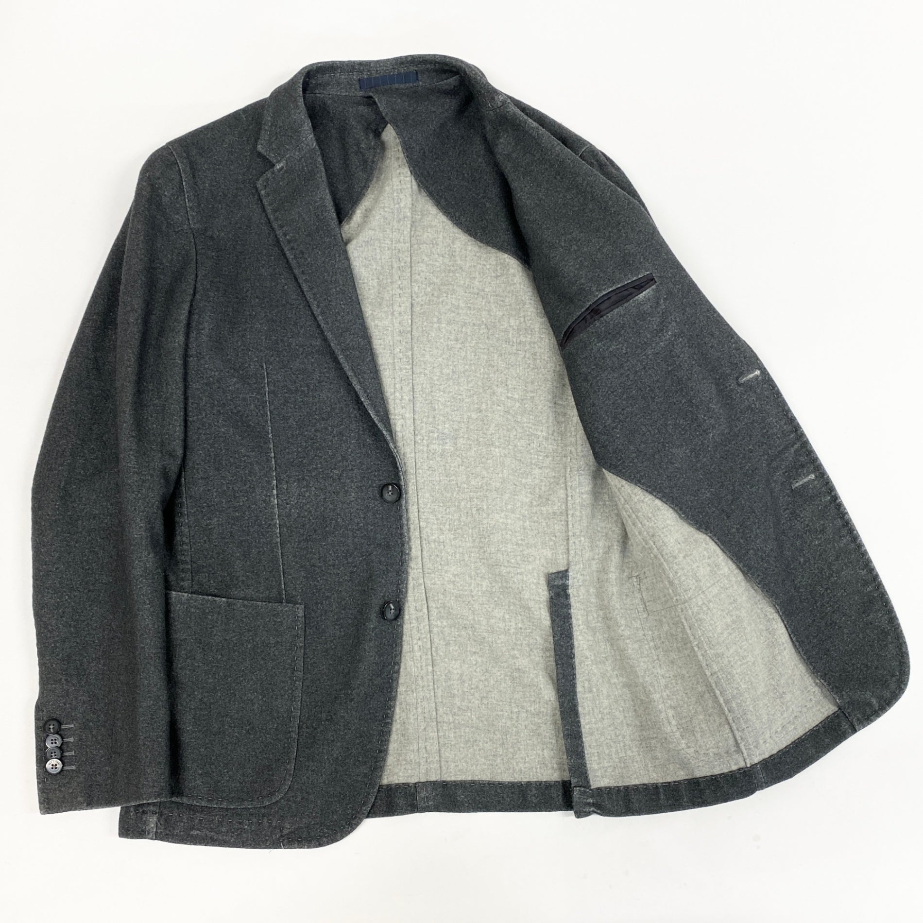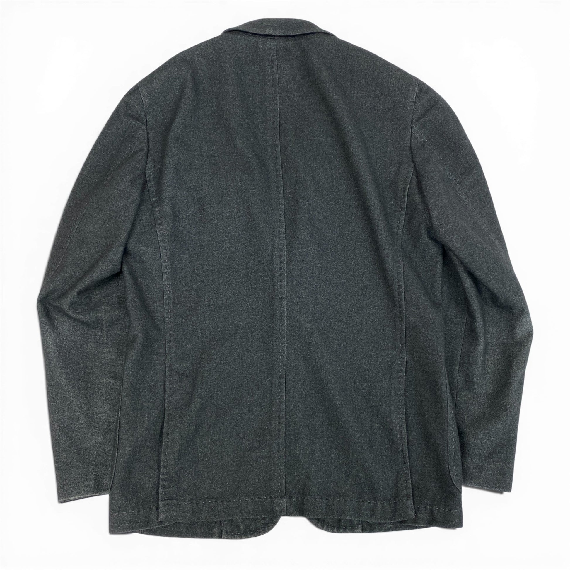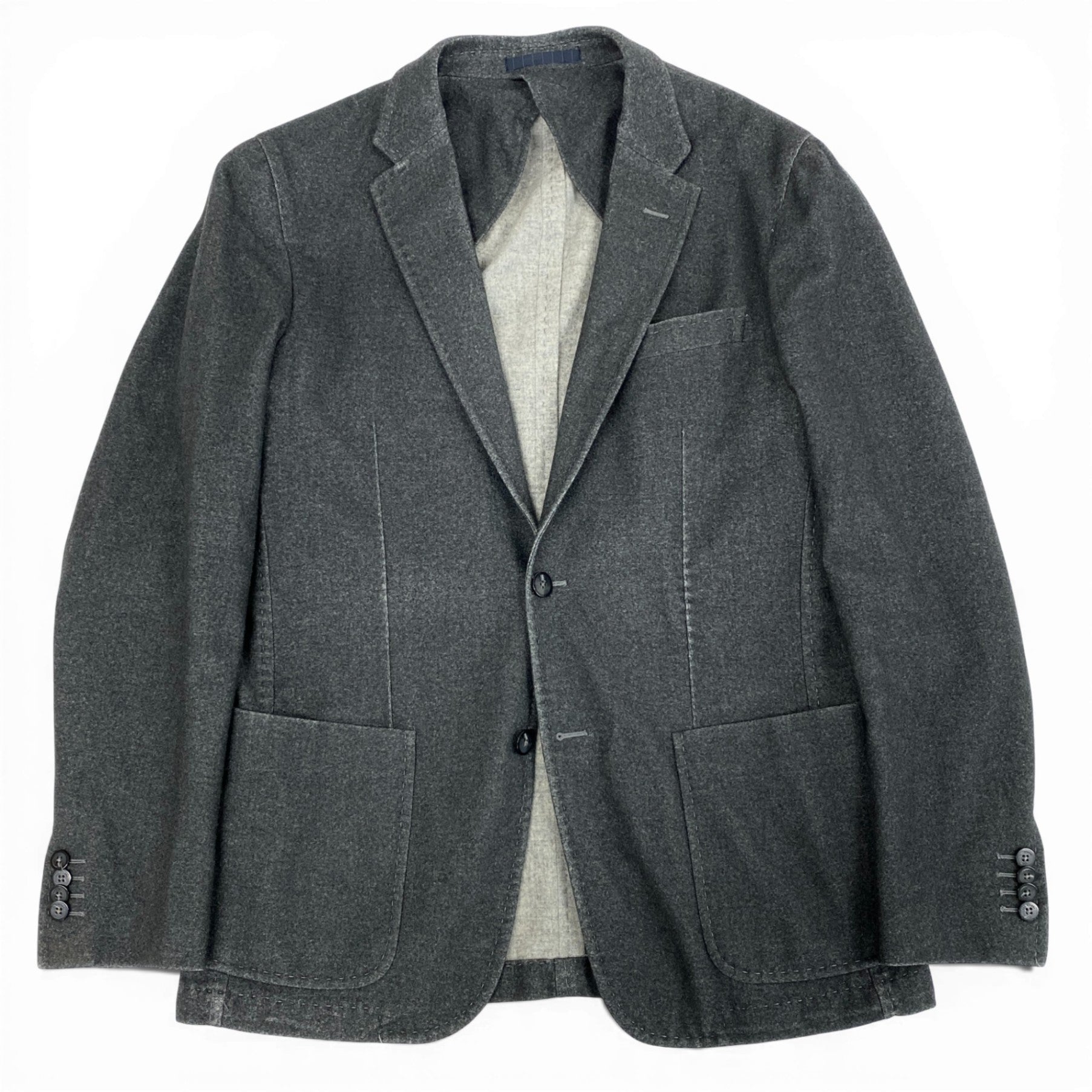 落ち着いたチャコールグレーの無地で、マットなウール系素材感が上品なテーラードジャケットです。2ボタン仕様、ノッチドラペル、パッチポケットなど程よくカジュアルなディテールが特徴。肩周りは構築的すぎず、自然なシルエットで日常使いしやすい一着です。オフィスカジュアルから休日のきれいめスタイルまで幅広く活躍します。